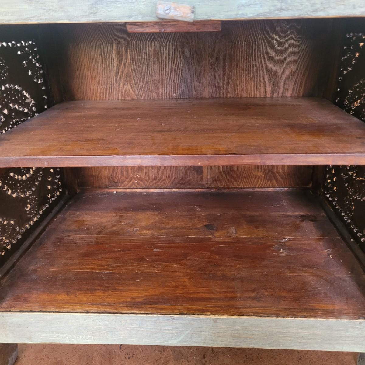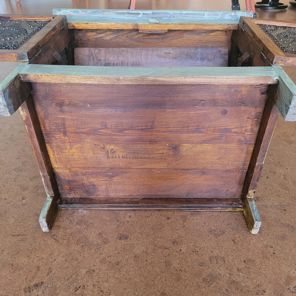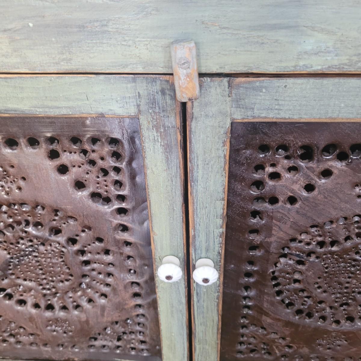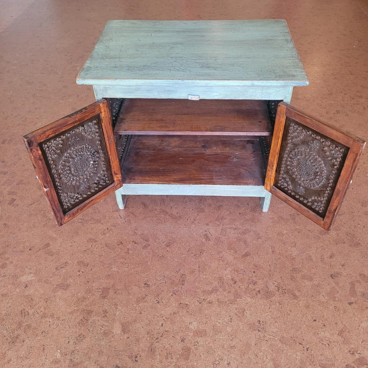 A small pie safe cabinet/end table. It is made from wood that has been distressed and punctured tin. The wood has been painted distressed green and the punctured tin features detailed pattern work. The table features two swinging doors with a wooden latch that open to a one shelf wooden interior. Item measures 26" x 18.5" x 22.5"H.