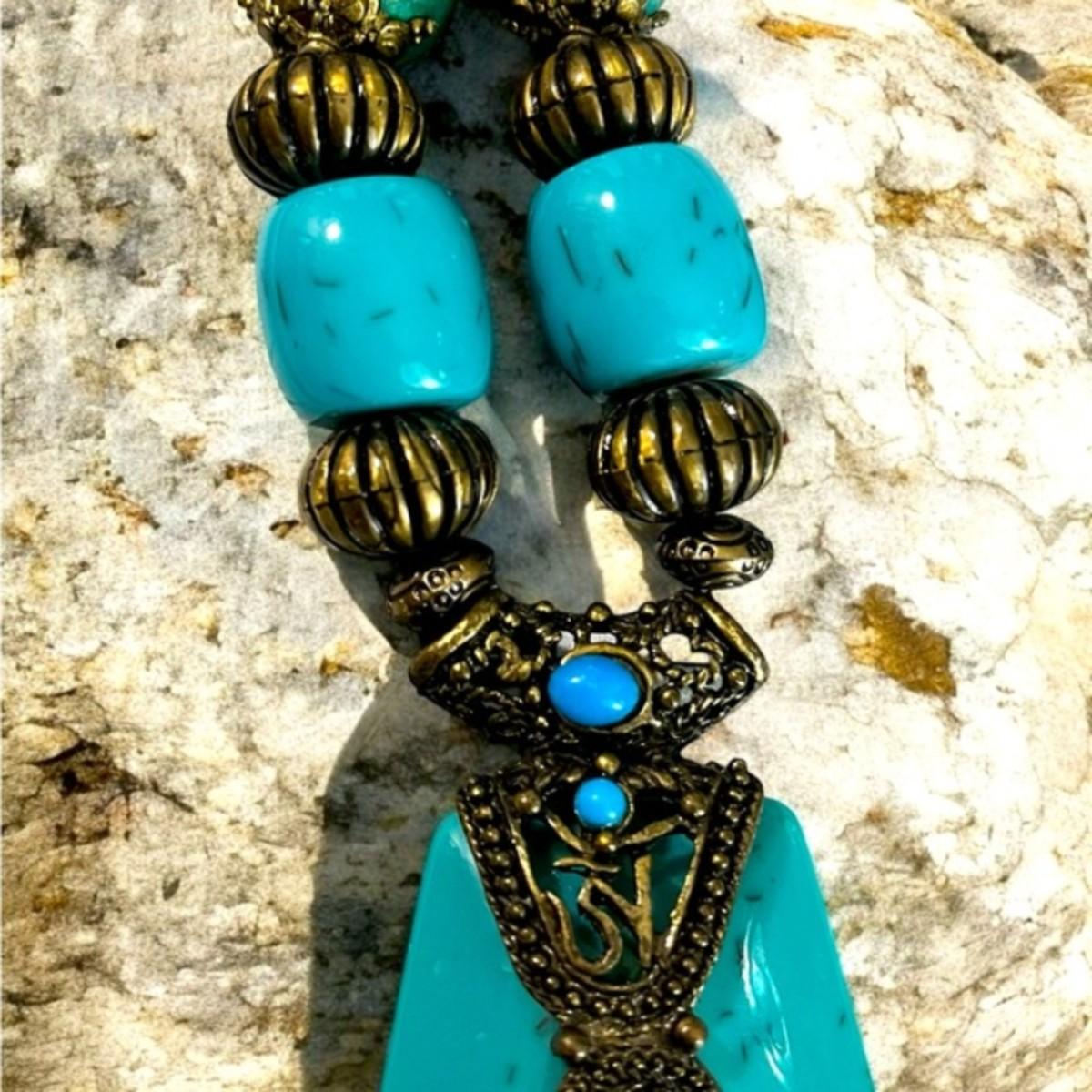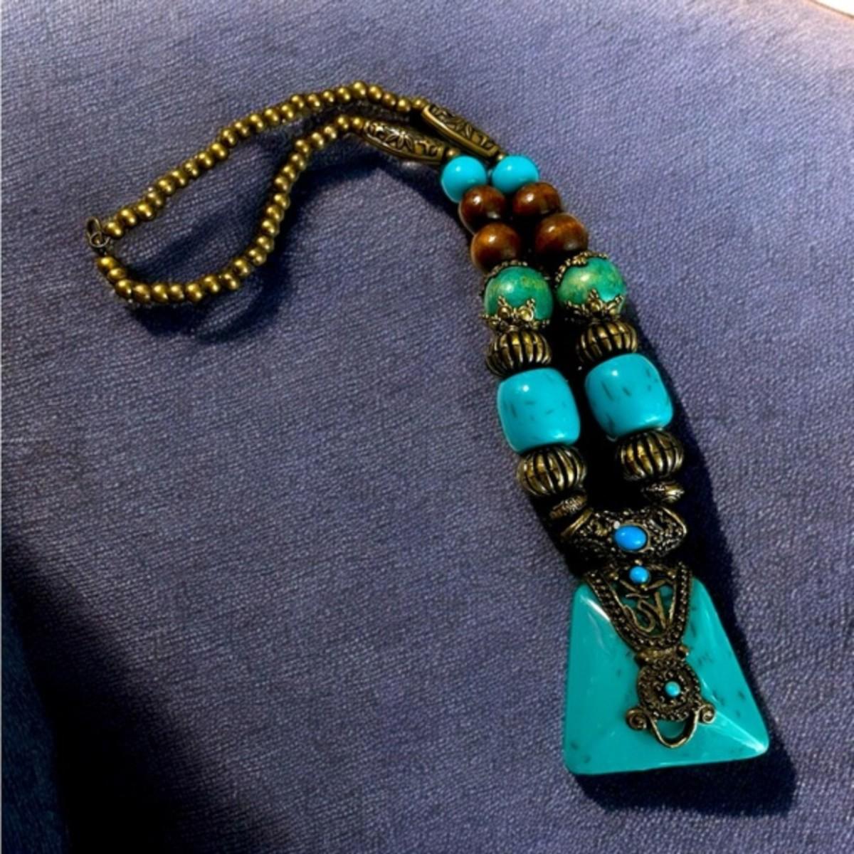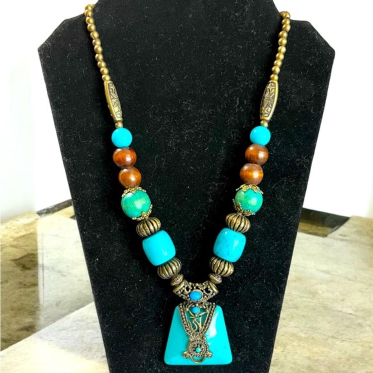 Bohemian Chic Style Chunky Beaded Necklace. In Marble Blue Turquoise Colour, Abstract, Round, Barrel & Rondelle Lucite Plastic Beads Shape, Brown Wooden Beads, Brass Tone Beads and Lobster Claw Clasp. Unique Beaded Necklace. NECKLACE MEASURES 11 INCHES, PENDANT MEASURES 2 INCHES