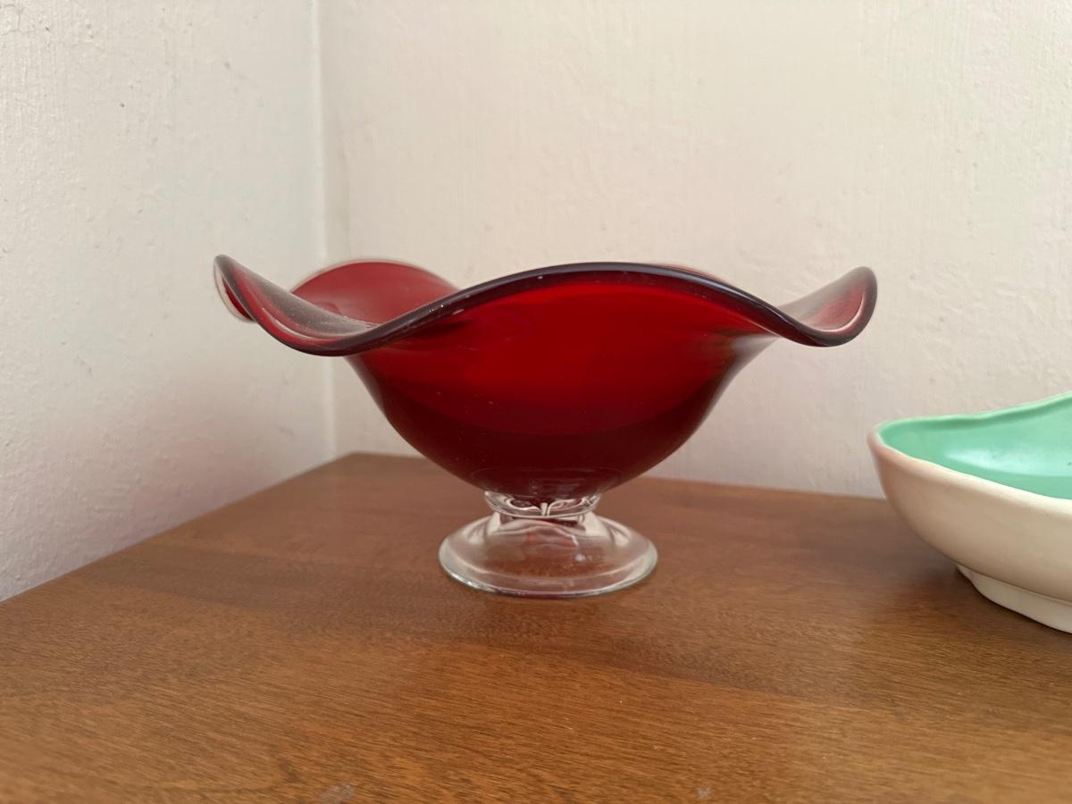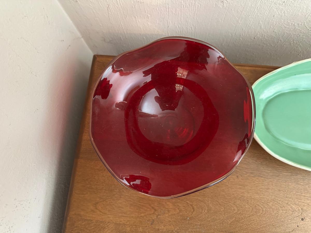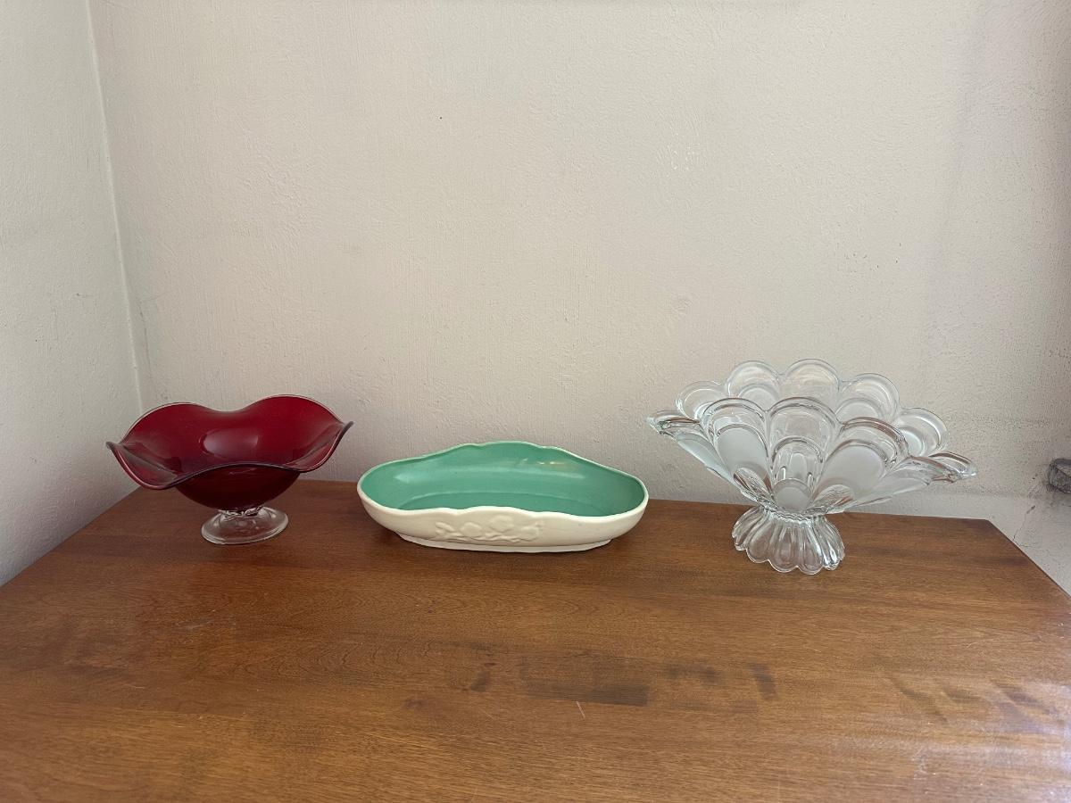BOHEMIAN CRYSTAL SCALLOPED BOWL, RED GLASS COMPOTE AND A METLOX 2 TONE POTTERY BOWL