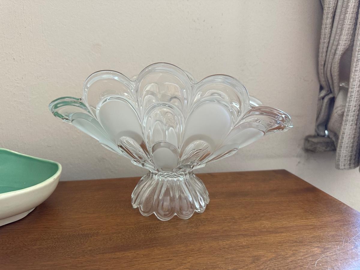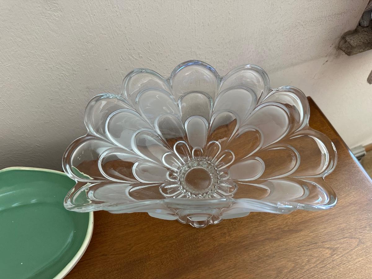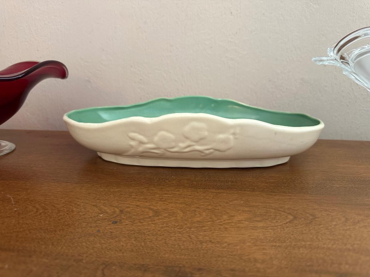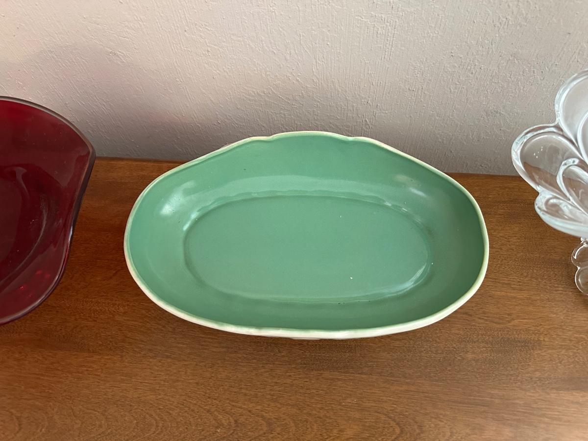 BOHEMIAN CRYSTAL SCALLOPED BOWL, RED GLASS COMPOTE AND A METLOX 2 TONE POTTERY BOWL