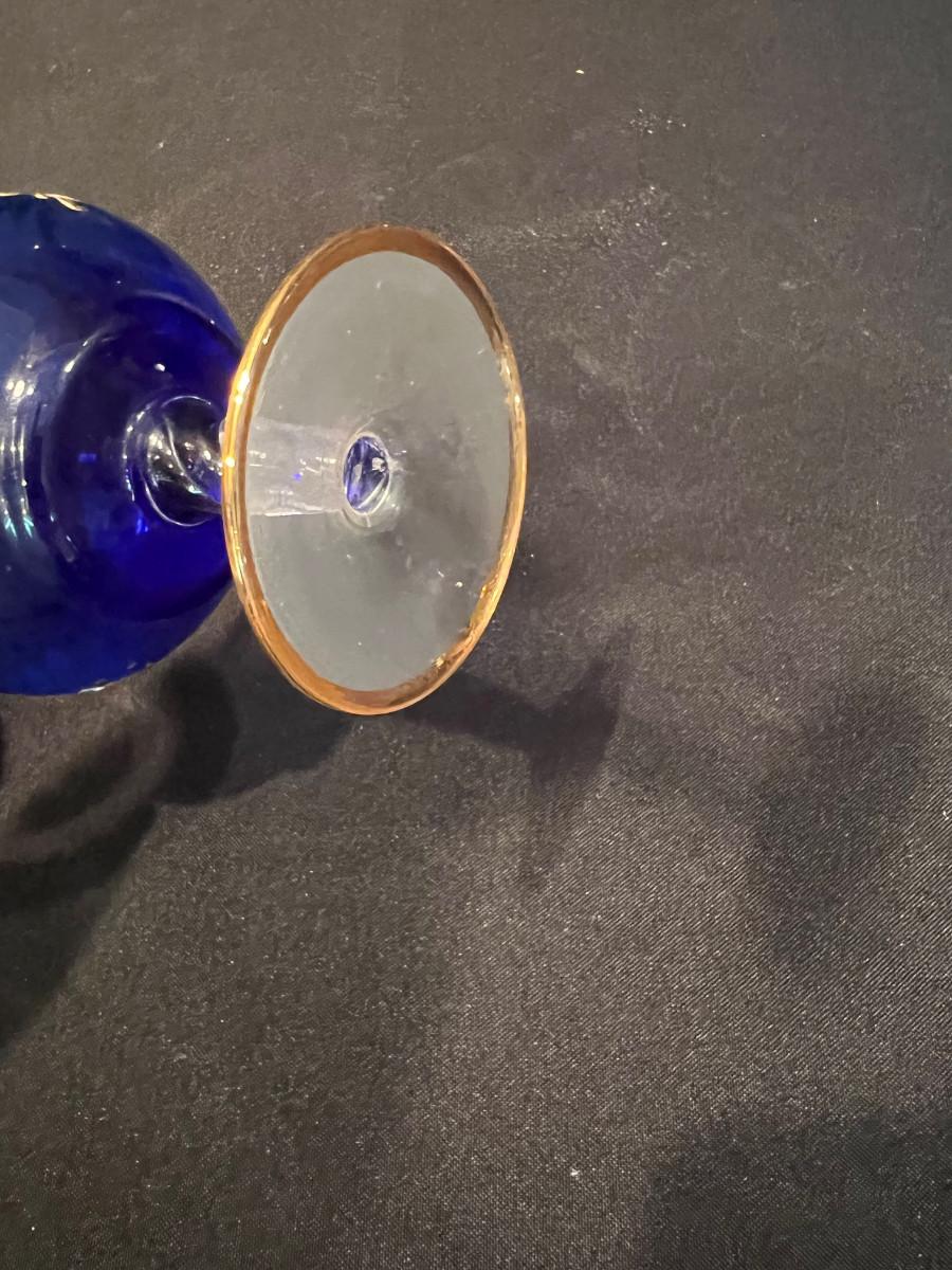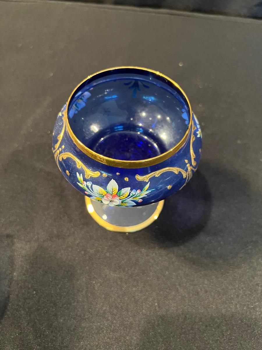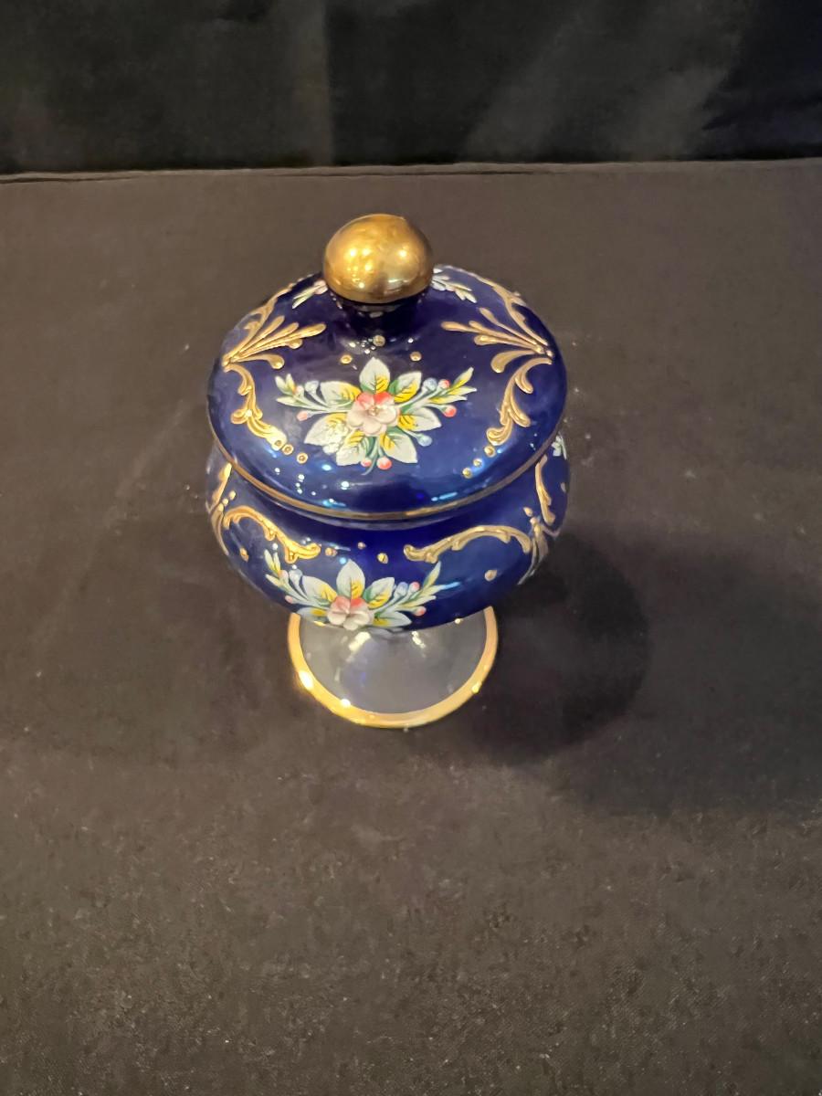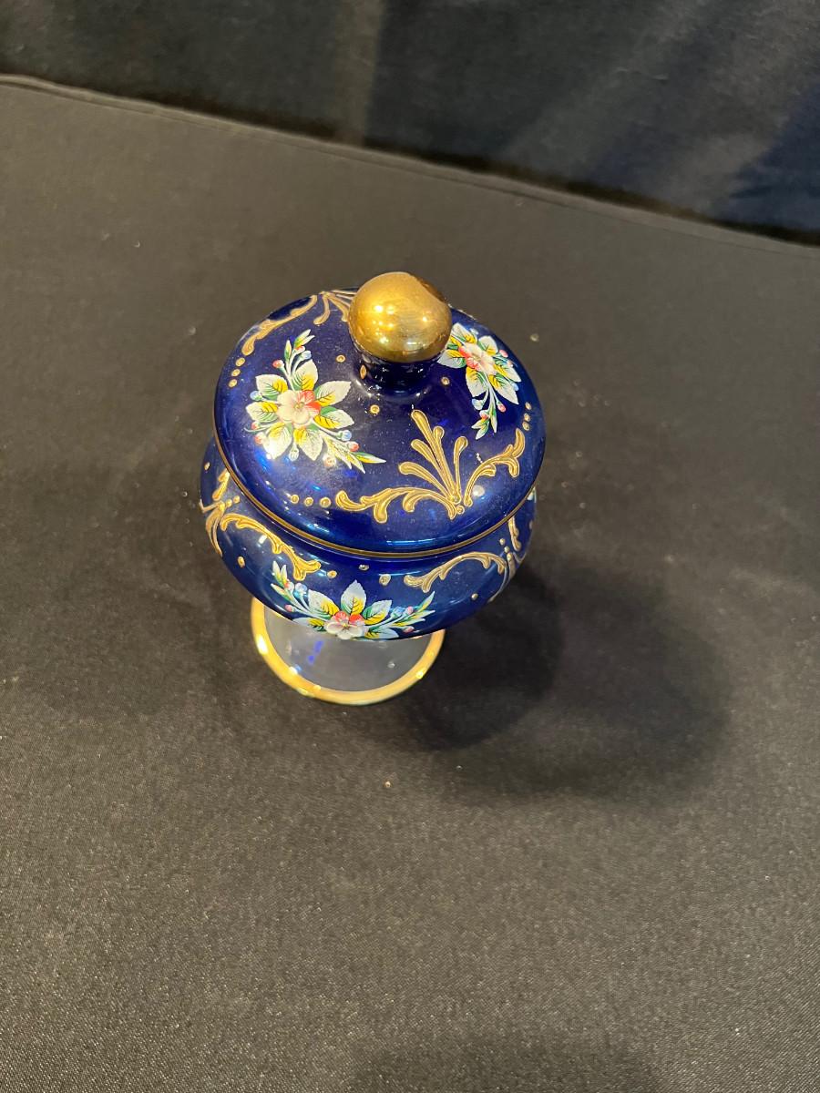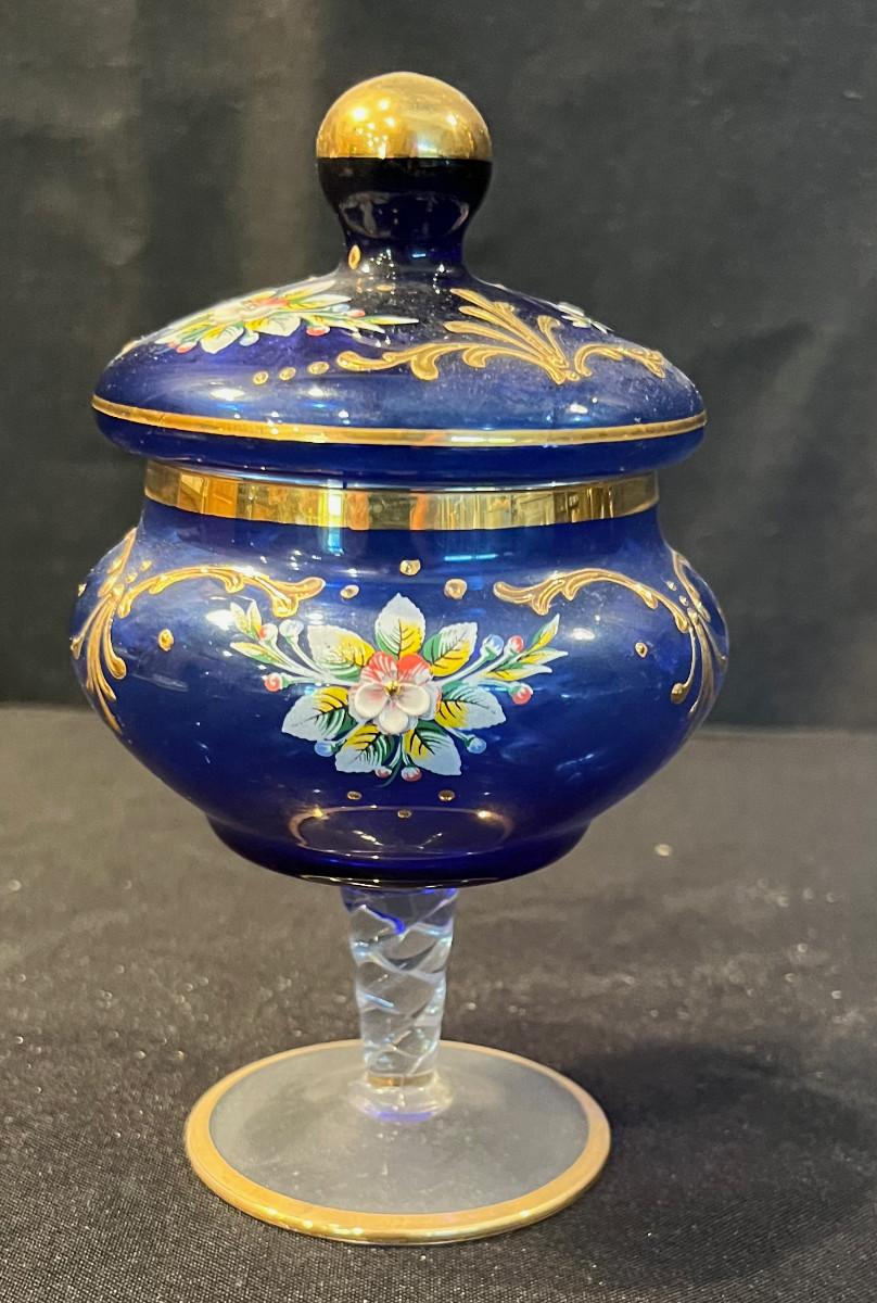 Bohemian Glass Blue Hand Painted Lidded / Covered Dish