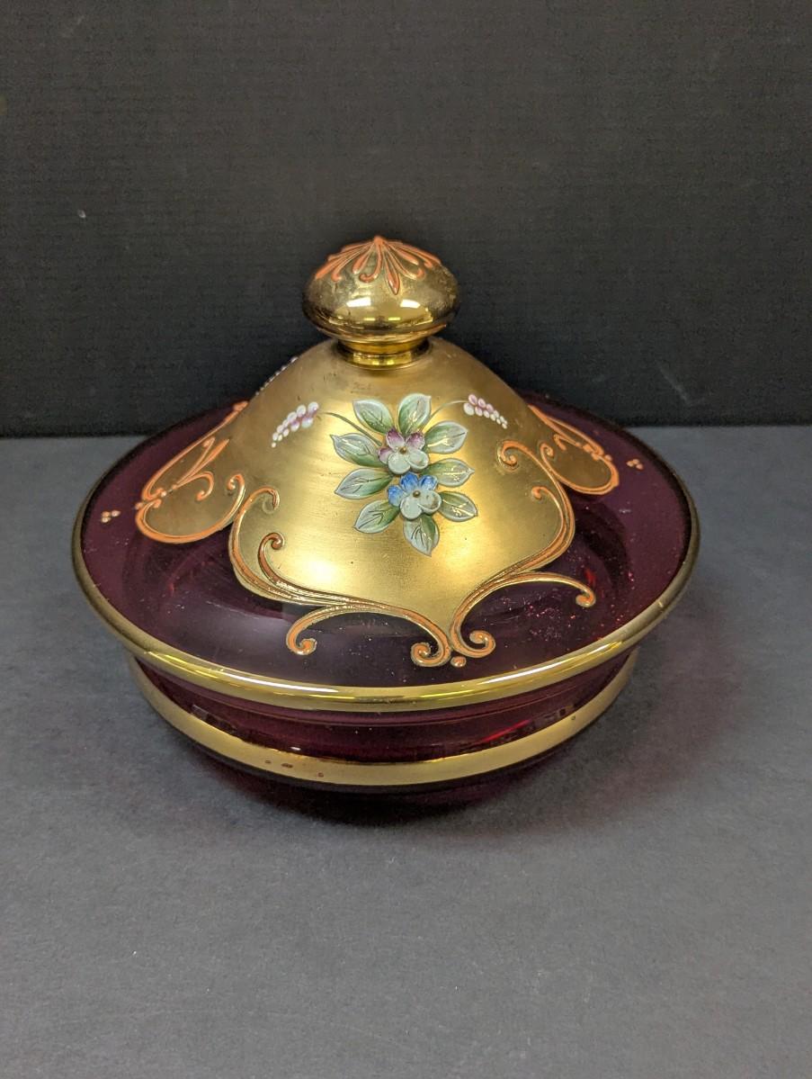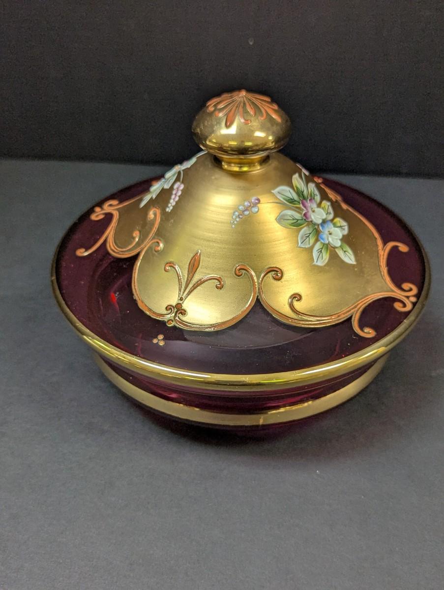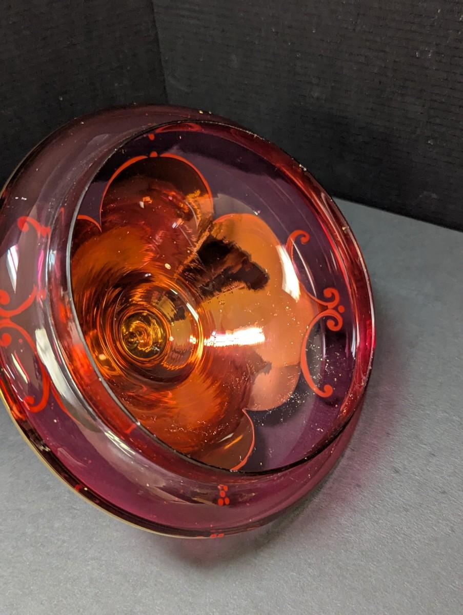 Bohemian Glass Ruby Red Gilded Painted Covered Trinket Candy Dish