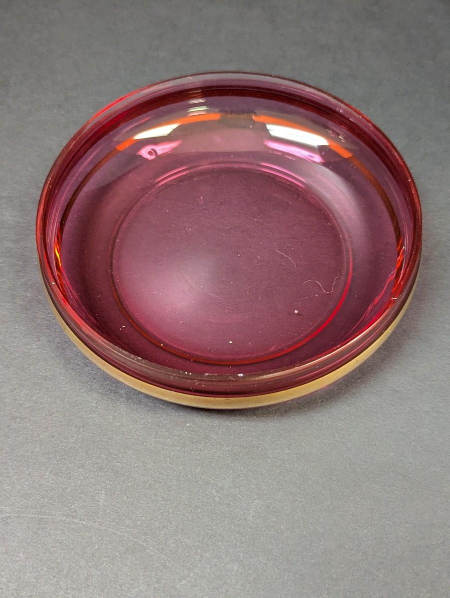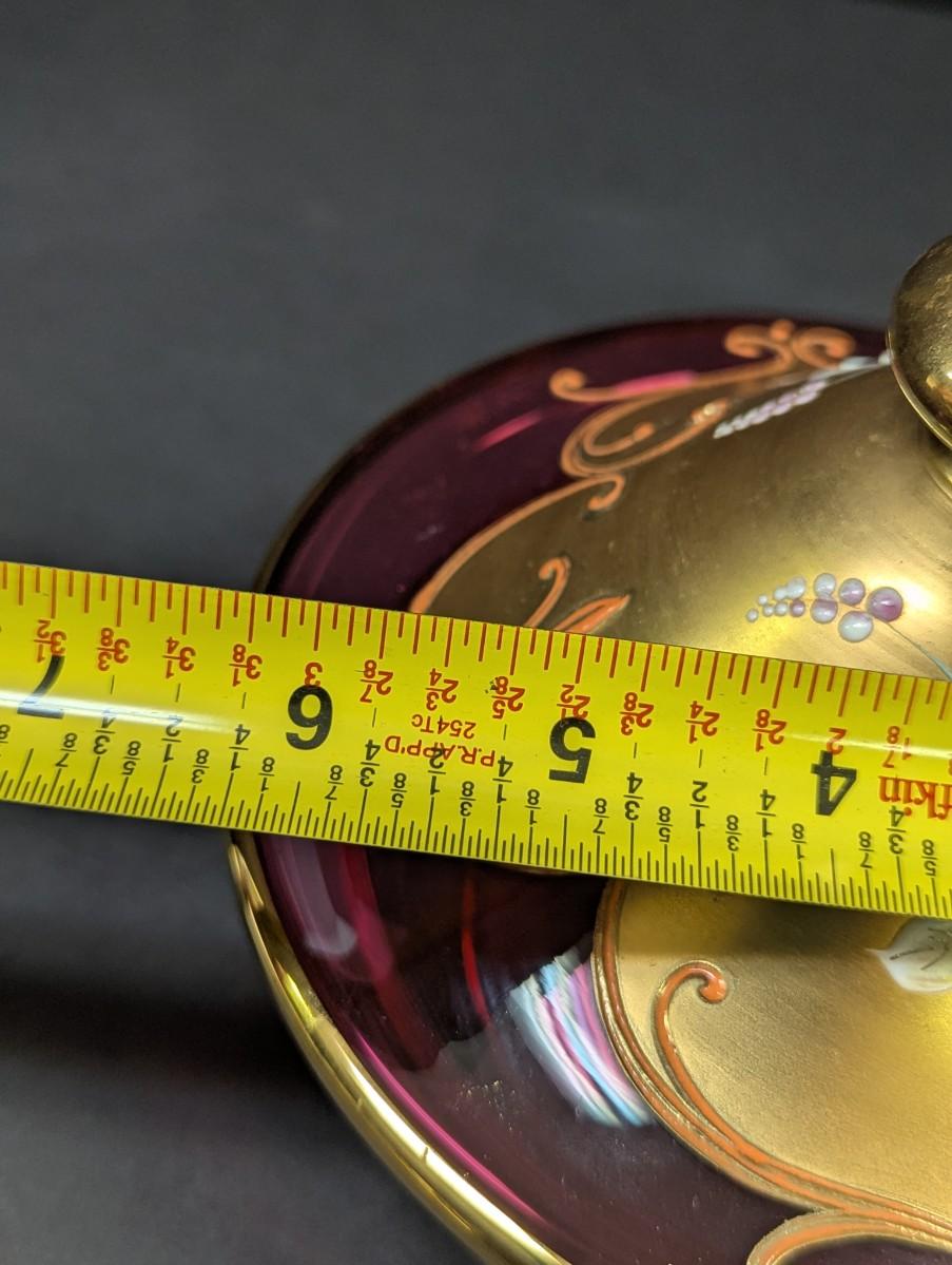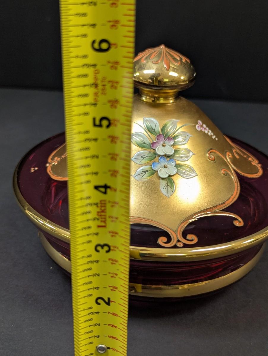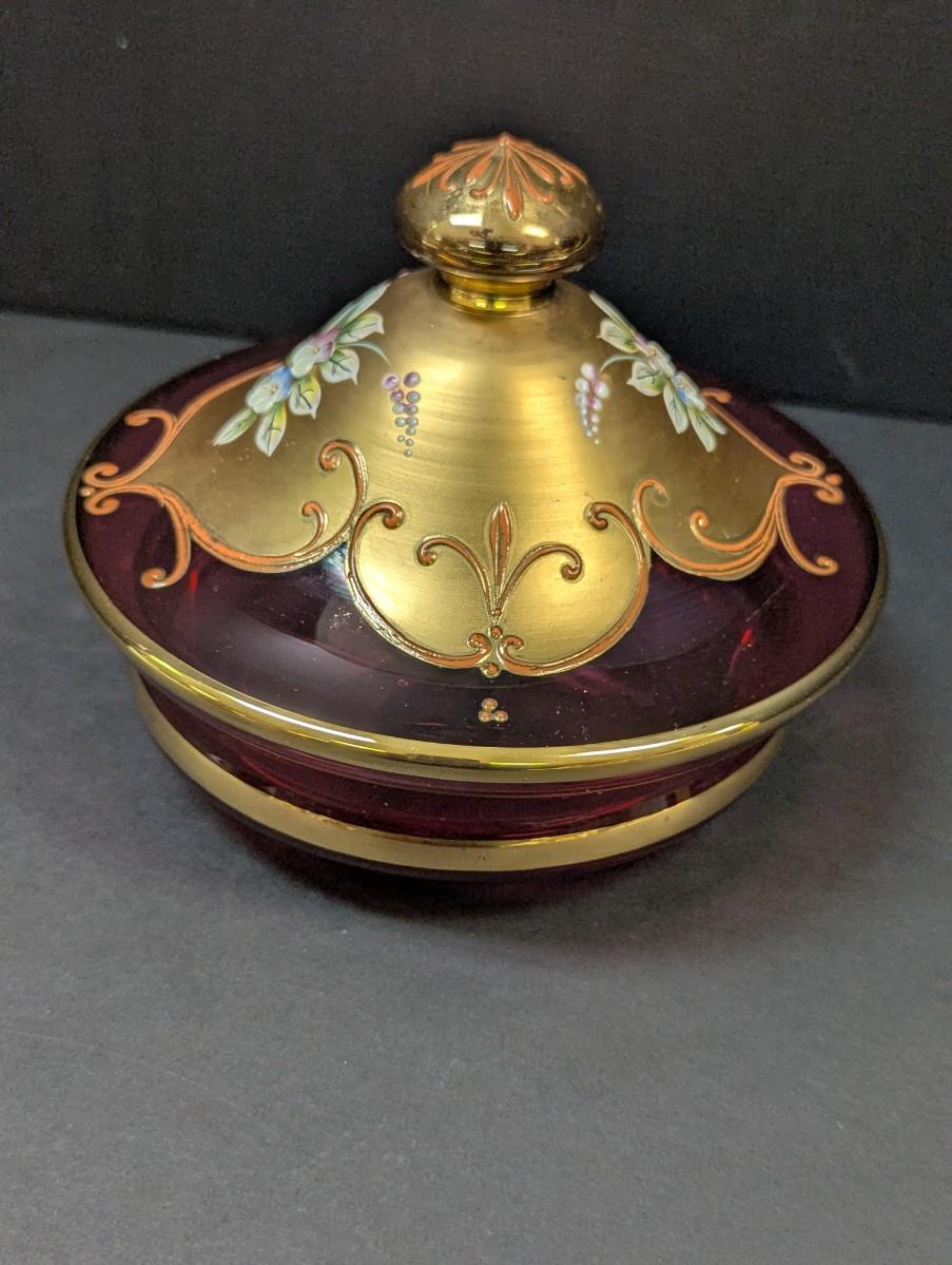 Bohemian Glass Ruby Red Gilded Painted Covered Trinket Candy Dish