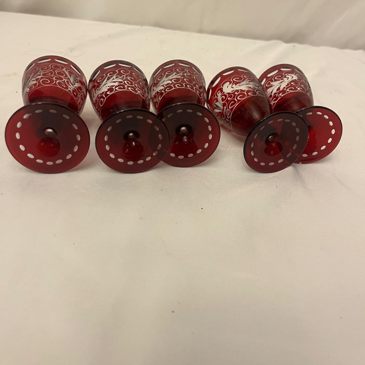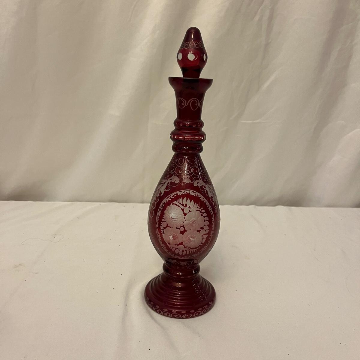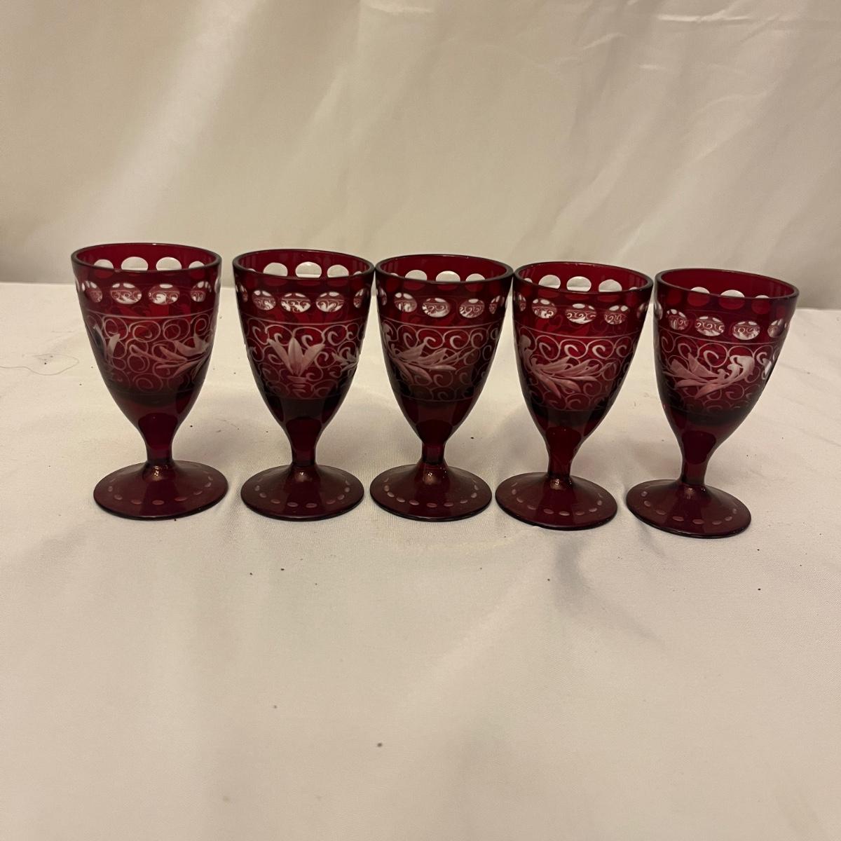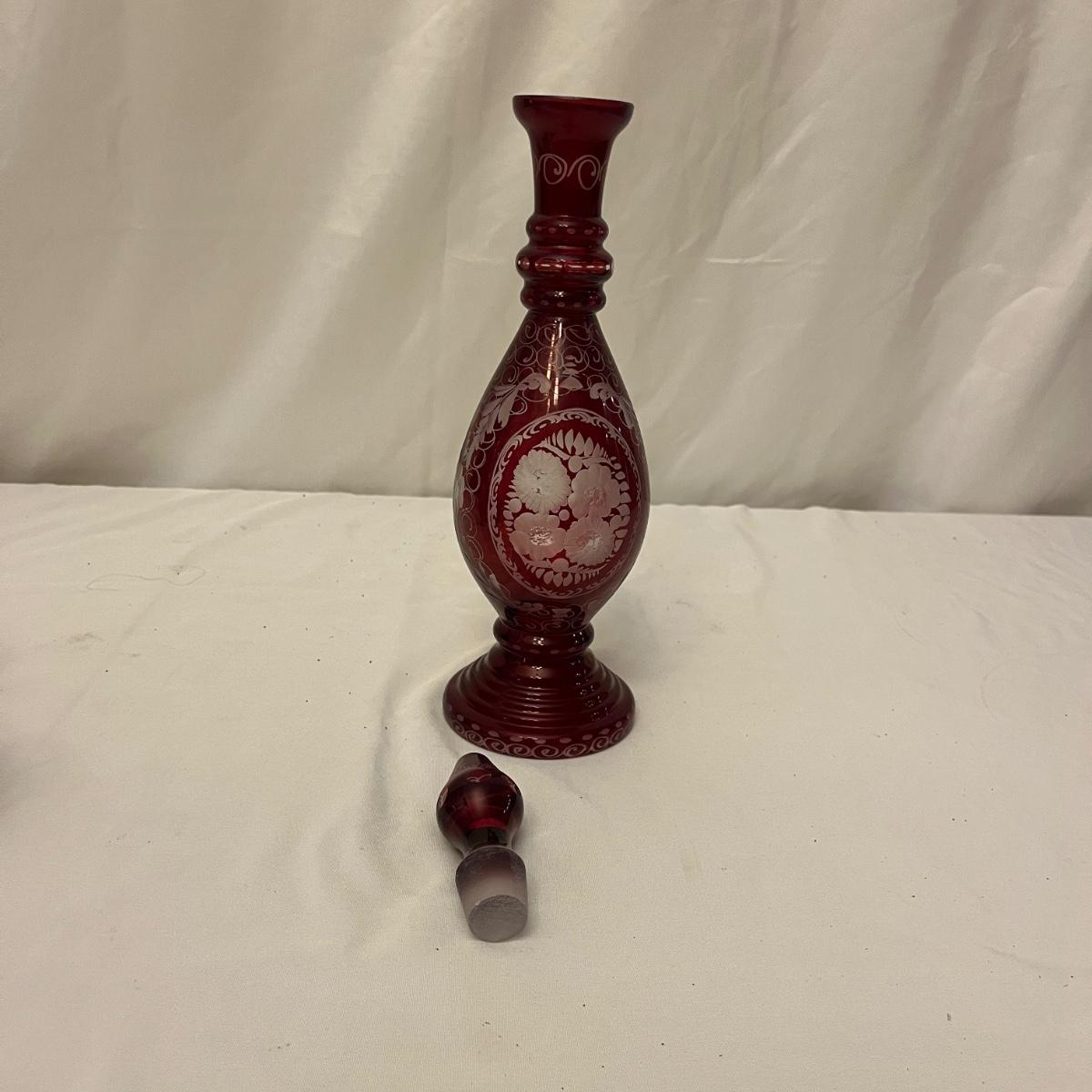 Lot includes a cut to clear Bohemian ruby red glass decanter and five cordial glasses. Decanter measures 3.25”D x 12”H.