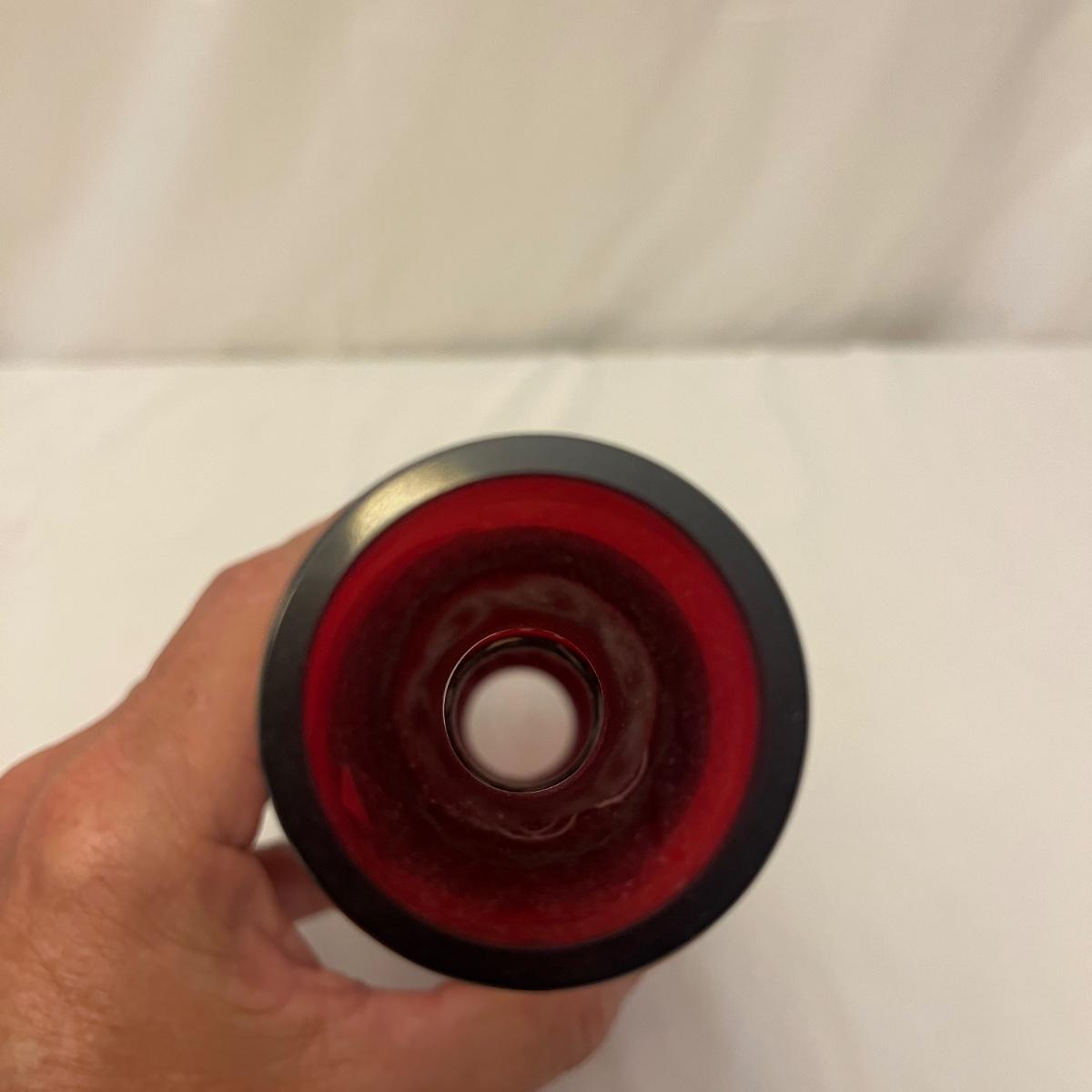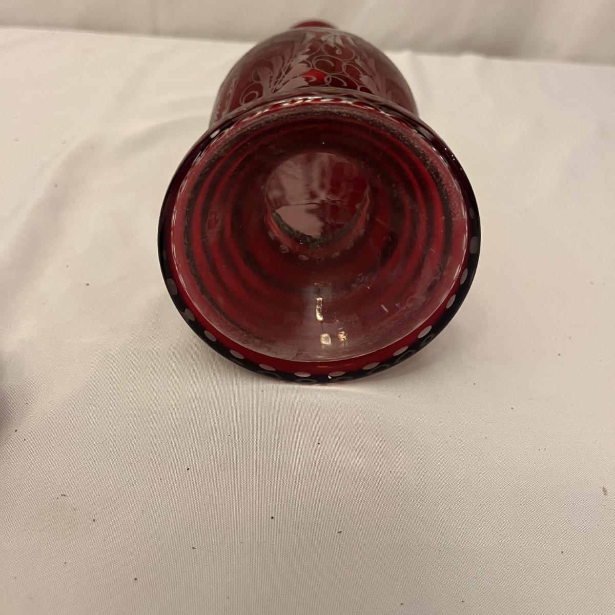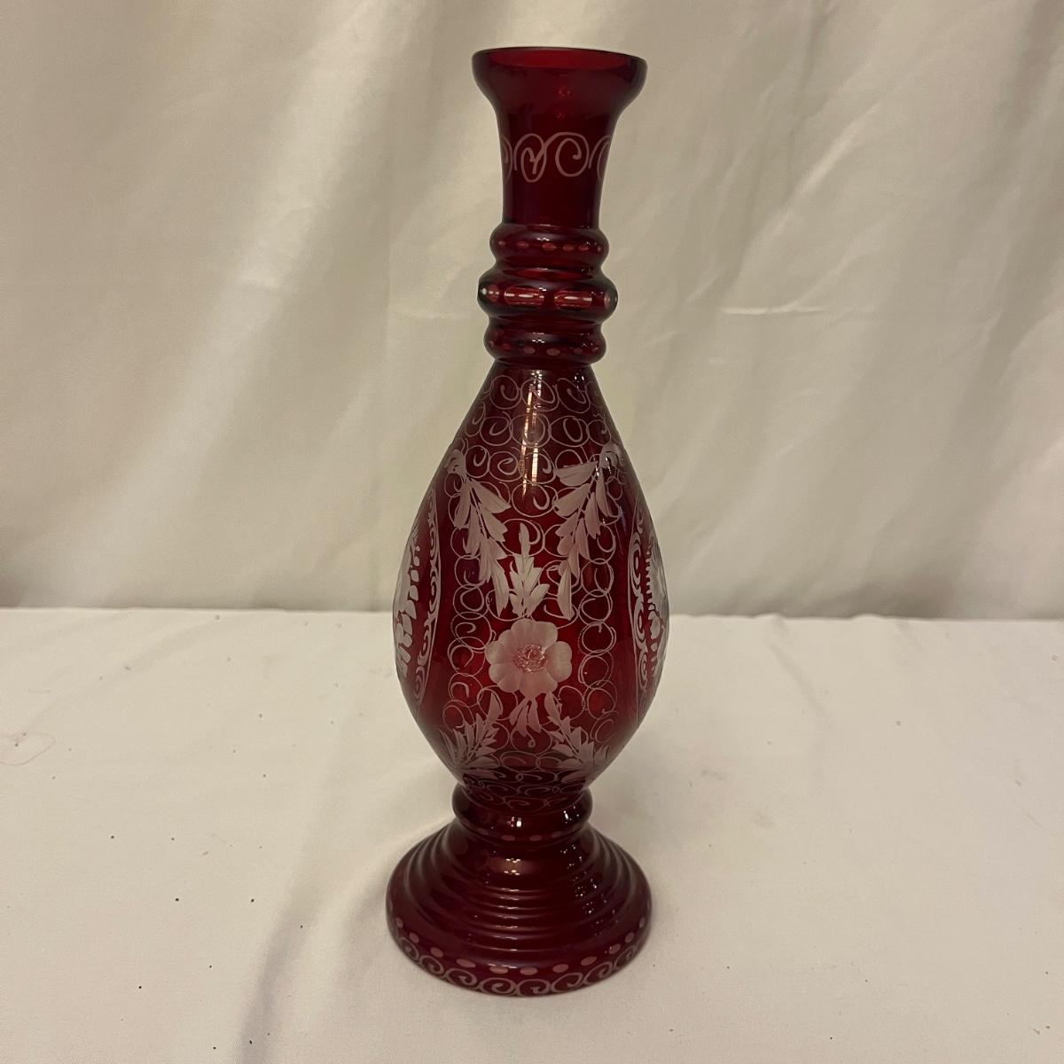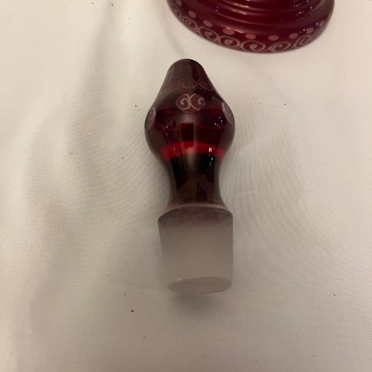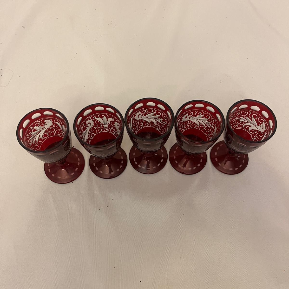 Lot includes a cut to clear Bohemian ruby red glass decanter and five cordial glasses. Decanter measures 3.25”D x 12”H.