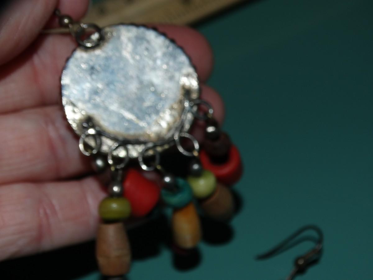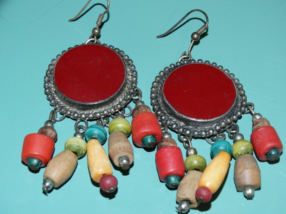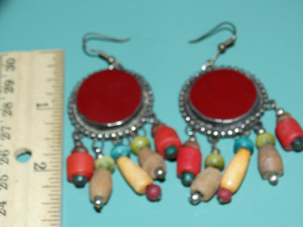 Silver Tone Tribal Dangle Wood Beads Wire Hook Earrings