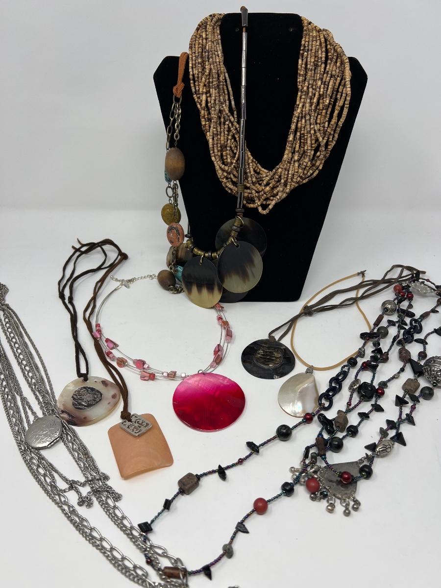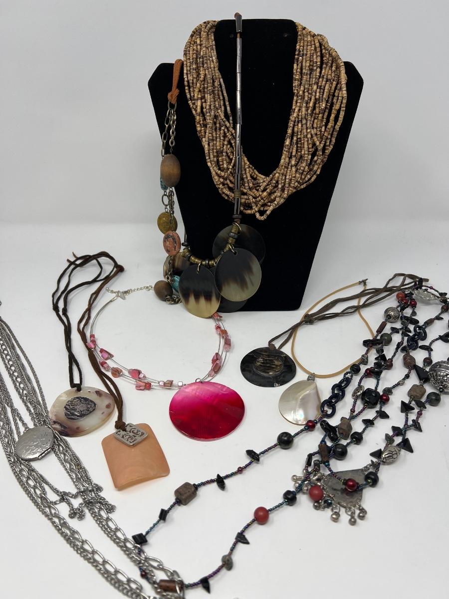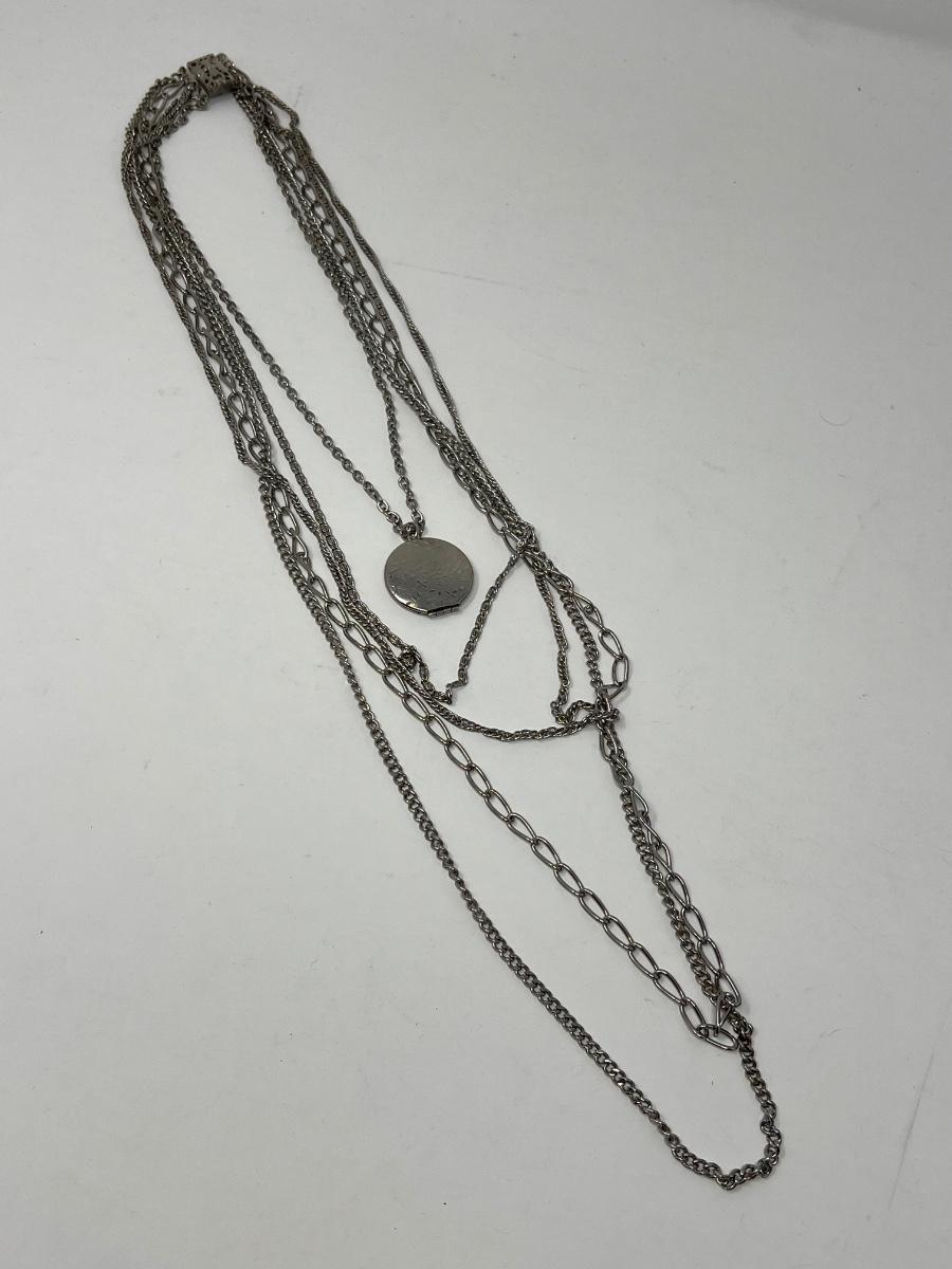 Fashion costume necklaces with various pendants. Silver toned multi-chain with locket. Various lengths.