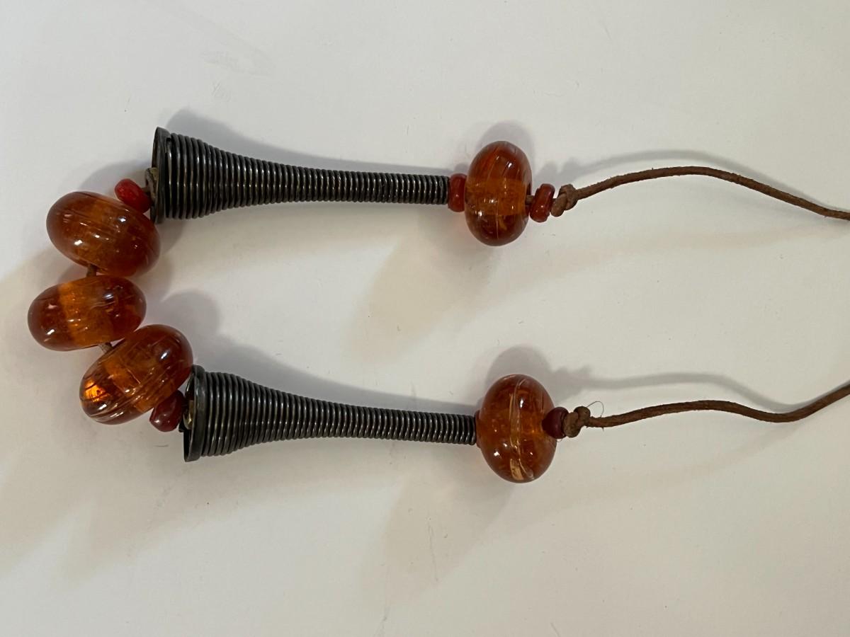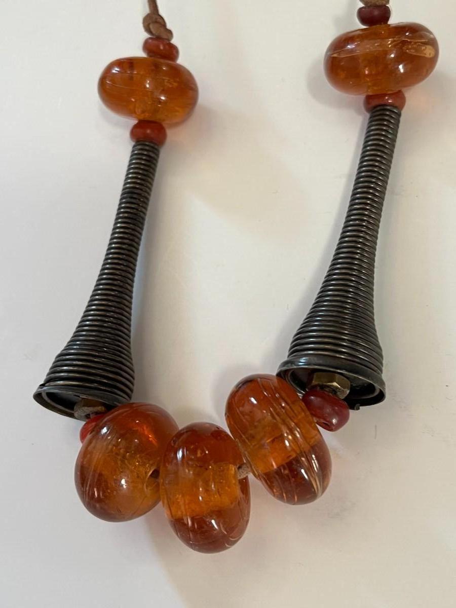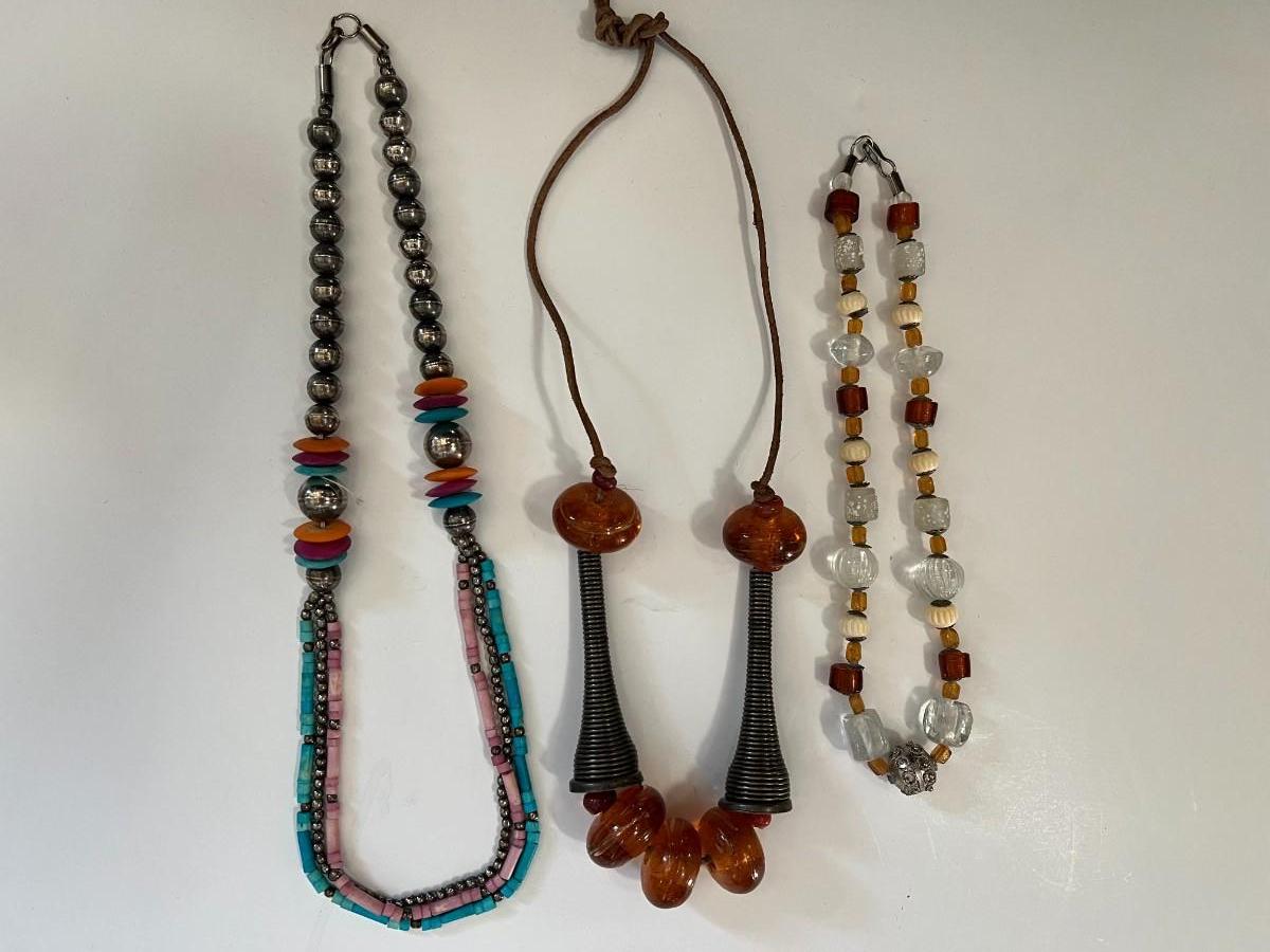 Three amazing vintage boho necklaces made with large and small beads, leather cord, and metal clasps. Large amber beaded with coiled metal is 24" long, multi-colored beaded necklace is 24" long, neutral toned necklace is 16" long.