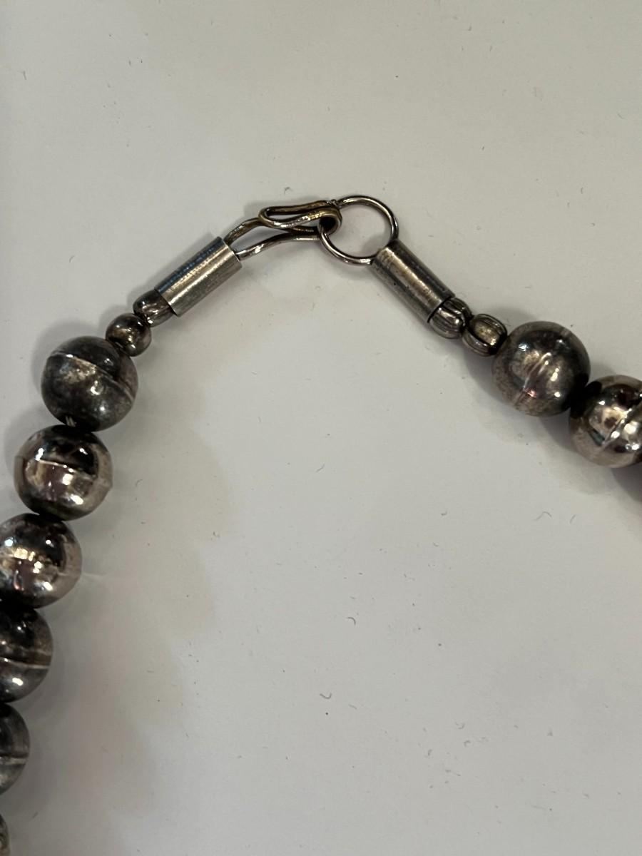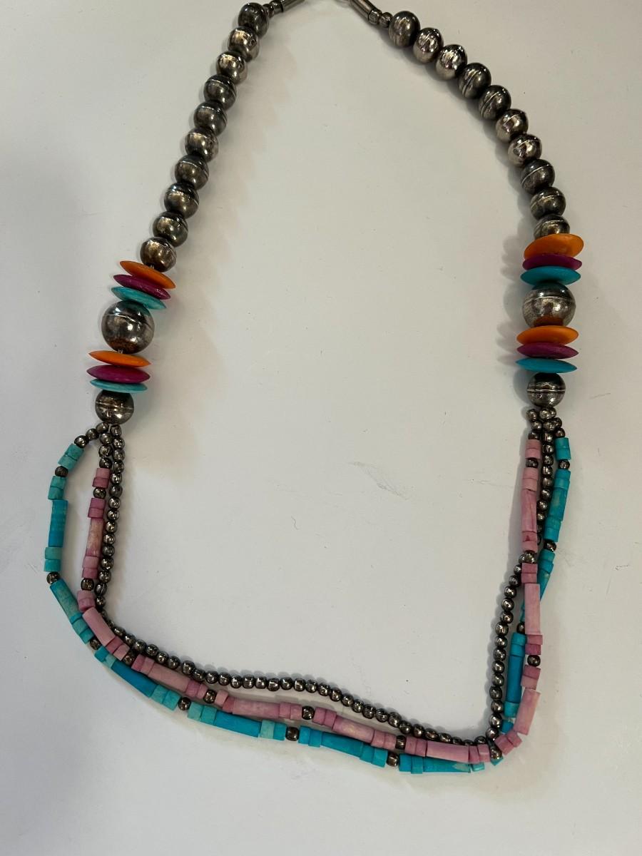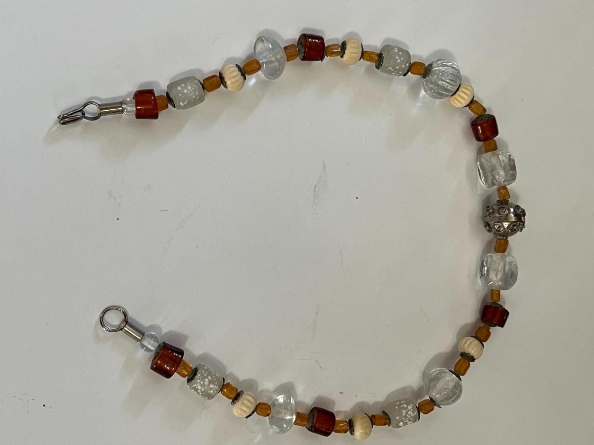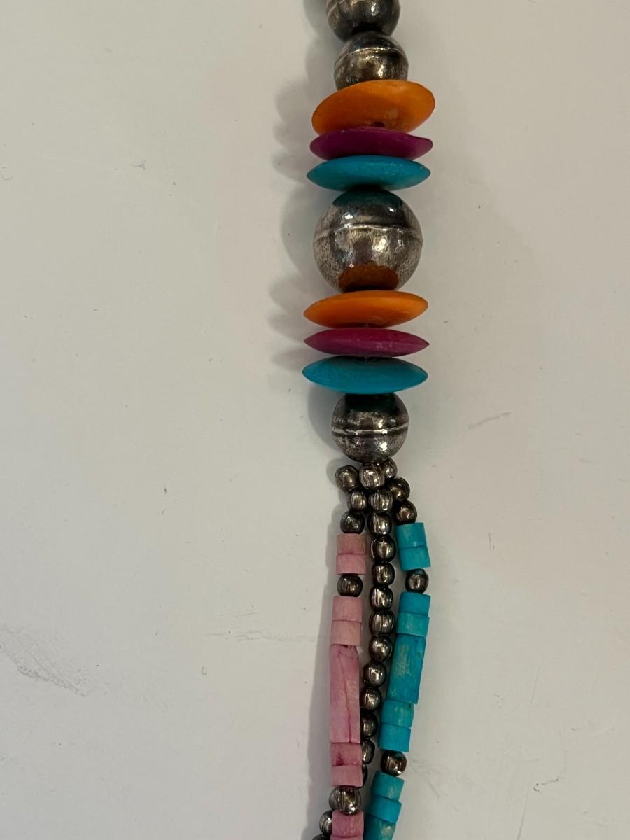 Three amazing vintage boho necklaces made with large and small beads, leather cord, and metal clasps. Large amber beaded with coiled metal is 24" long, multi-colored beaded necklace is 24" long, neutral toned necklace is 16" long.