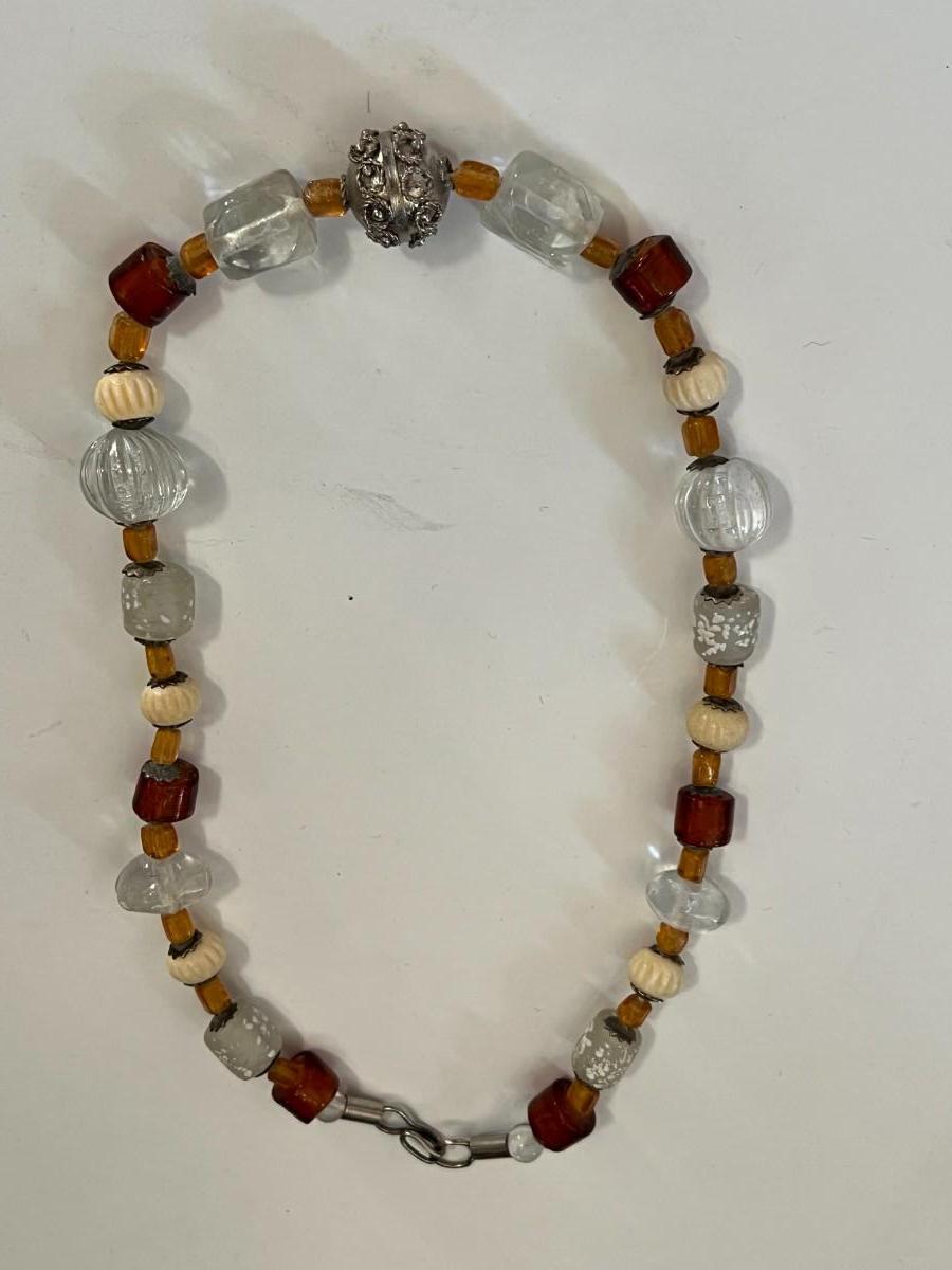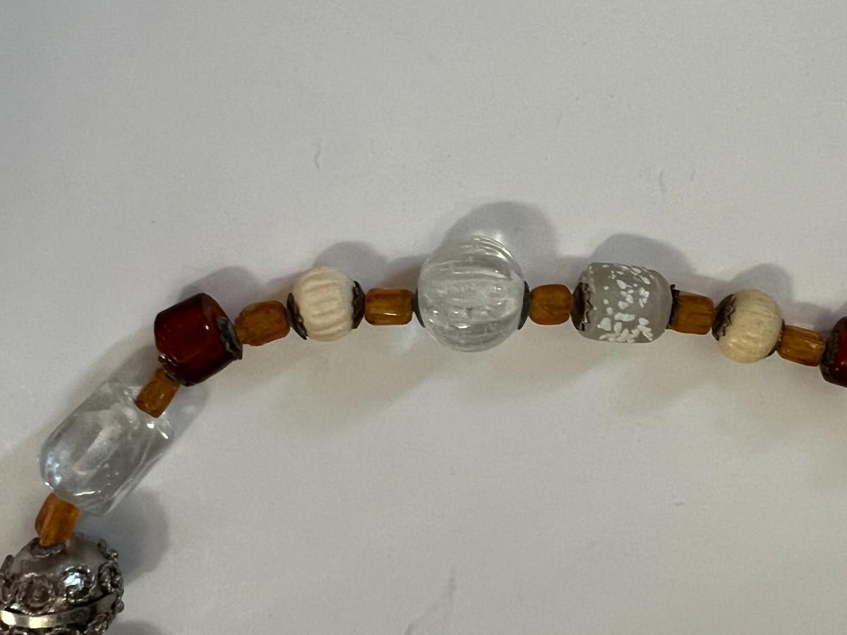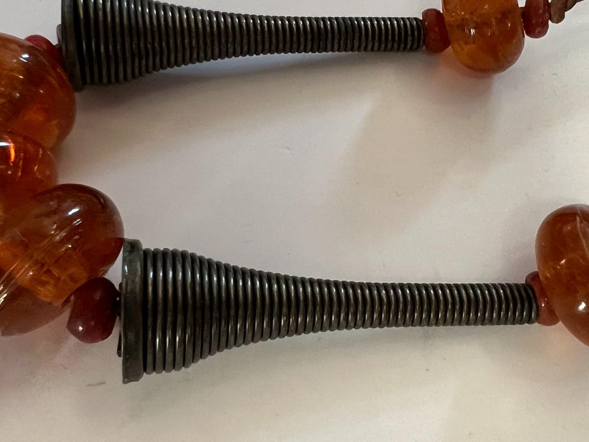 Three amazing vintage boho necklaces made with large and small beads, leather cord, and metal clasps. Large amber beaded with coiled metal is 24" long, multi-colored beaded necklace is 24" long, neutral toned necklace is 16" long.