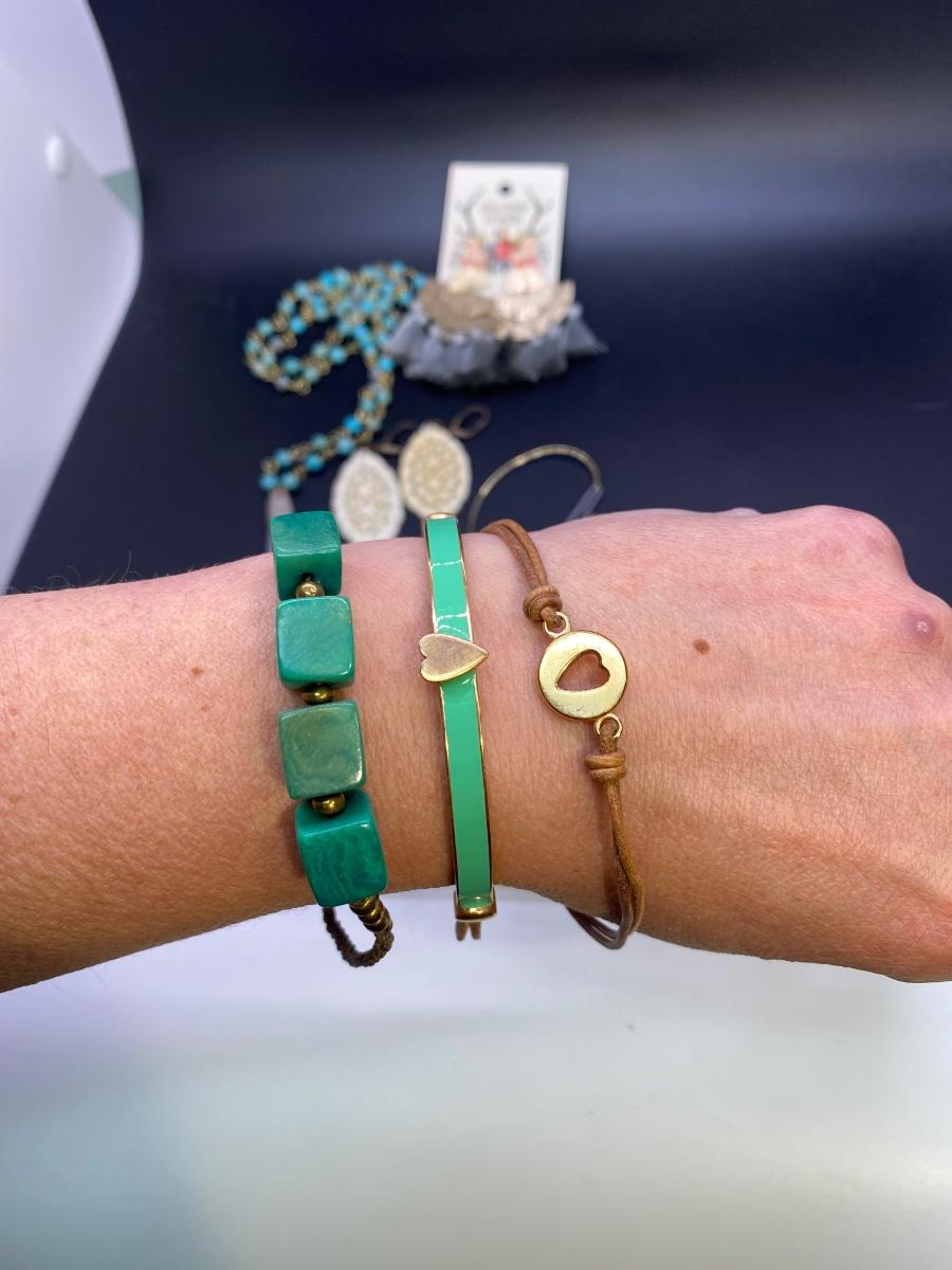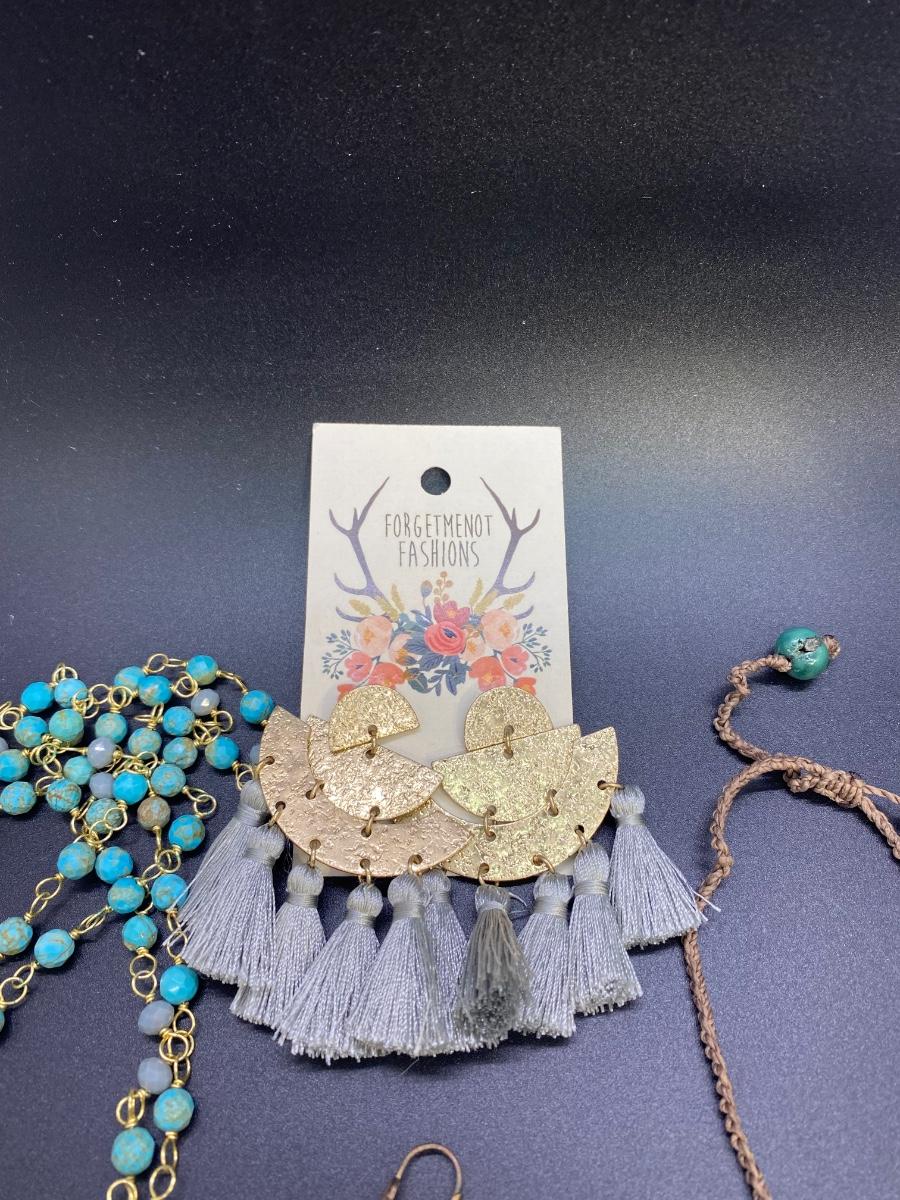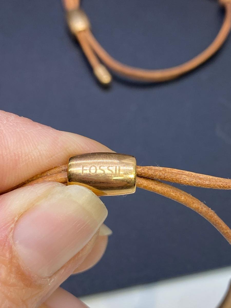 Trendy fashion jewelry lot. Bracelets, earrings, and a necklace. Bracelets are adjustable size, pull cord to tighten/loosen, two are from Fossil. All are in good condition.