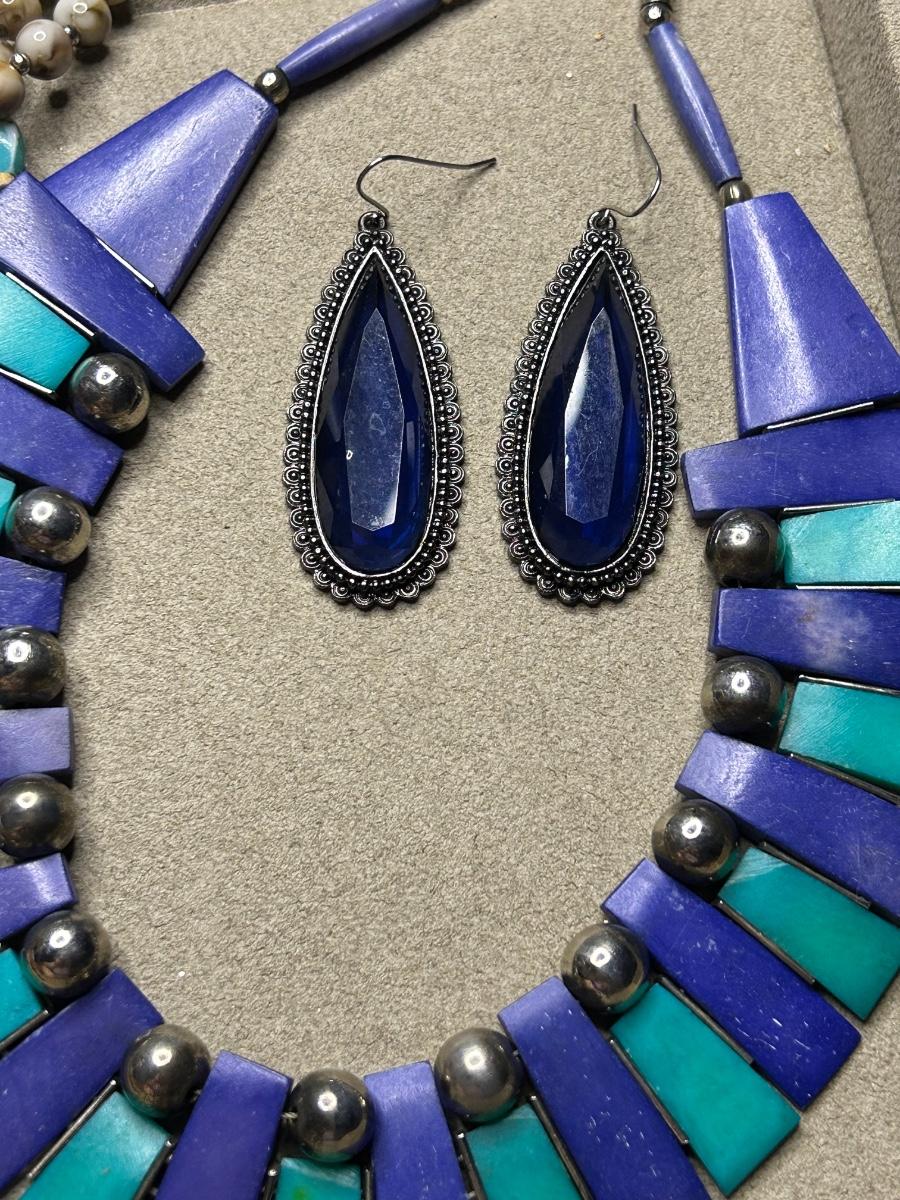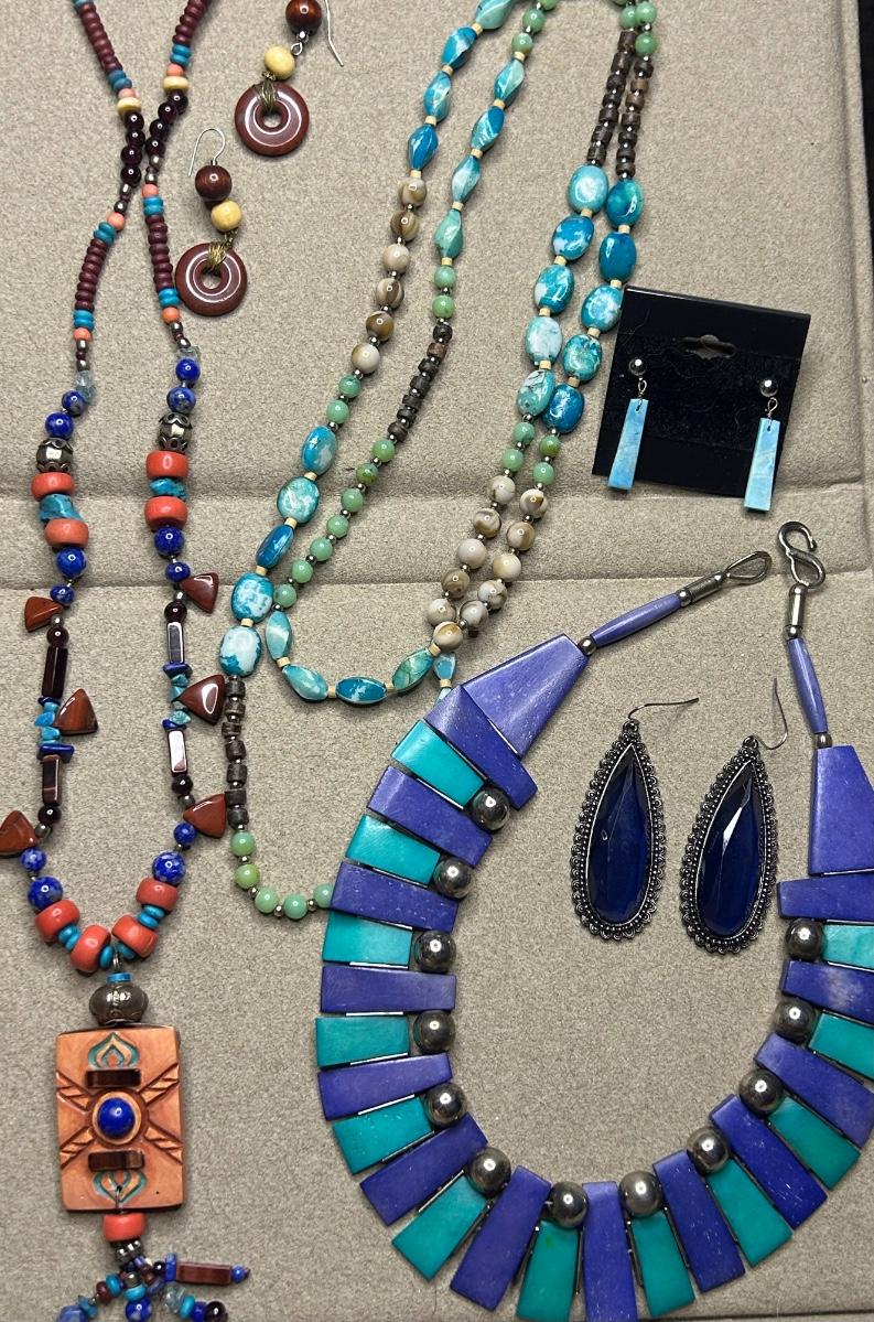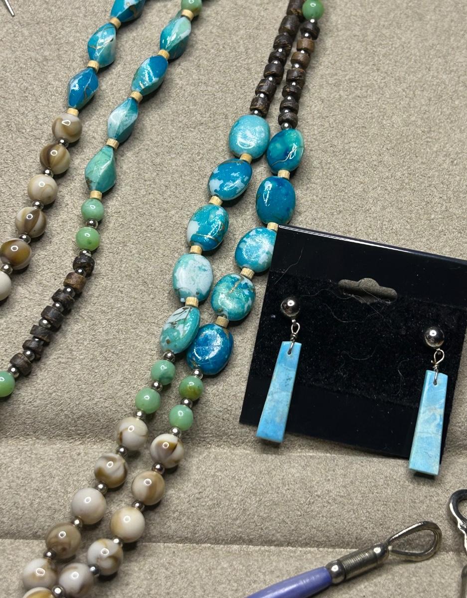 All earrings are pierced. The first & last necklaces have some sort of stones, as they’re cold to the touch. The last necklace is very vintage!