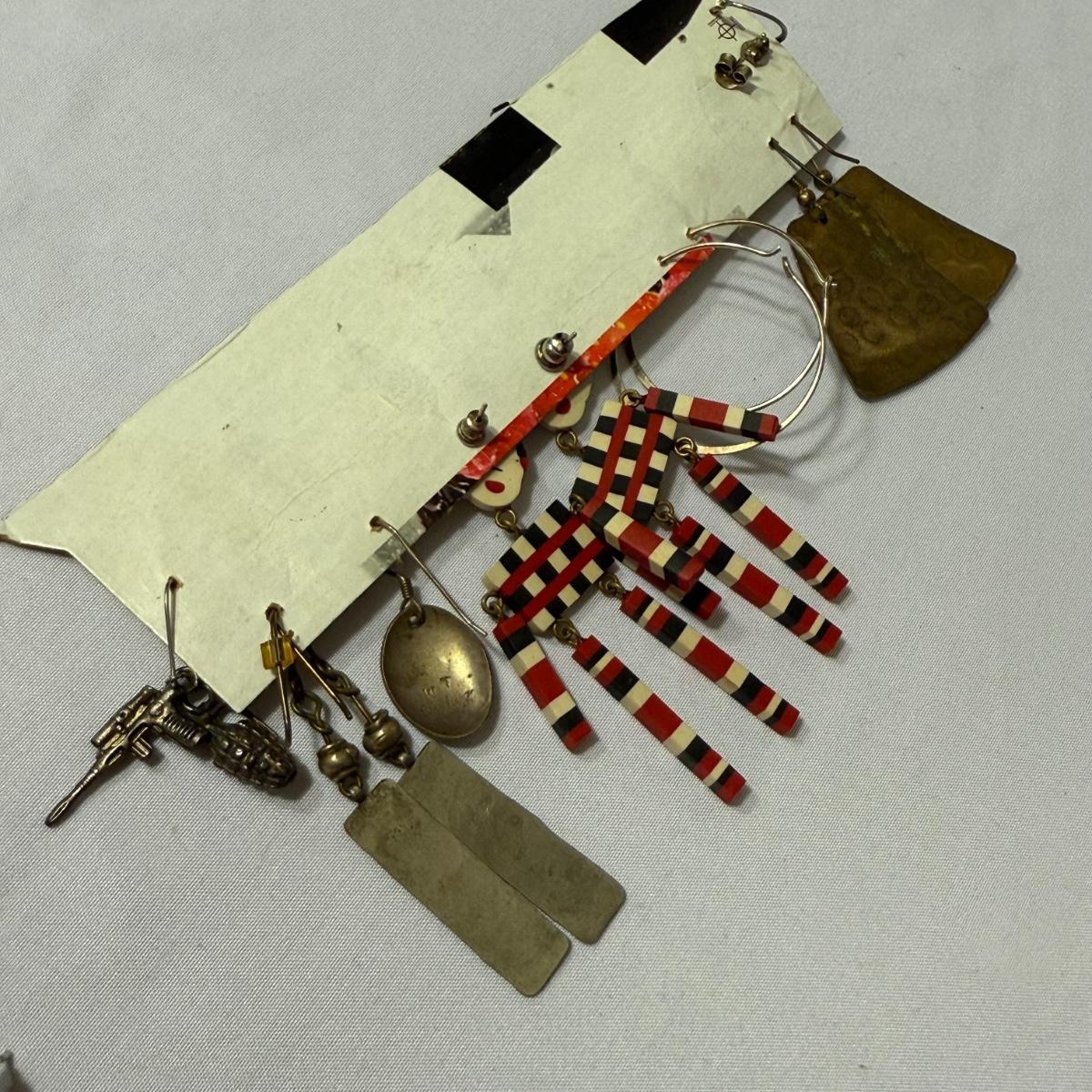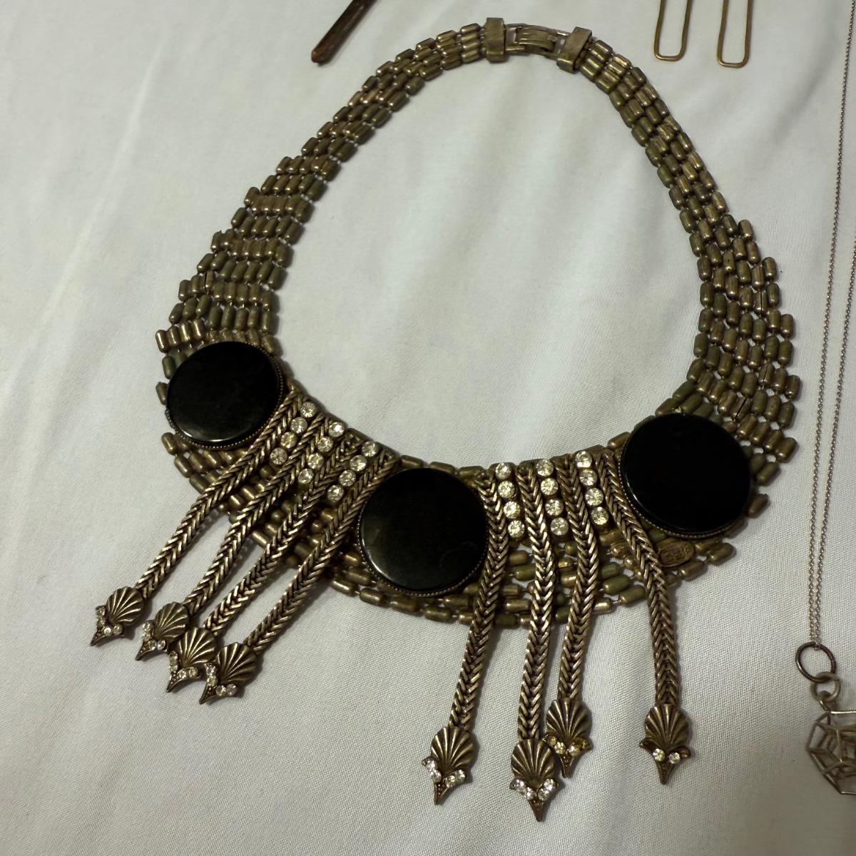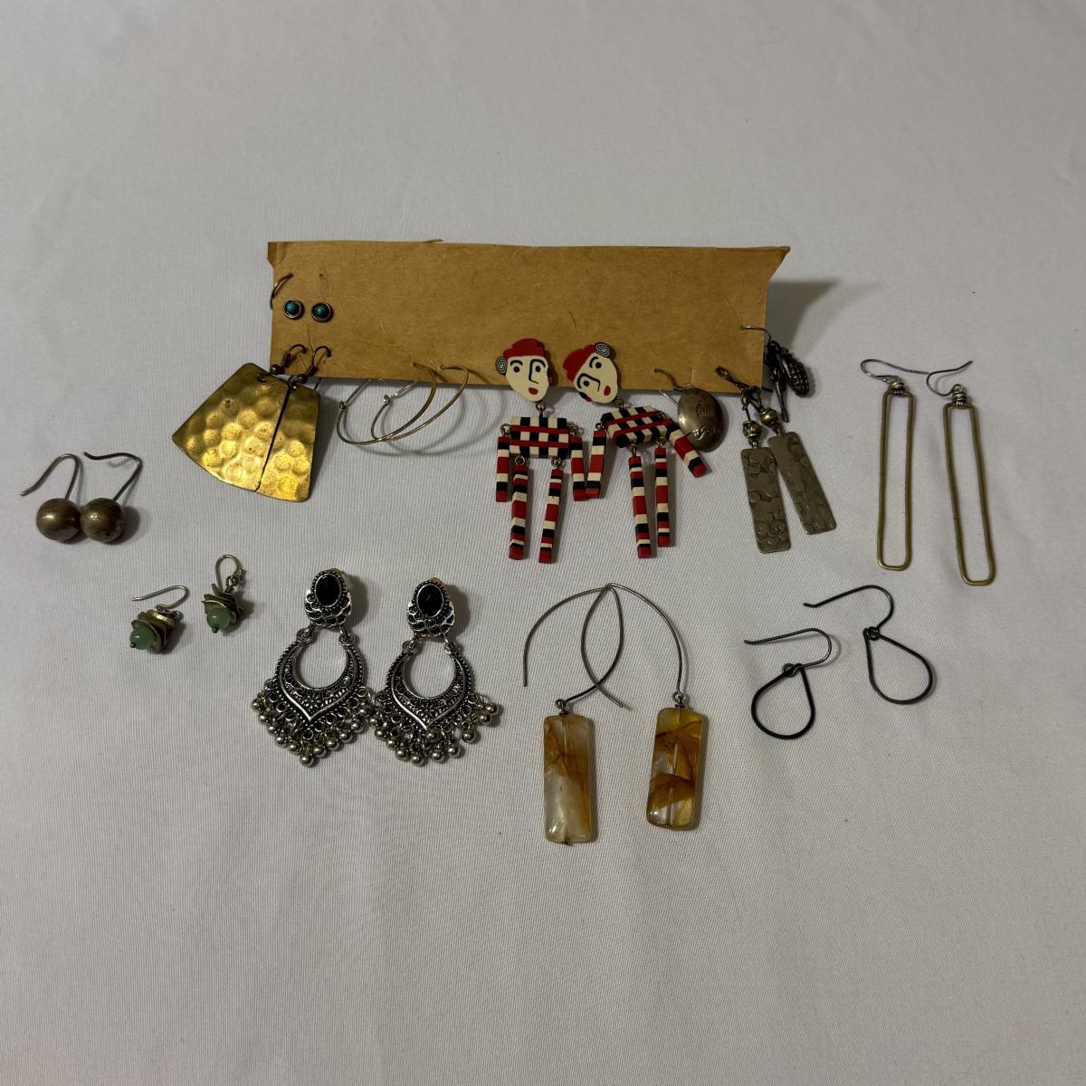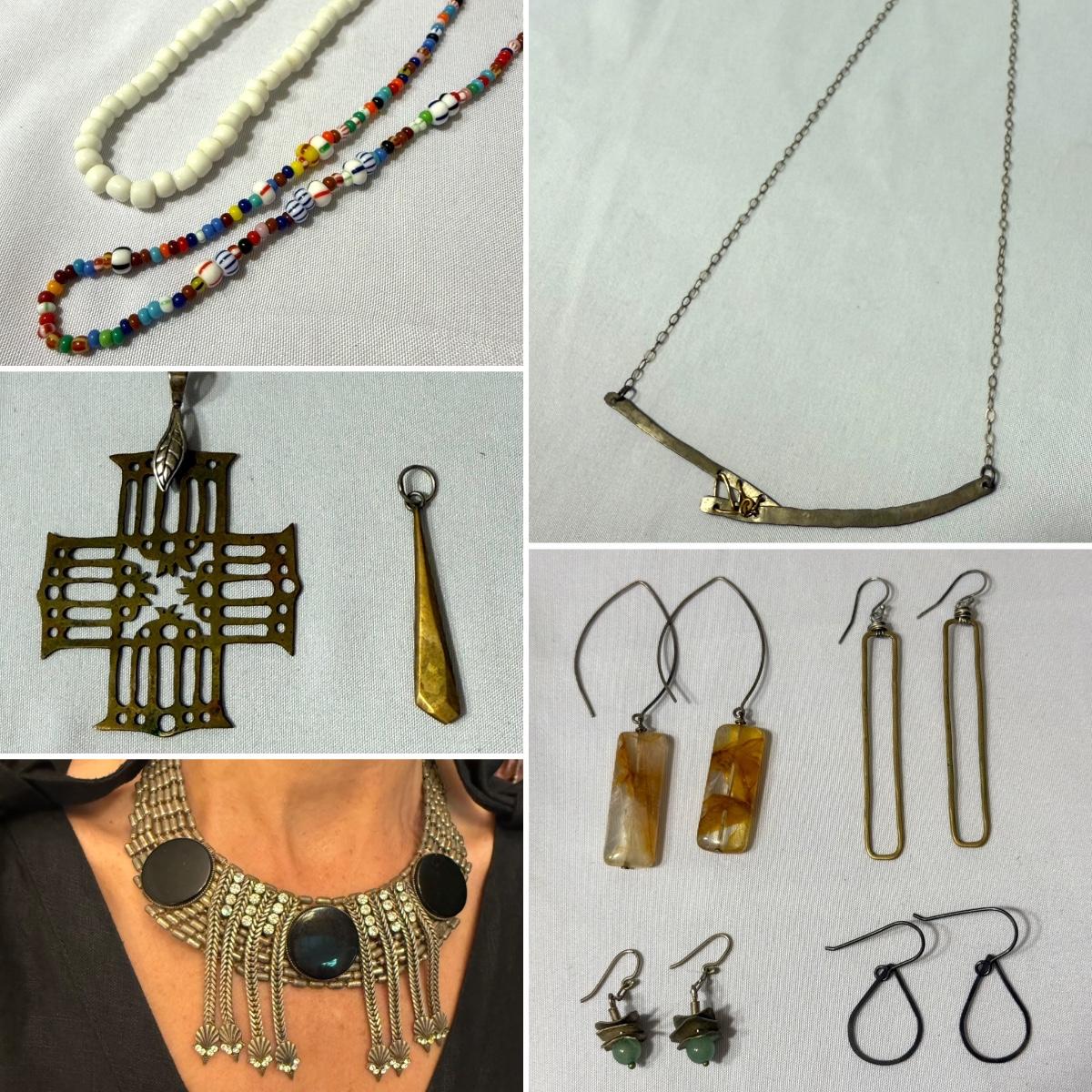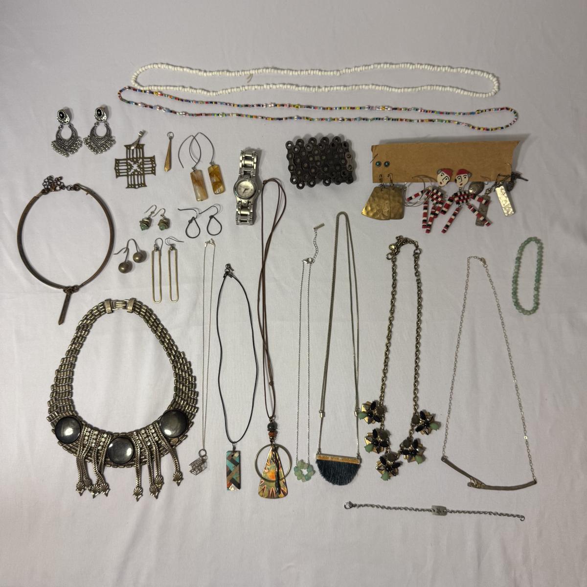 An eclectic collection of necklaces, bracelets, and earrings, plus a watch and a belt buckle. There are 11 necklaces, two bracelets, 11 pairs of earrings for pierced ears (plus some single earrings), and two loose pendants. A couple necklace chains are stamped with a Sterling hallmark. Please see photos for inventory and details.