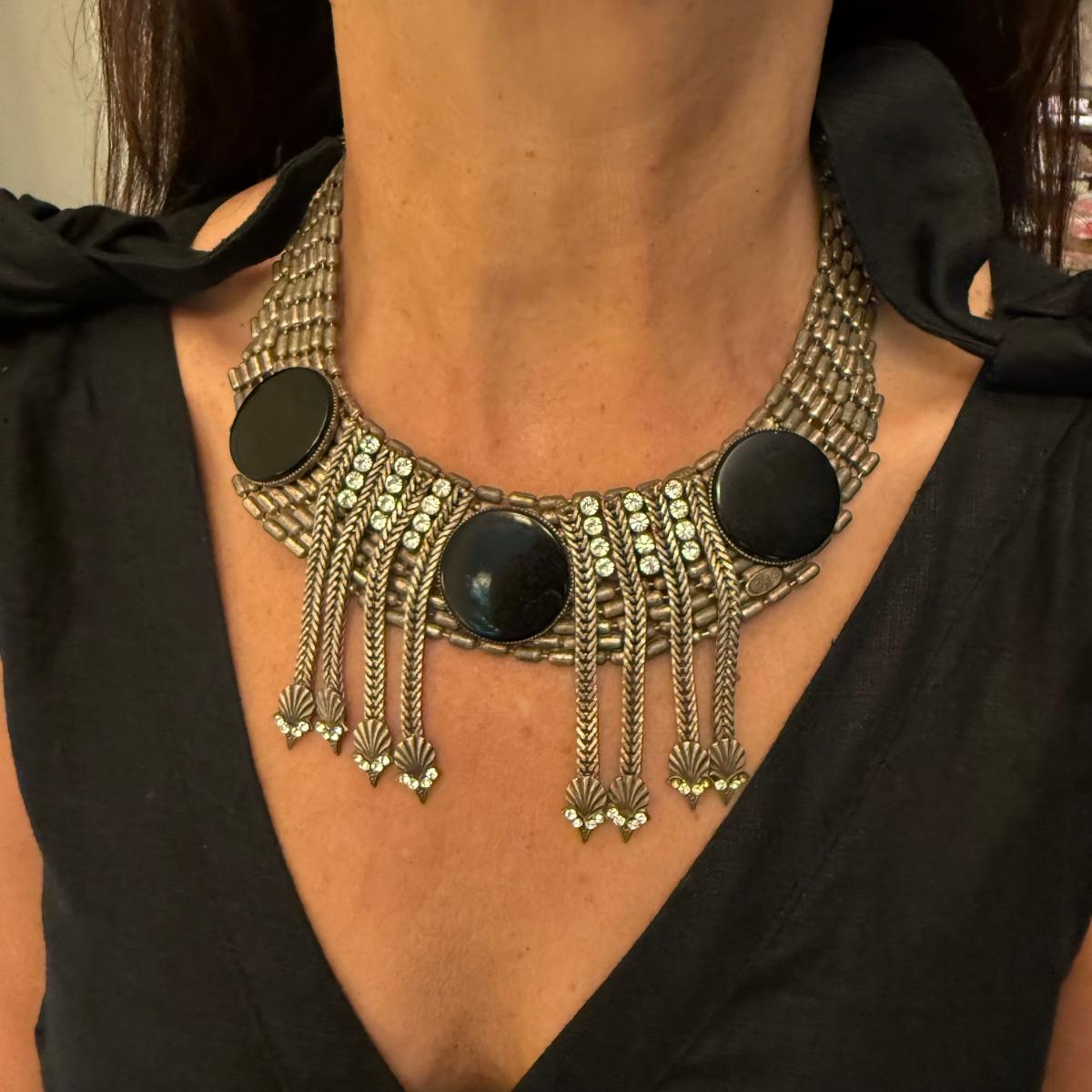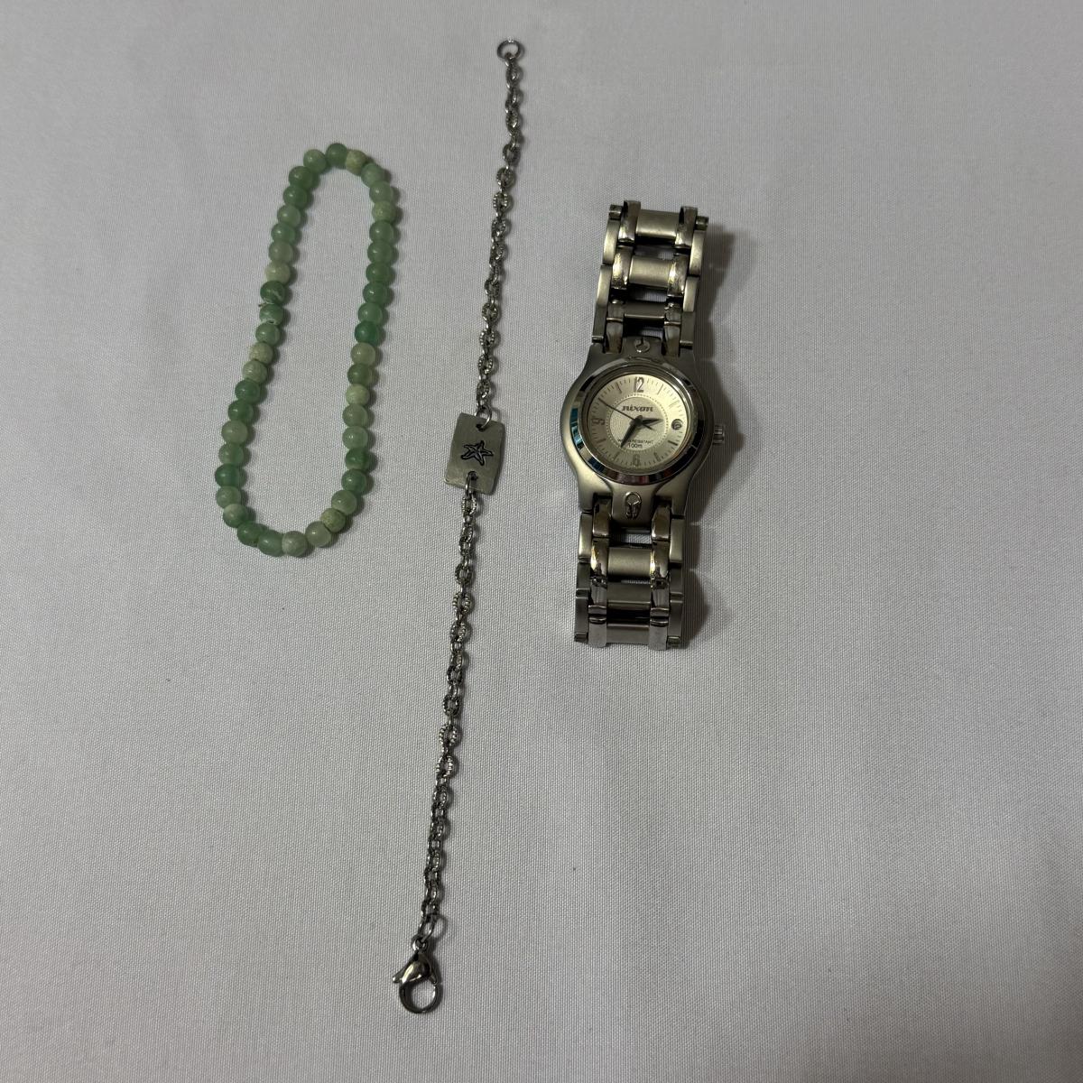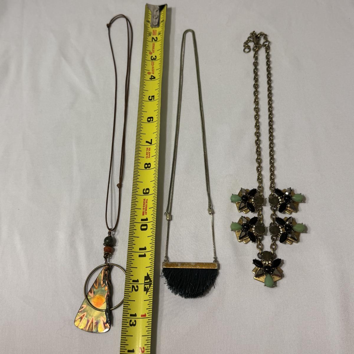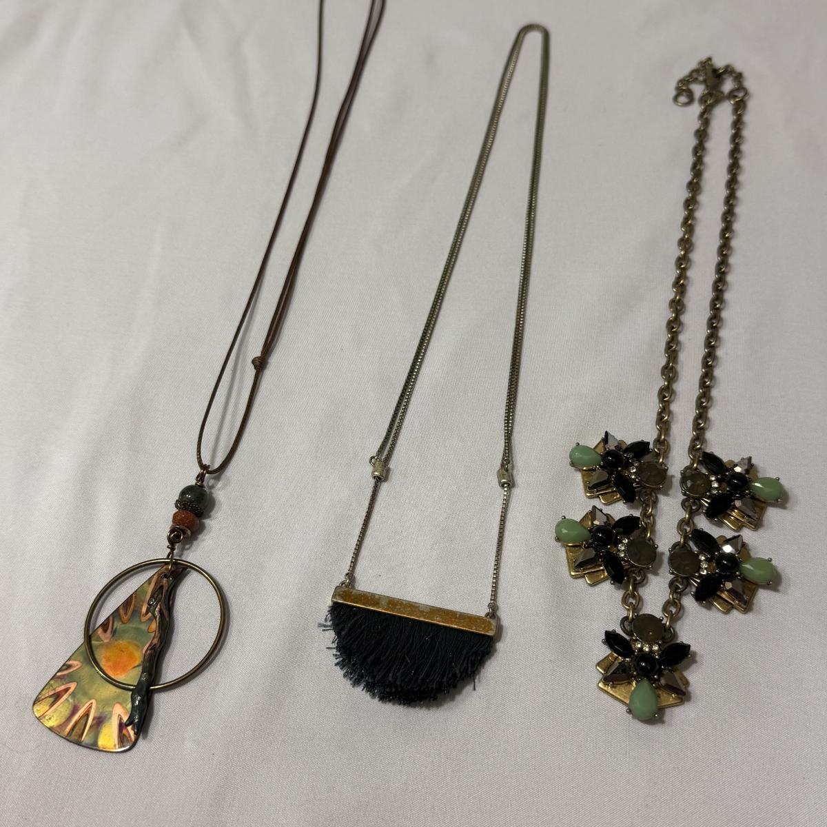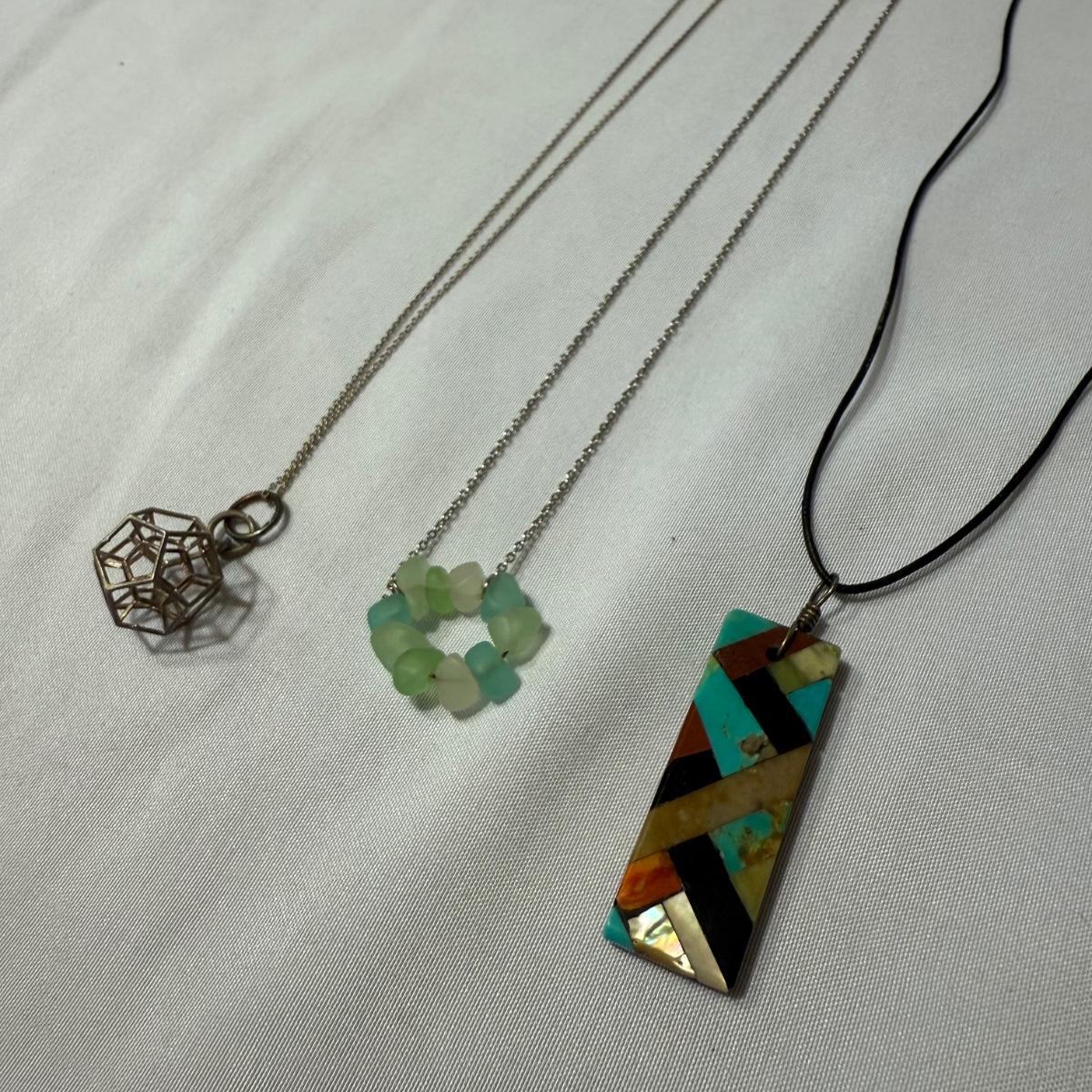An eclectic collection of necklaces, bracelets, and earrings, plus a watch and a belt buckle. There are 11 necklaces, two bracelets, 11 pairs of earrings for pierced ears (plus some single earrings), and two loose pendants. A couple necklace chains are stamped with a Sterling hallmark. Please see photos for inventory and details.
