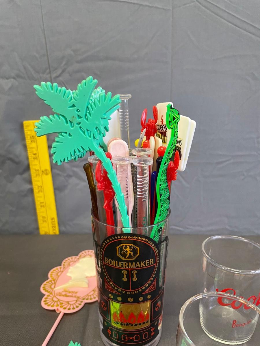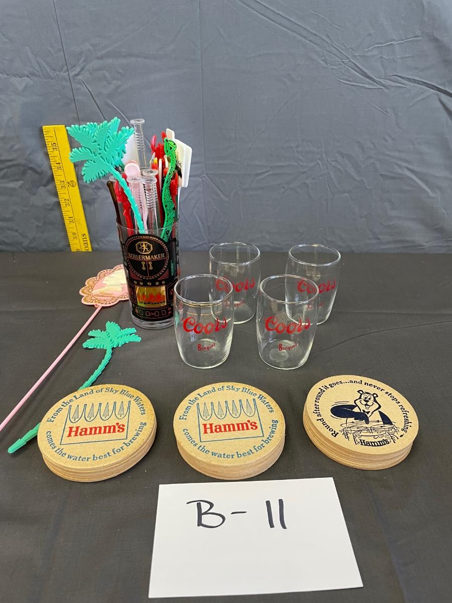 Boilermaker glass/swivel sticks/4 coor’s glasses/Hamm’s beer coasters