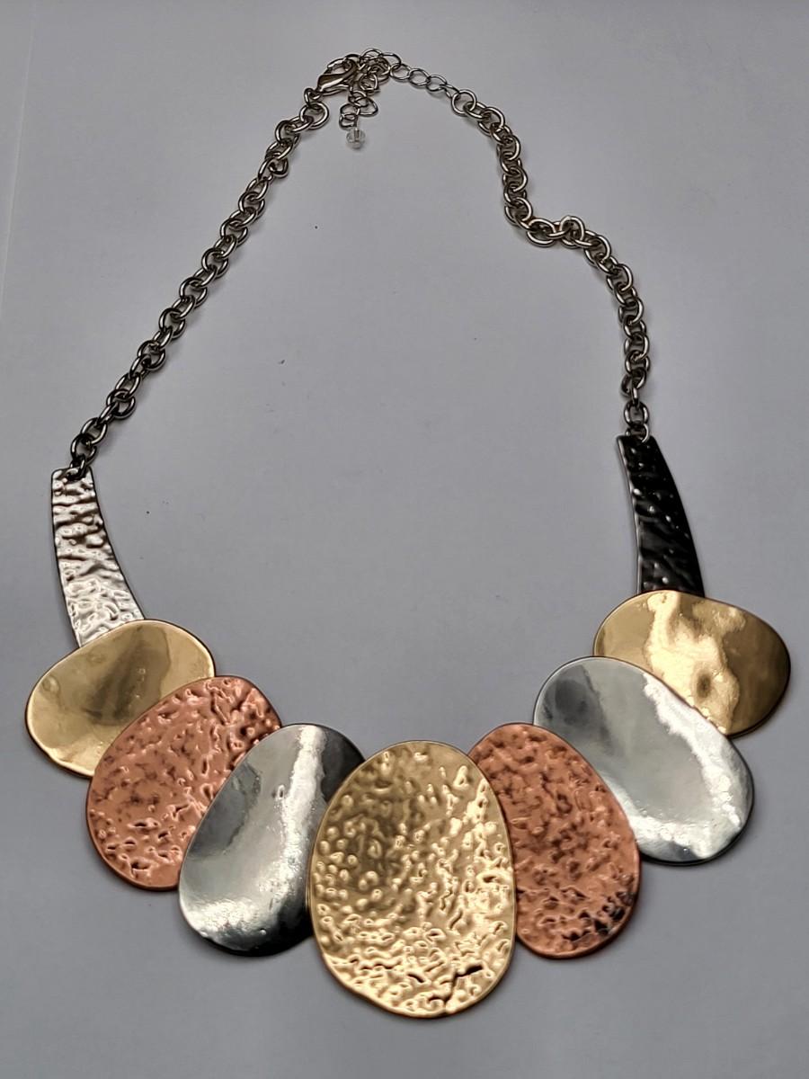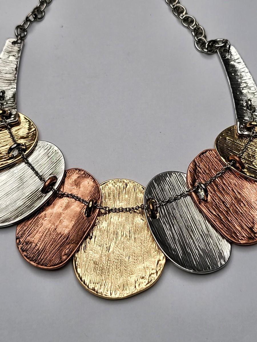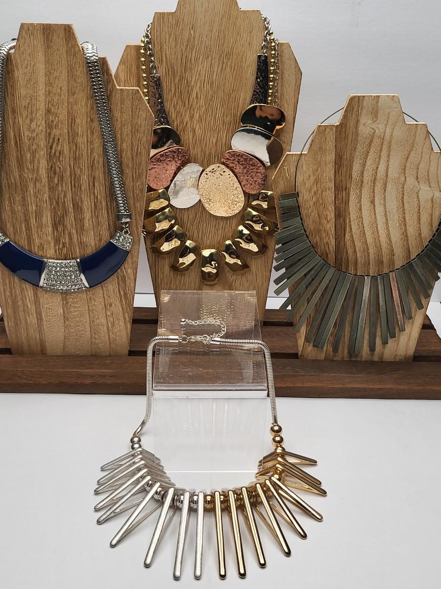 Six various bold, statement necklaces. Enamel, rhinestones, silver tone, gold tone, copper & bronze tone. 14" to 18" lengths with extenders.