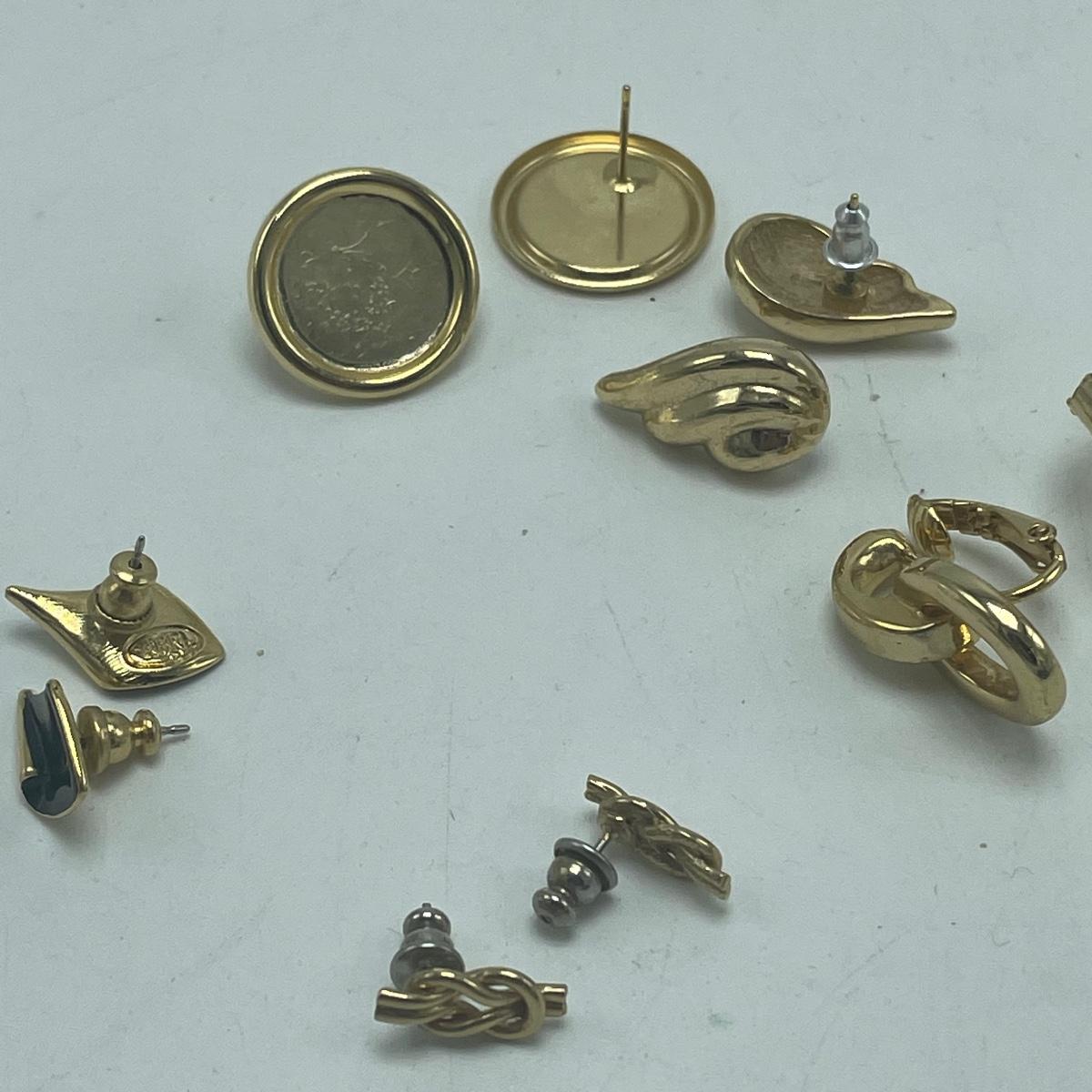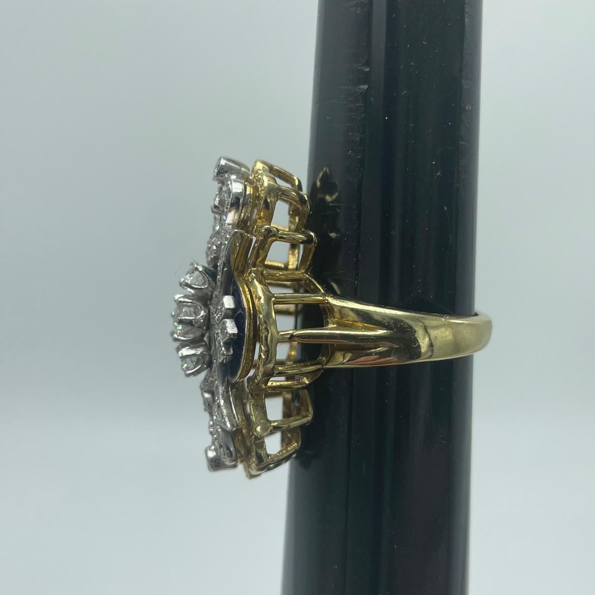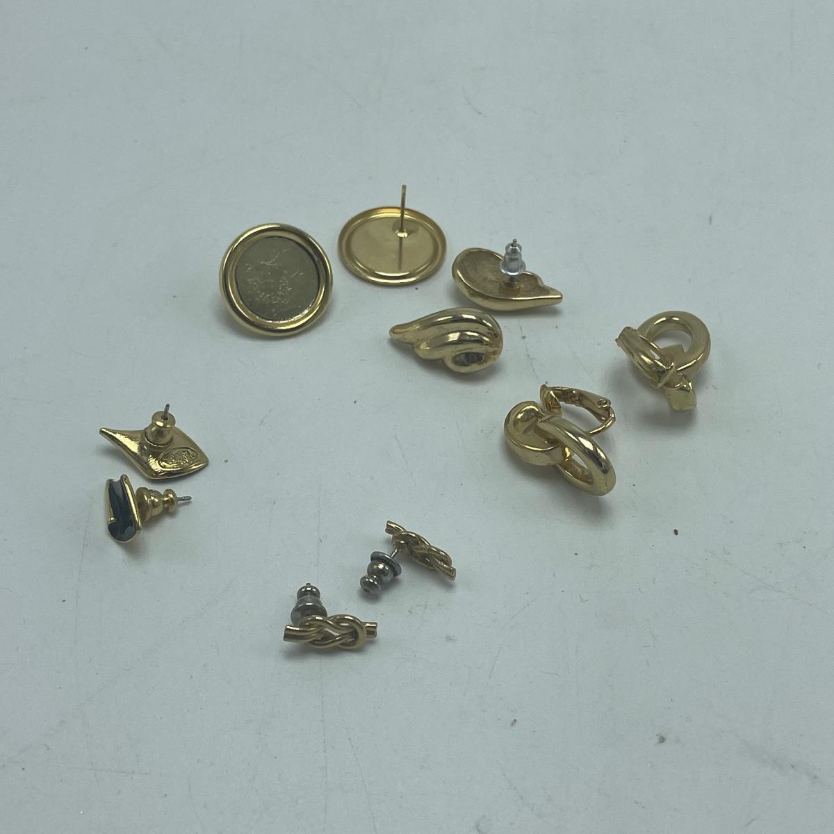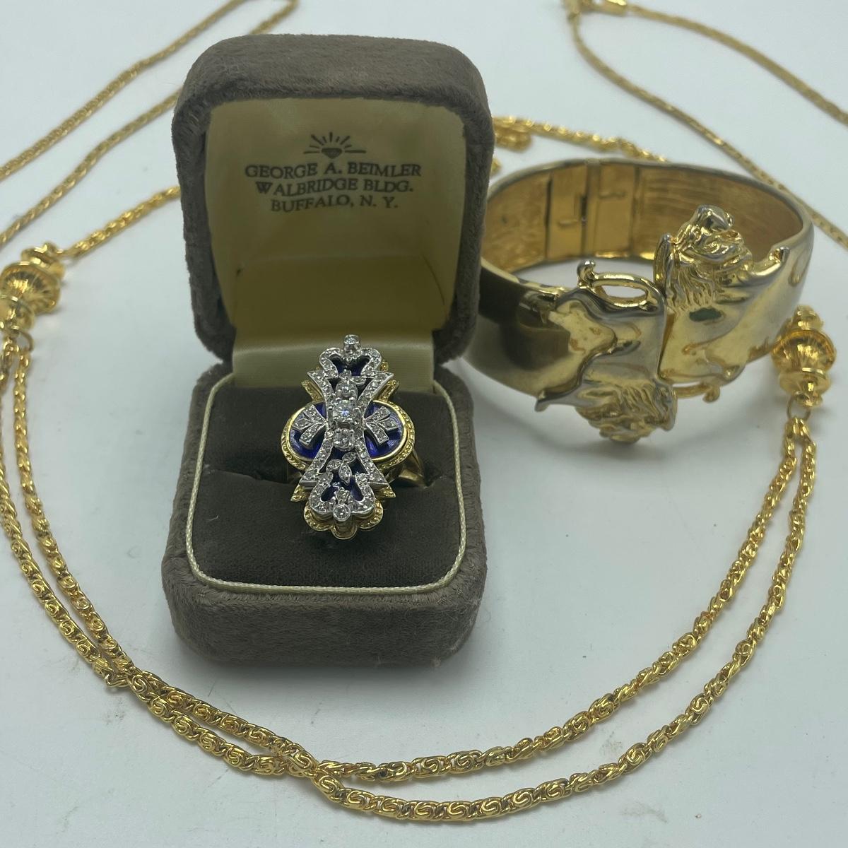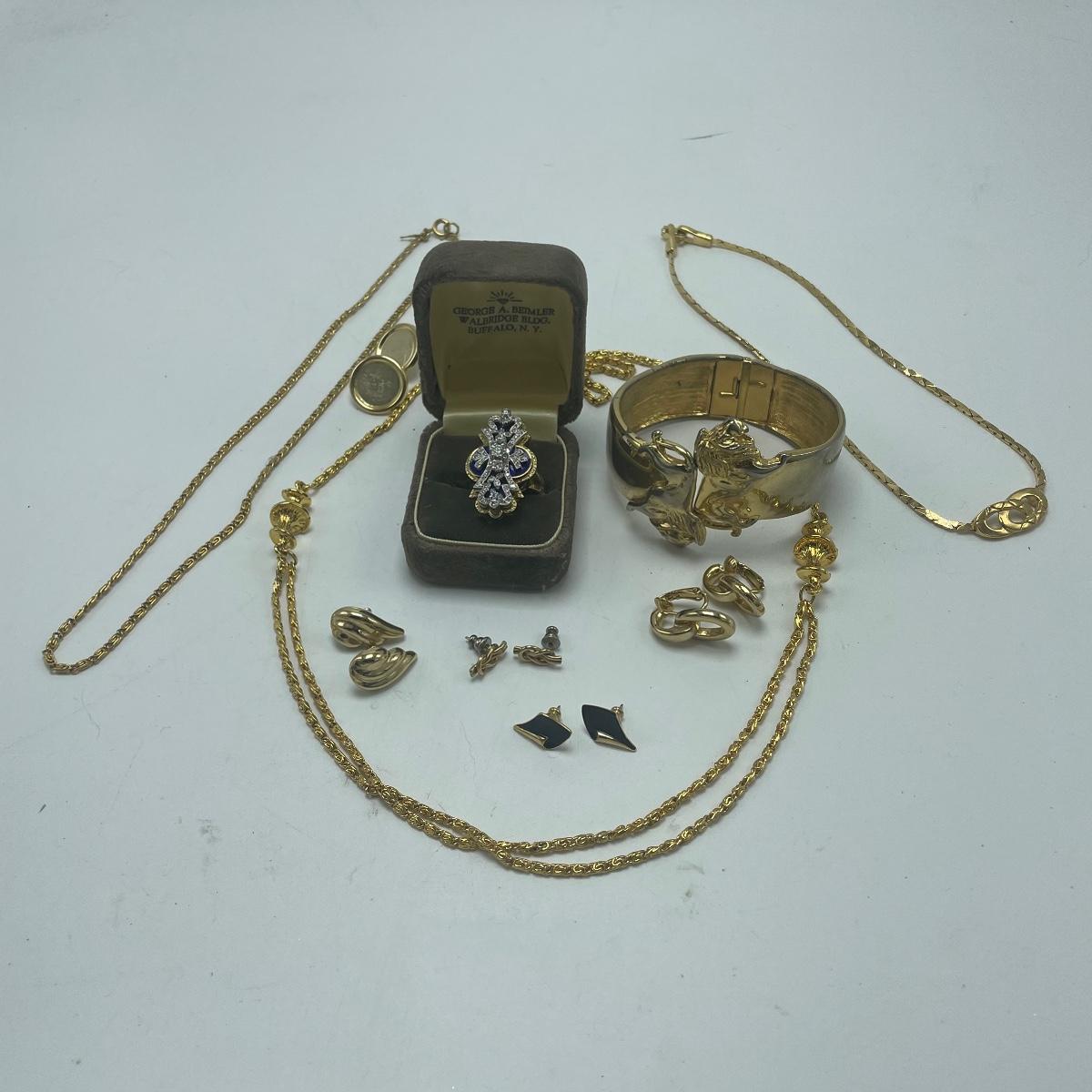 Some gorgeous statement pieces in this lot. The huge ring is stunning with cobalt blue and faux diamonds on a golden band. Lot also includes three necklaces, cuff style bracelet and five pairs of earrings; there is one pair of clip-ons, and the rest are for pierced ears. No gold markings were found.