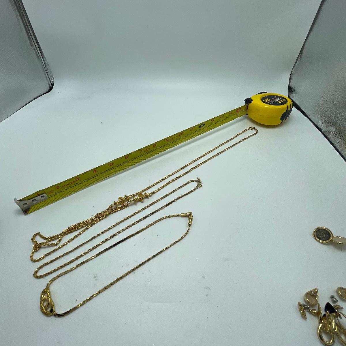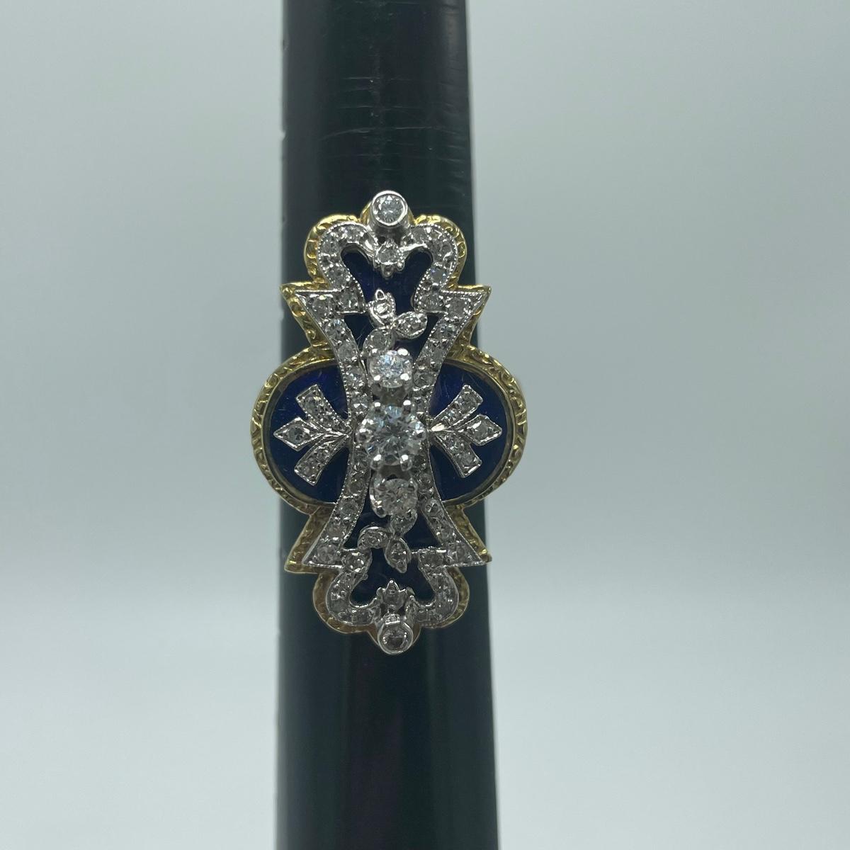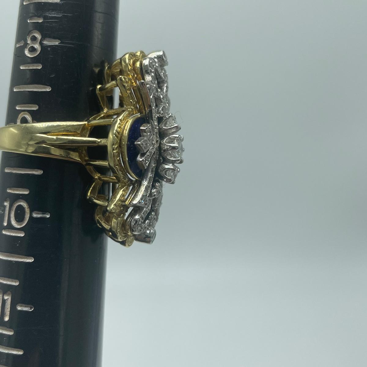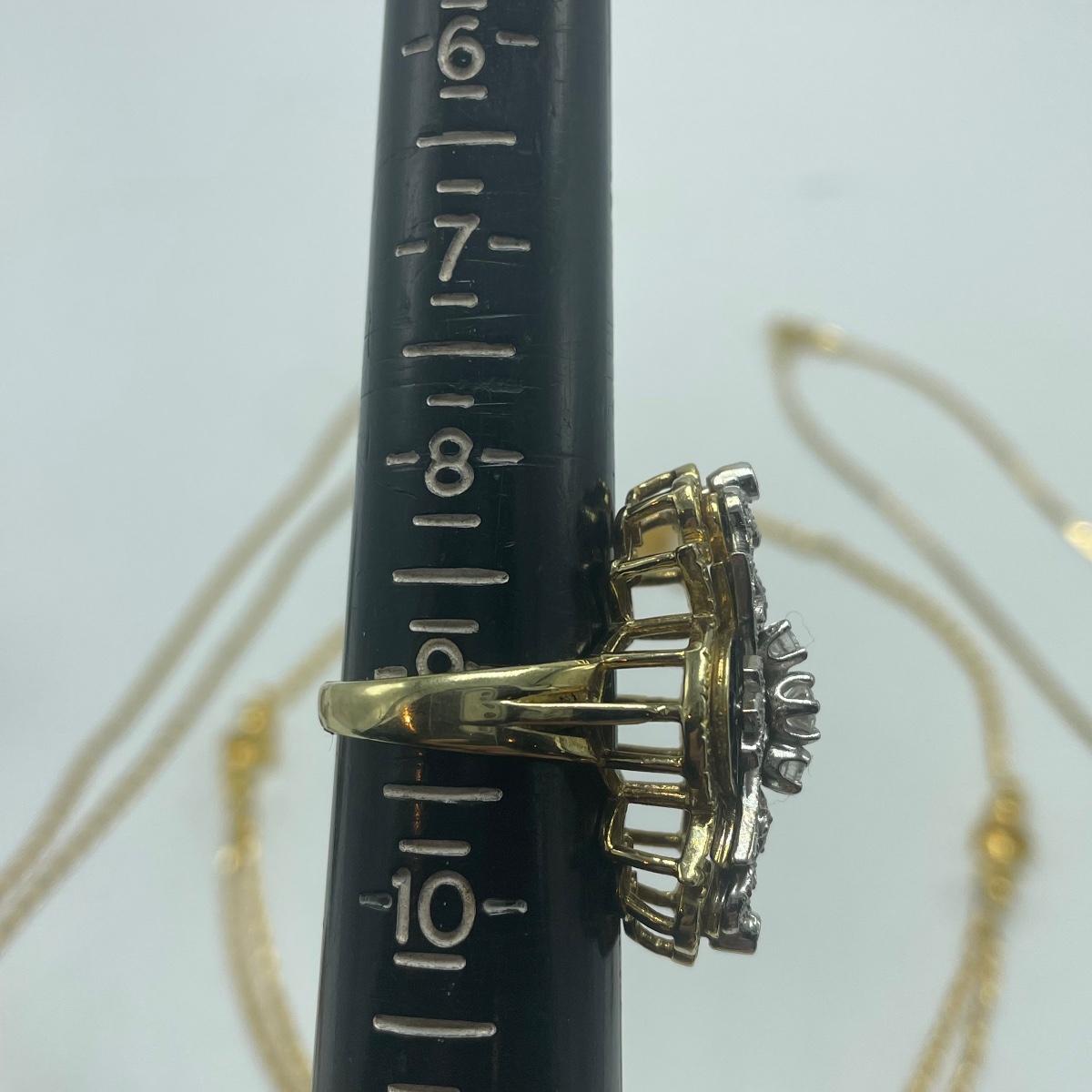 Some gorgeous statement pieces in this lot. The huge ring is stunning with cobalt blue and faux diamonds on a golden band. Lot also includes three necklaces, cuff style bracelet and five pairs of earrings; there is one pair of clip-ons, and the rest are for pierced ears. No gold markings were found.