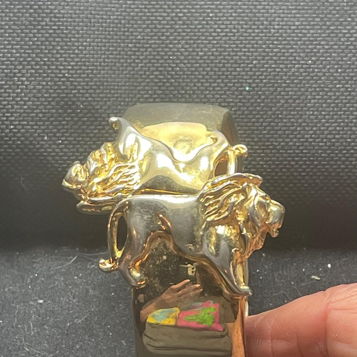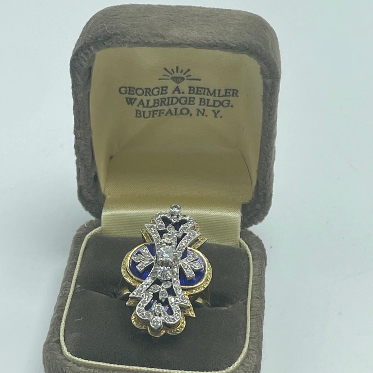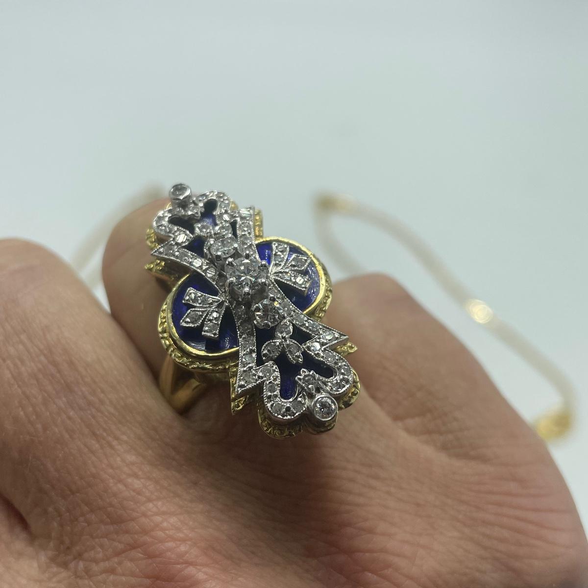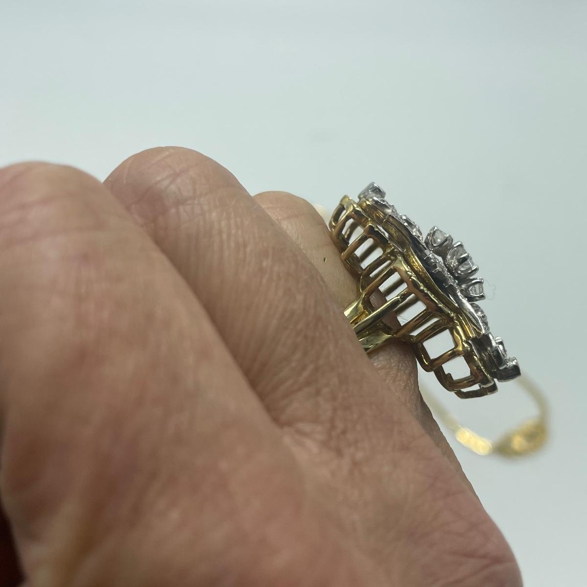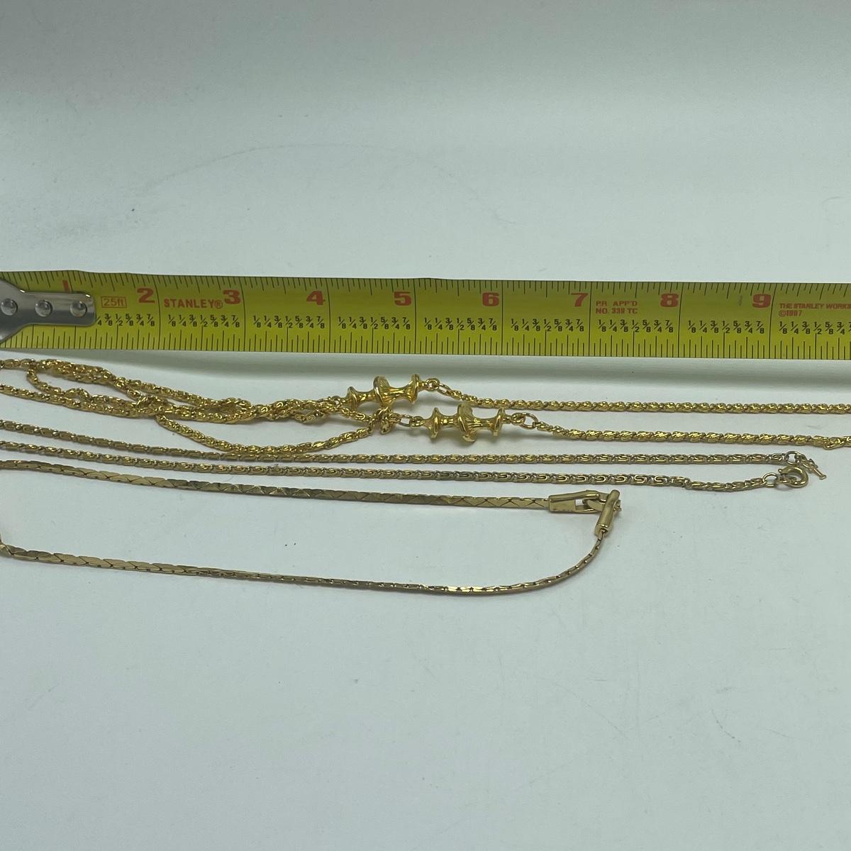 Some gorgeous statement pieces in this lot. The huge ring is stunning with cobalt blue and faux diamonds on a golden band. Lot also includes three necklaces, cuff style bracelet and five pairs of earrings; there is one pair of clip-ons, and the rest are for pierced ears. No gold markings were found.