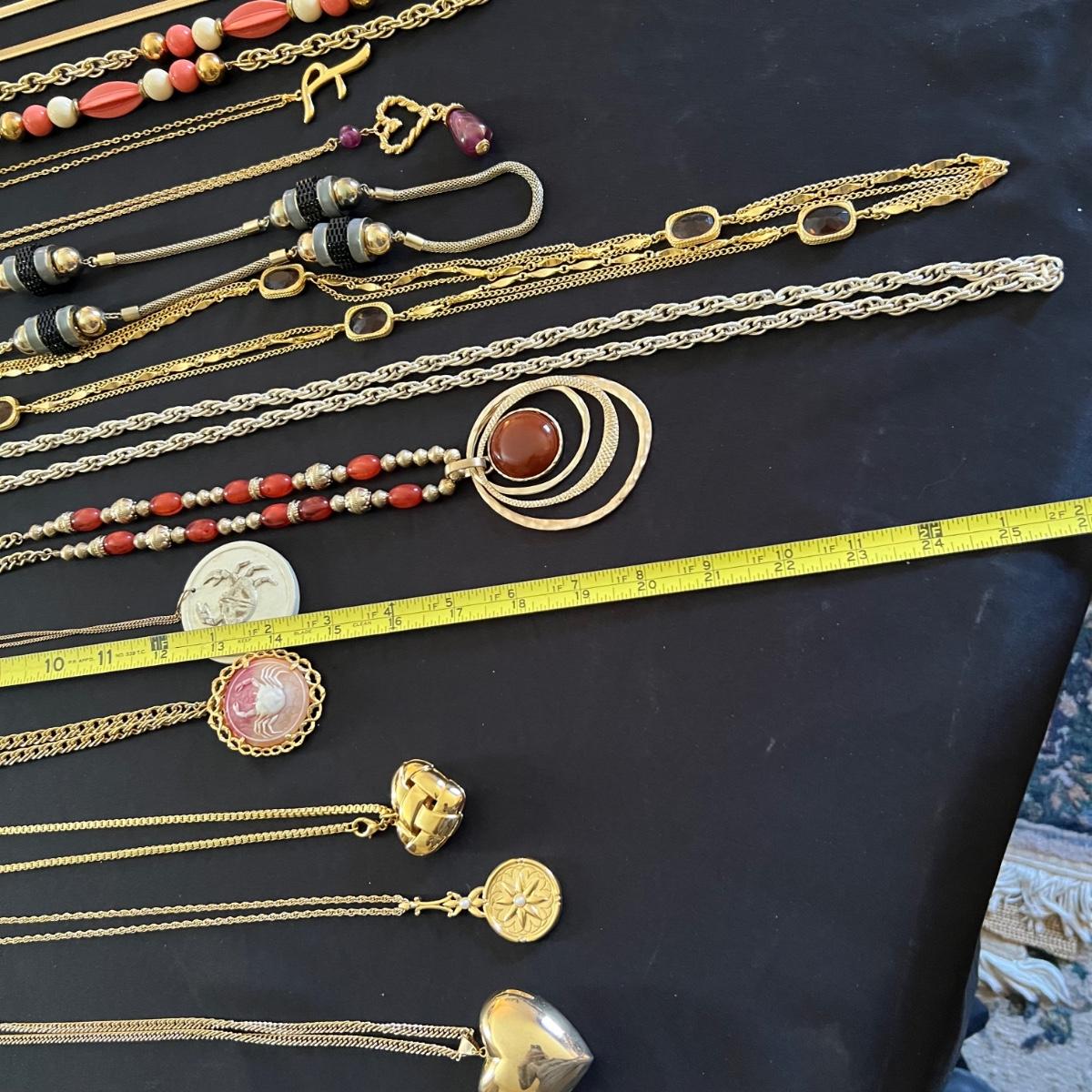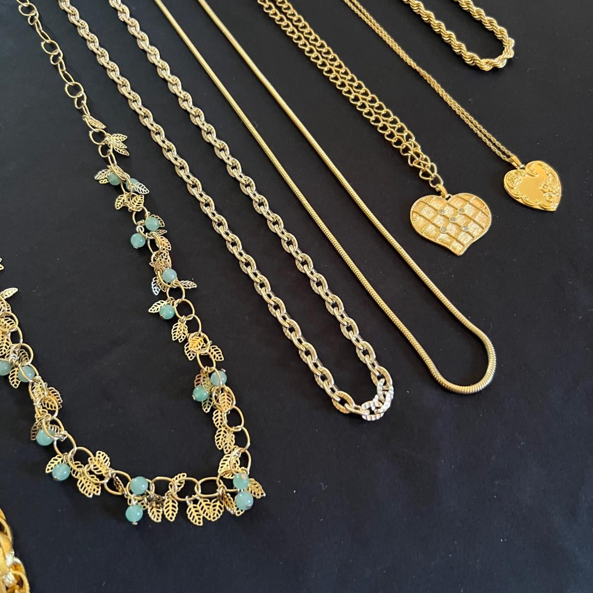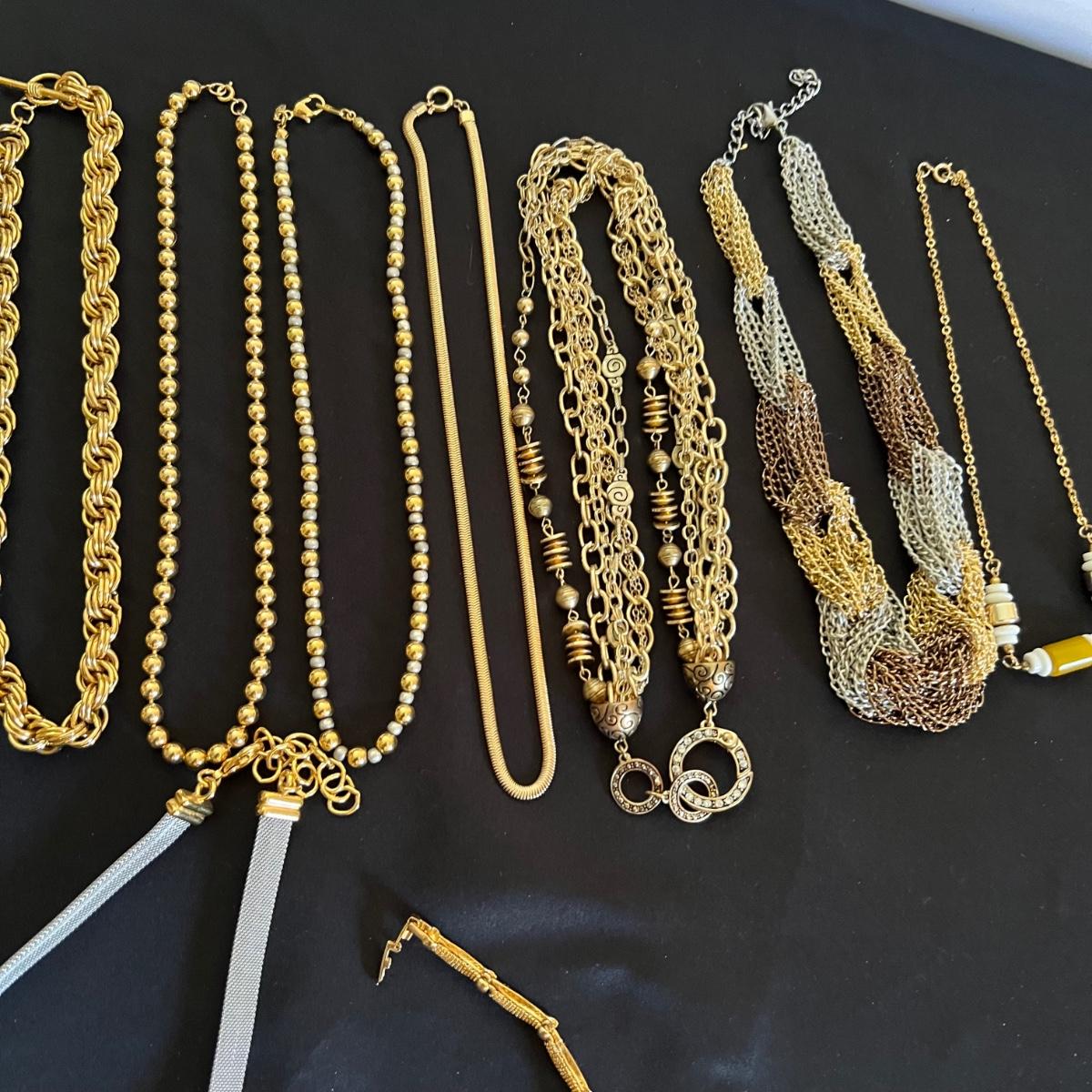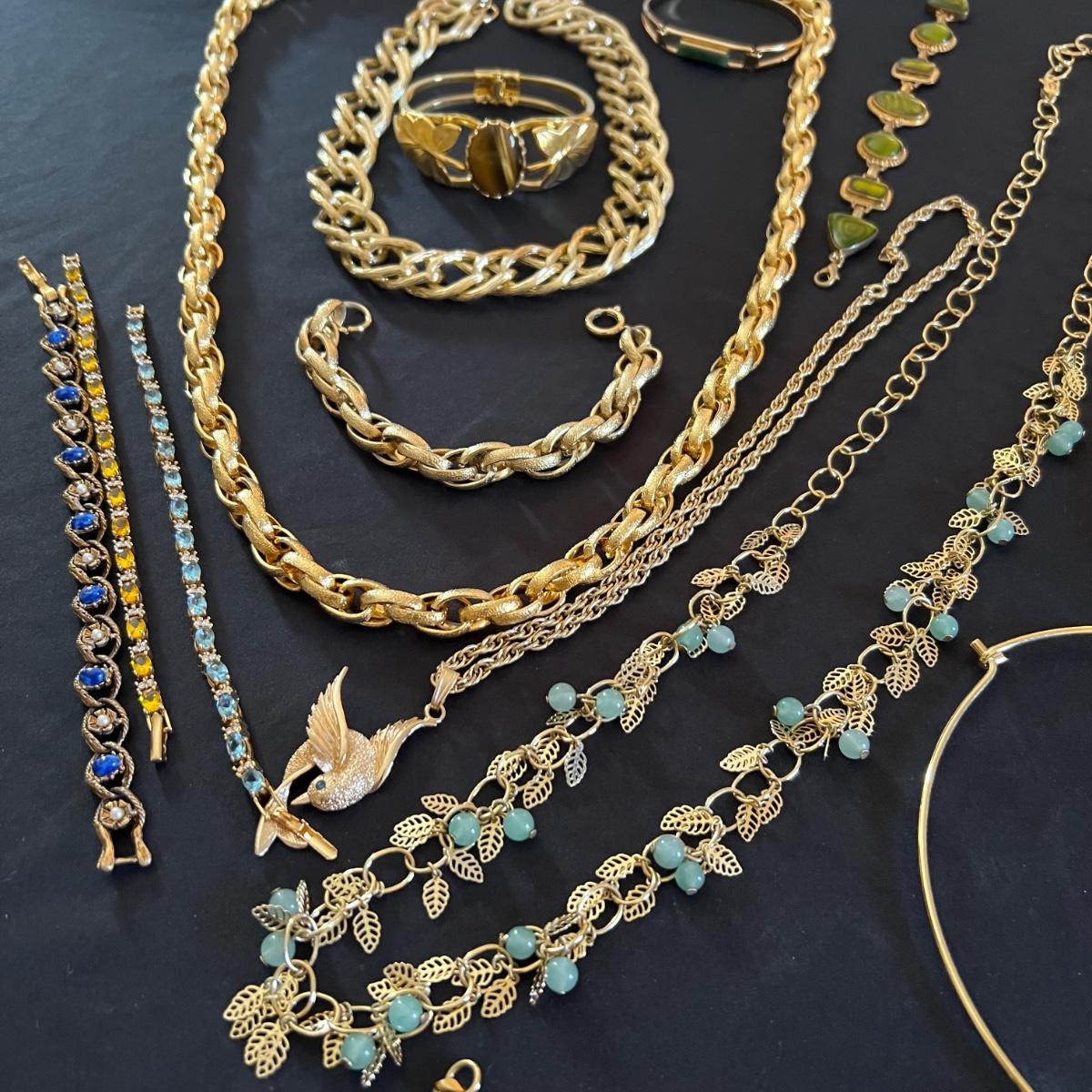 Huge assortment of gold colored necklaces and bracelets. See images for full inventory and measurements. 20 plus bracelets includes tennis, bangles, cuff and more. 40 plus necklaces includes chokers up to very long chains plus a single pendant with a small red flower that has the look of Cloisonné.