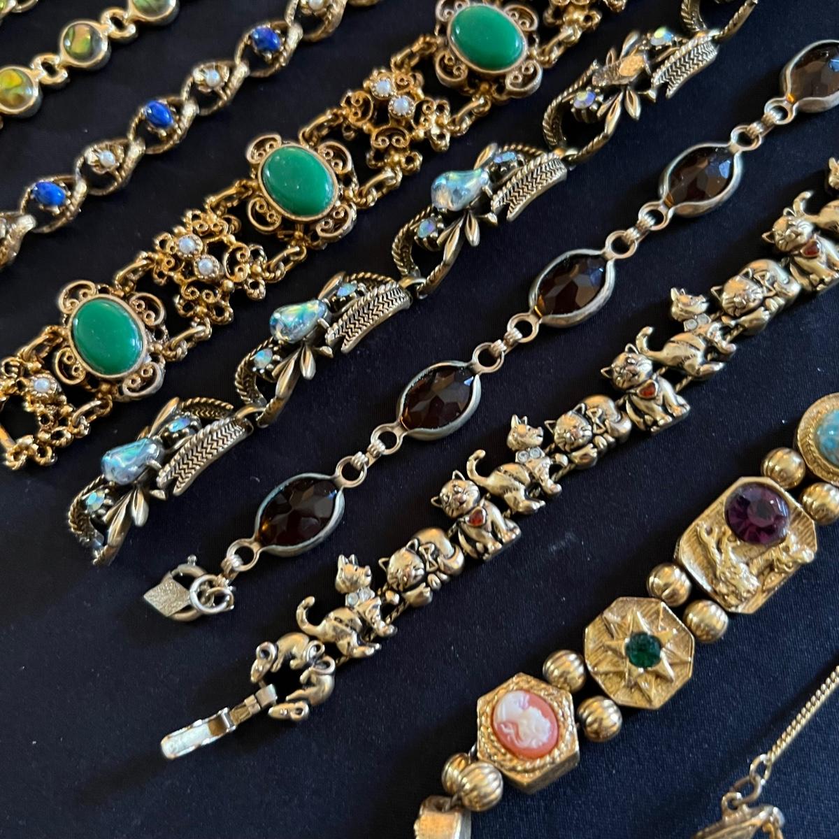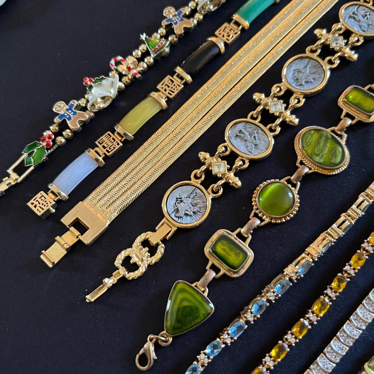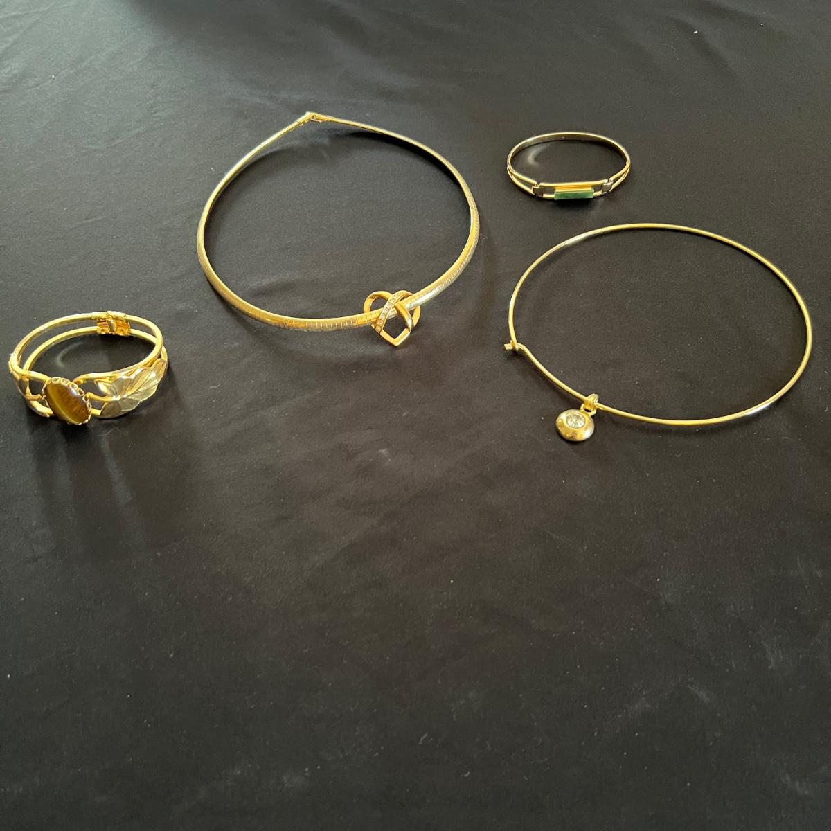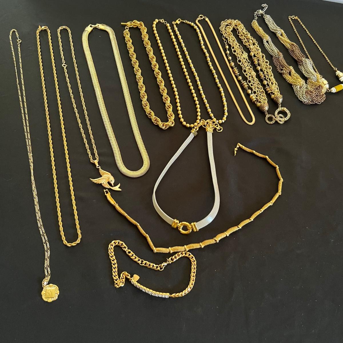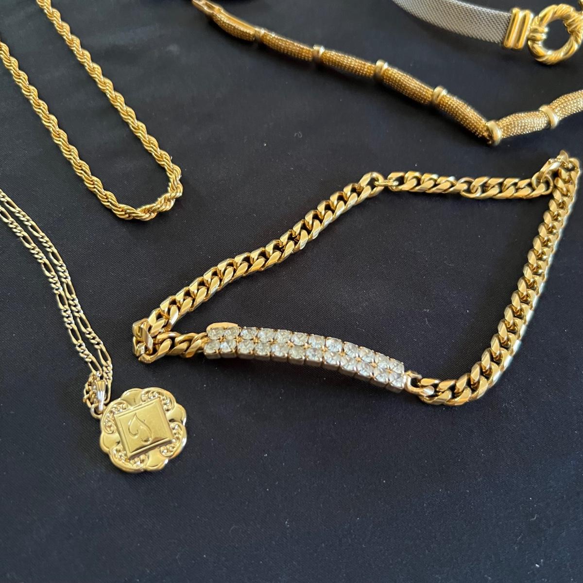 Huge assortment of gold colored necklaces and bracelets. See images for full inventory and measurements. 20 plus bracelets includes tennis, bangles, cuff and more. 40 plus necklaces includes chokers up to very long chains plus a single pendant with a small red flower that has the look of Cloisonné.