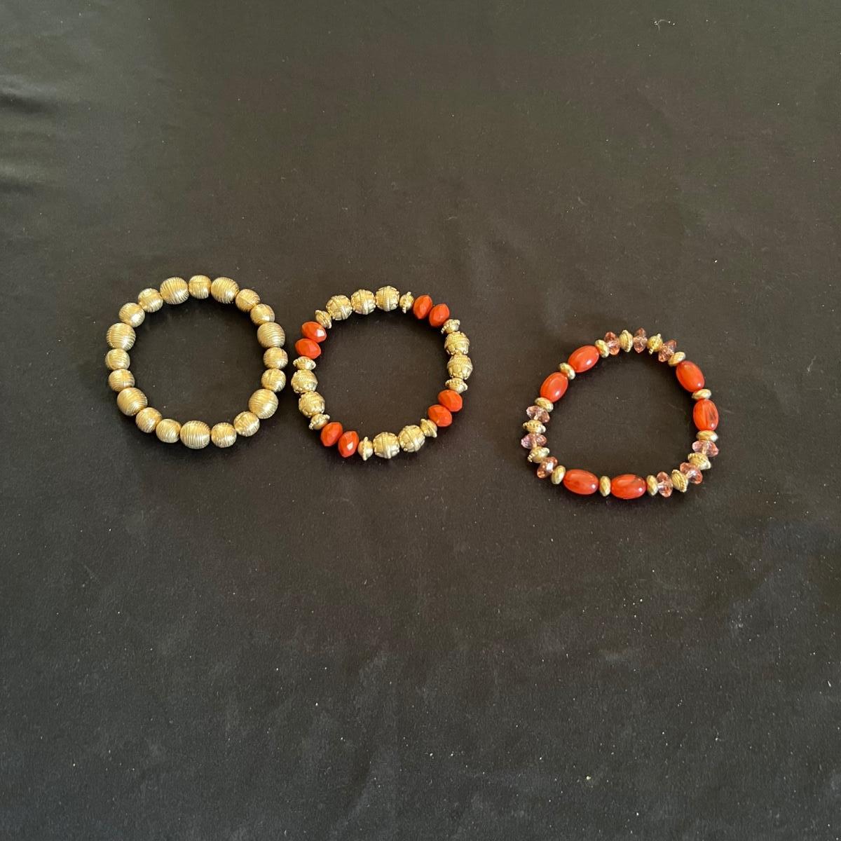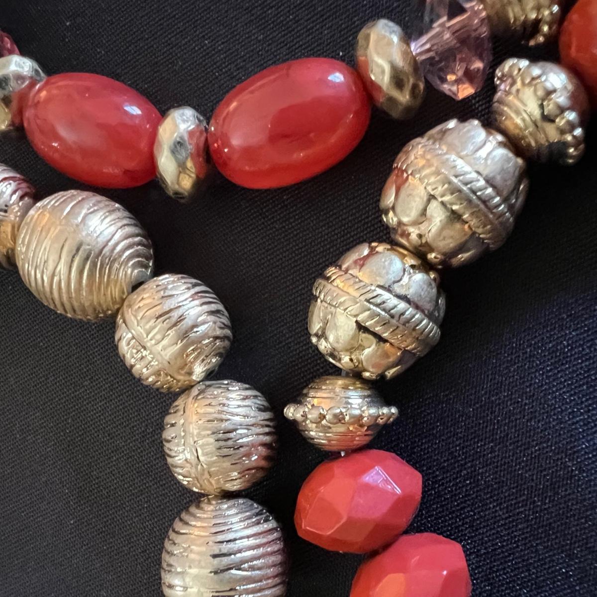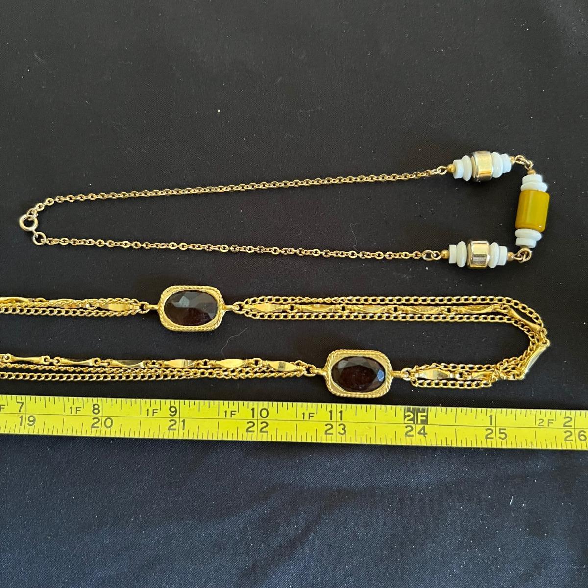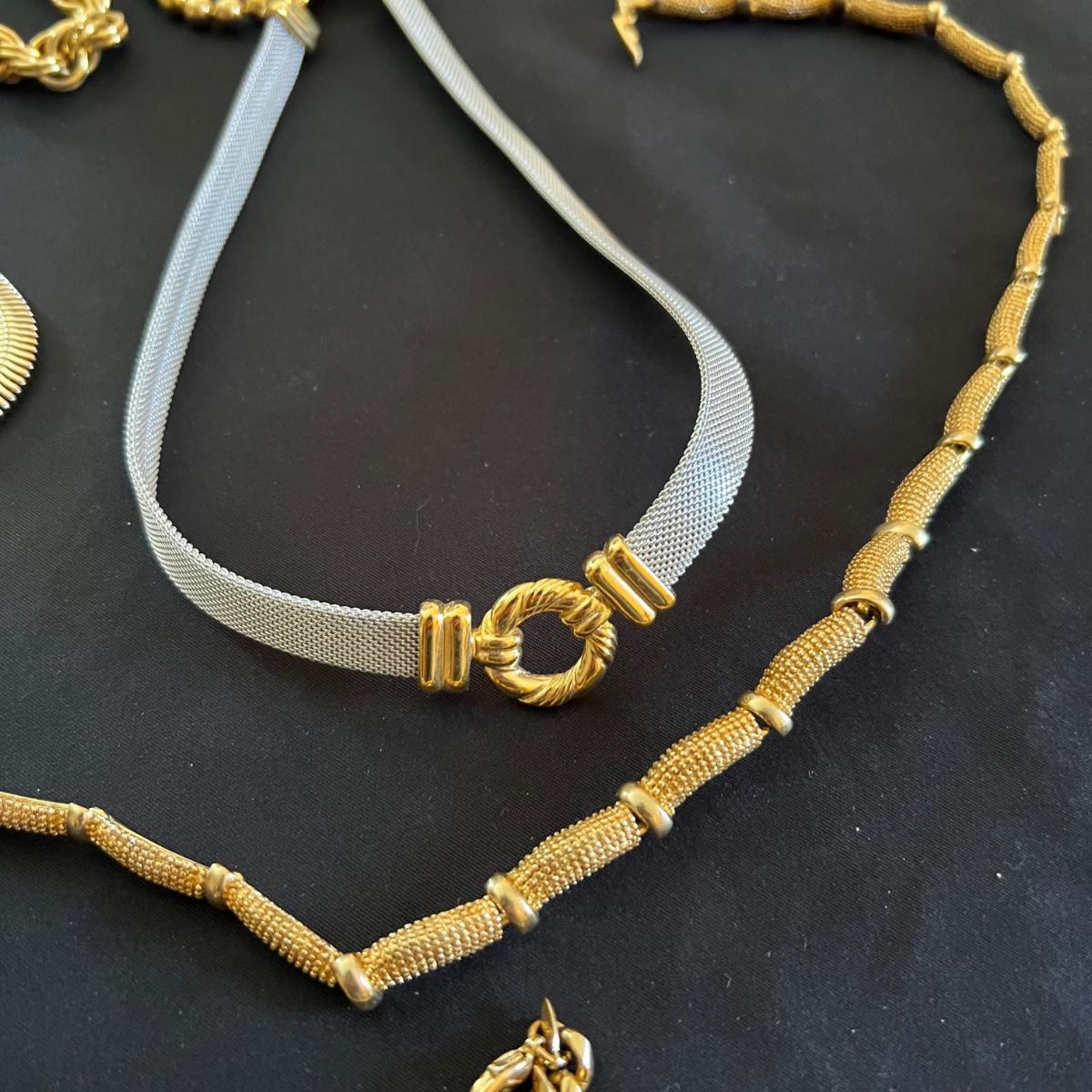 Huge assortment of gold colored necklaces and bracelets. See images for full inventory and measurements. 20 plus bracelets includes tennis, bangles, cuff and more. 40 plus necklaces includes chokers up to very long chains plus a single pendant with a small red flower that has the look of Cloisonné.