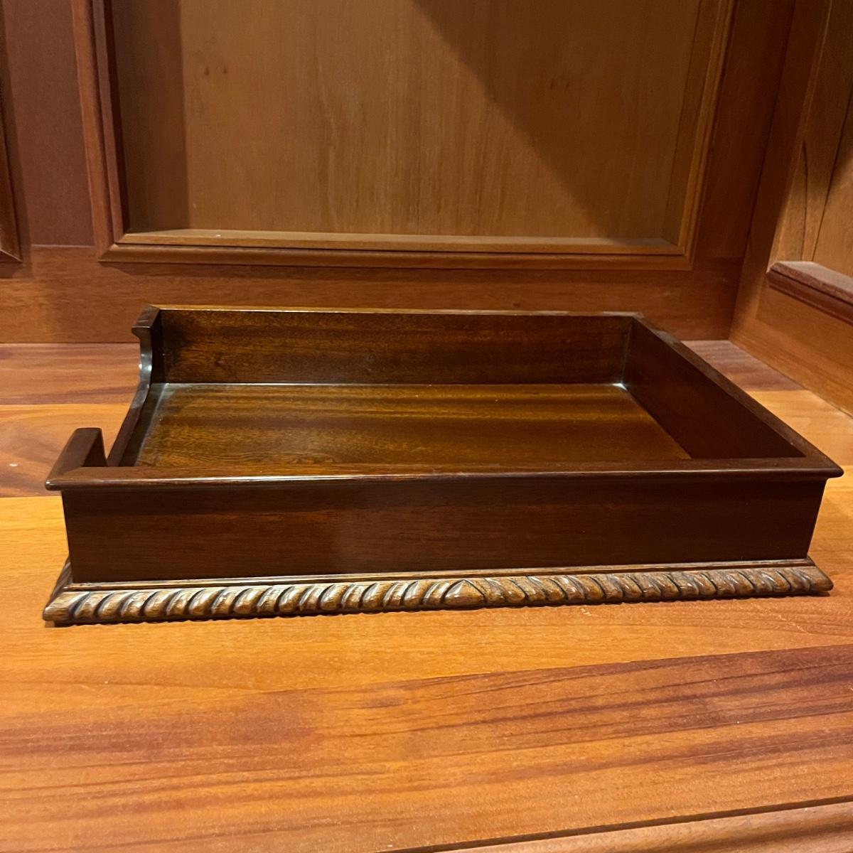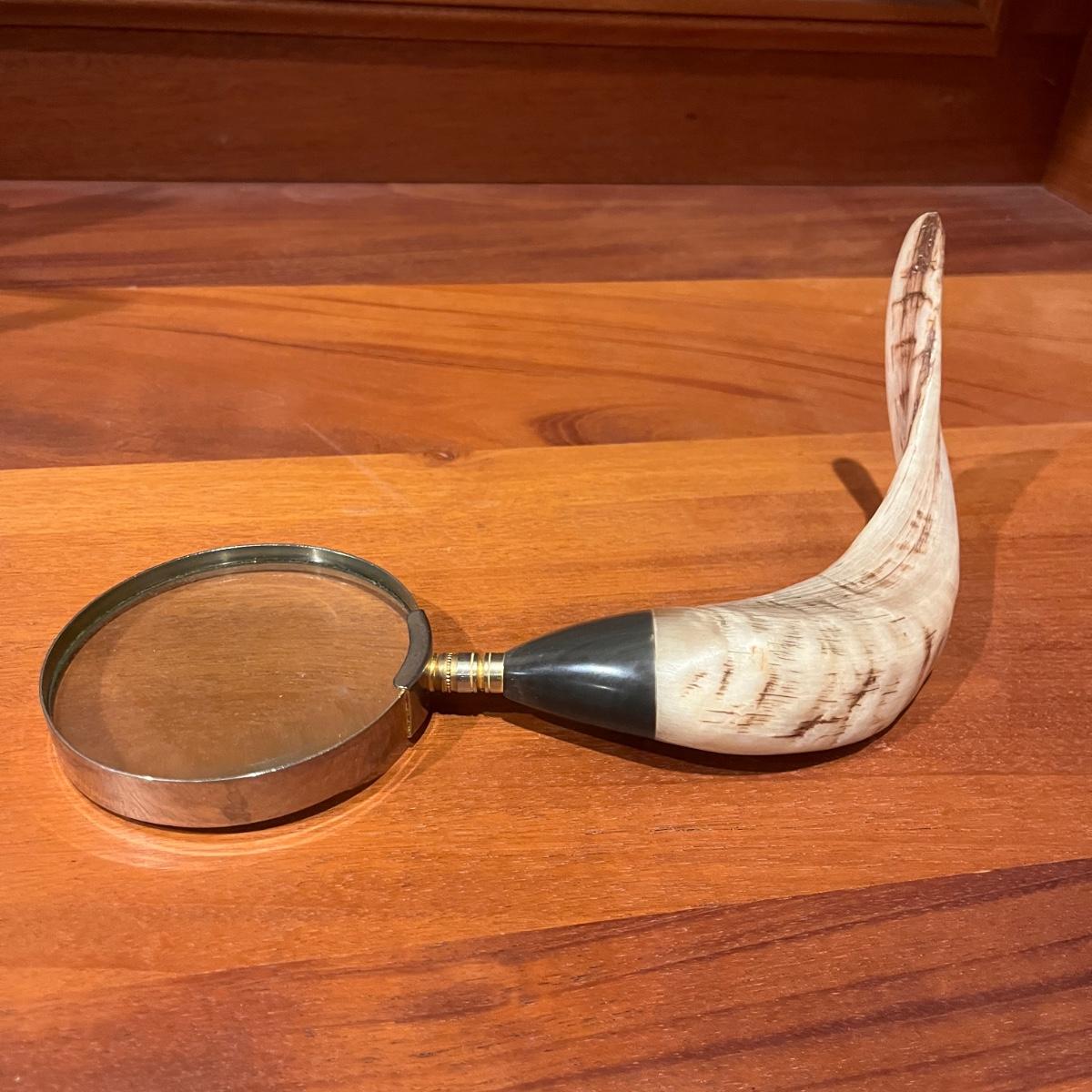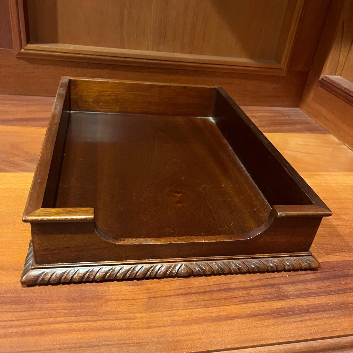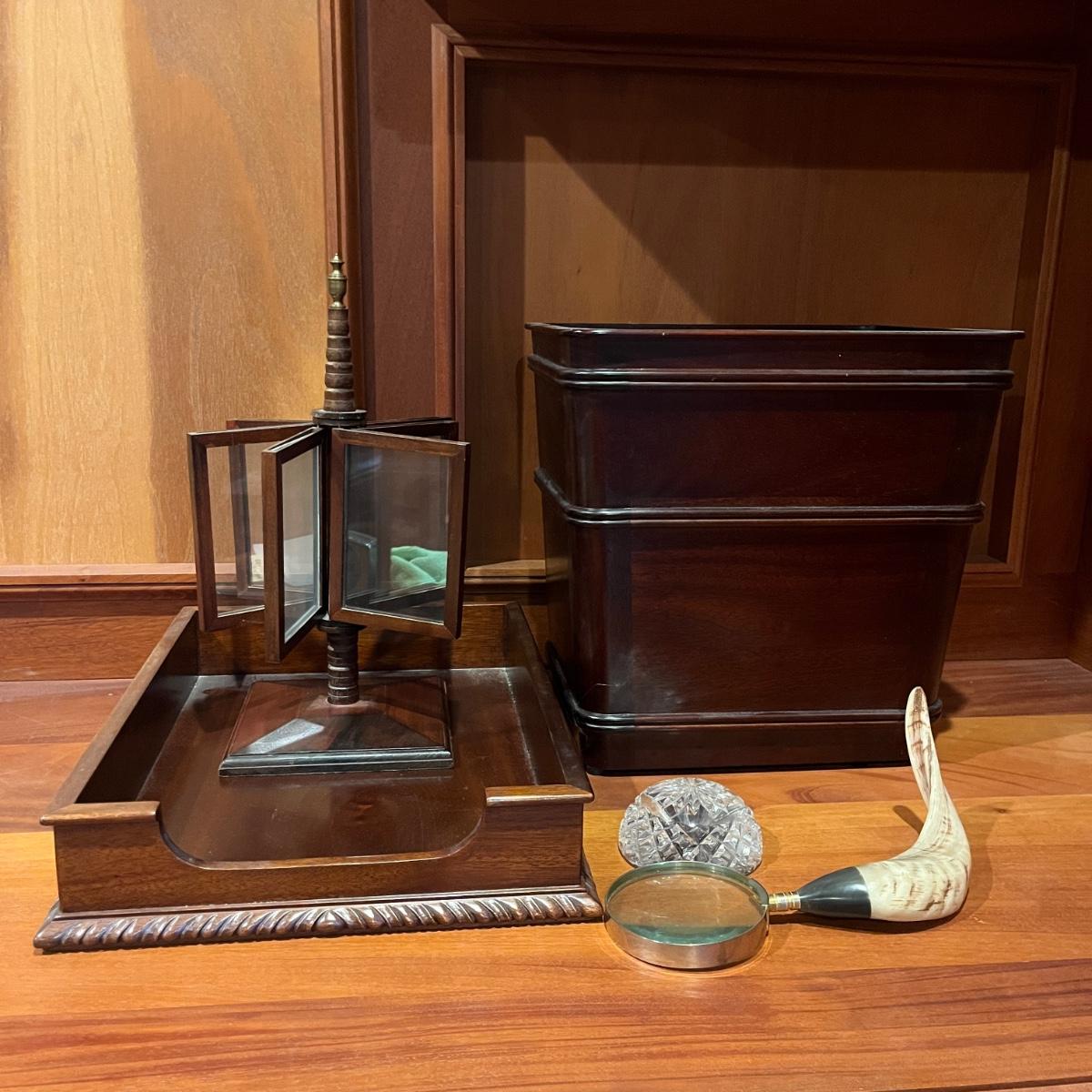 This office lot includes a wooden paper tray, wooden wastebasket with plastic insert, horn handled magnifying glass, glass paperweight and a wooden and glass picture frame. Tray measures 11” x 15” x 3”H.