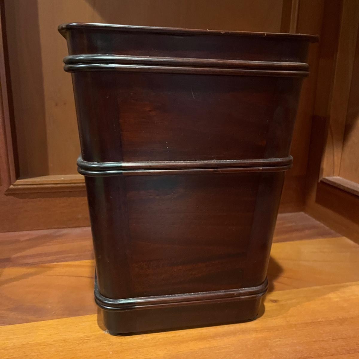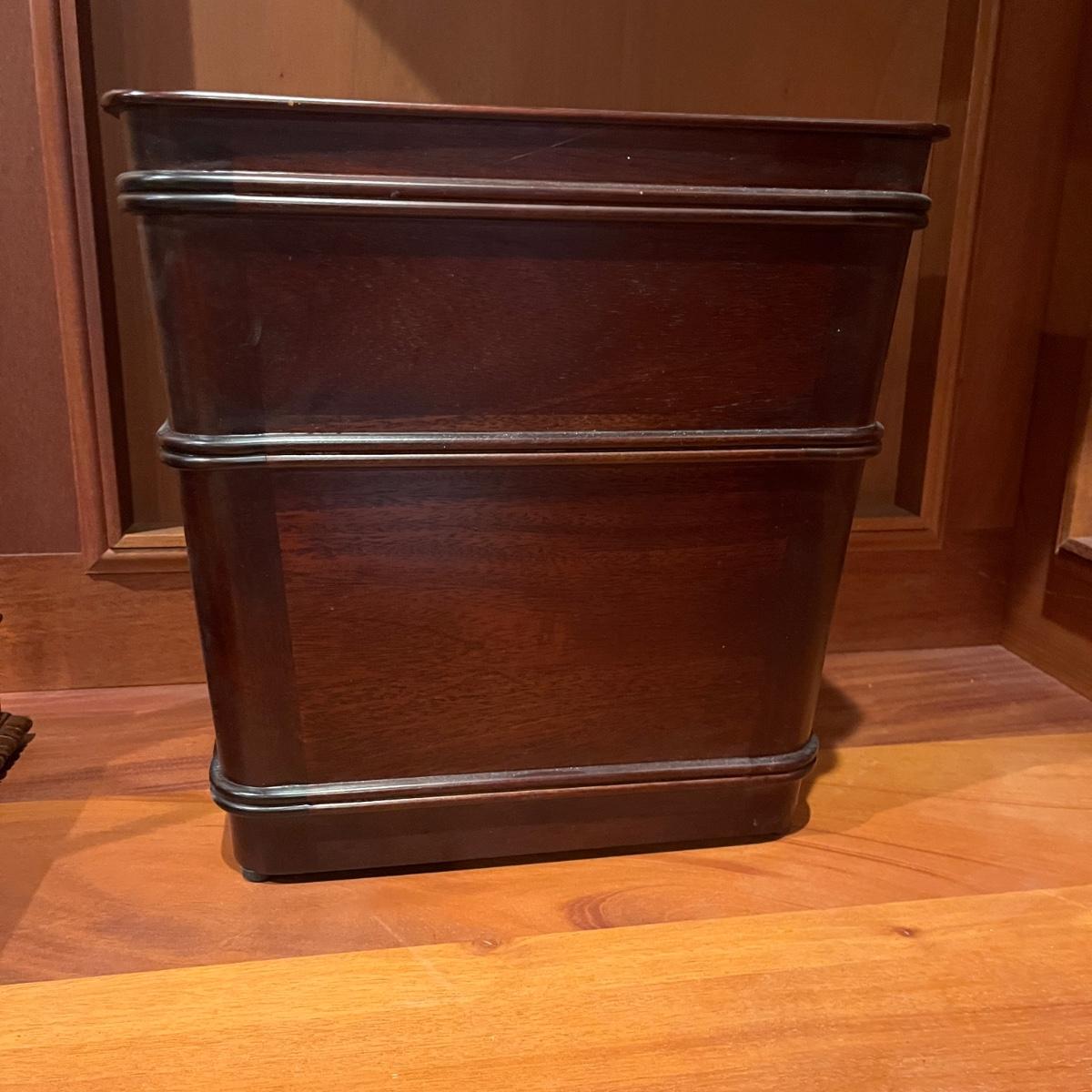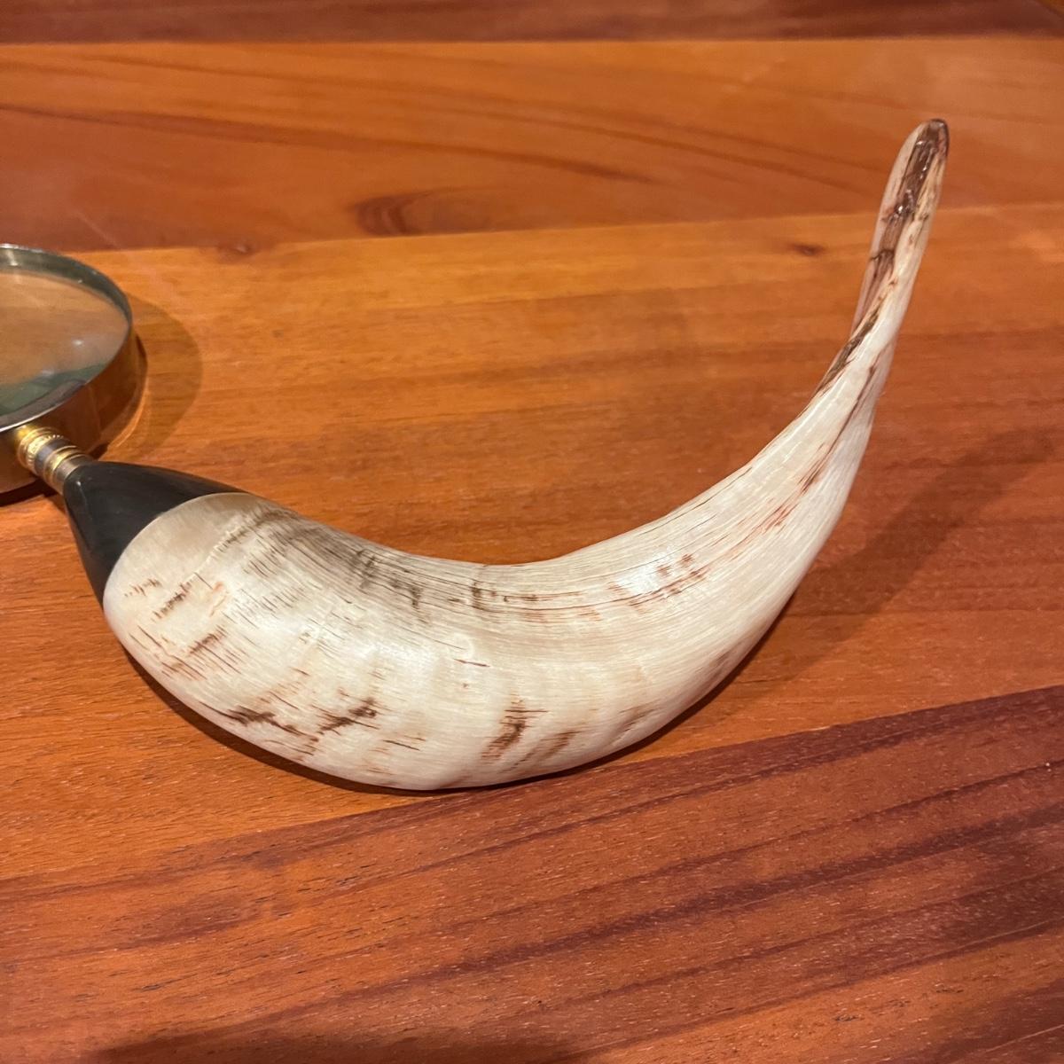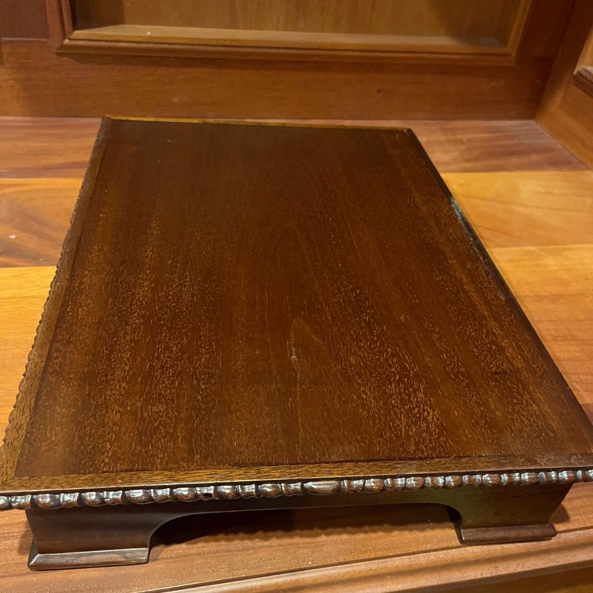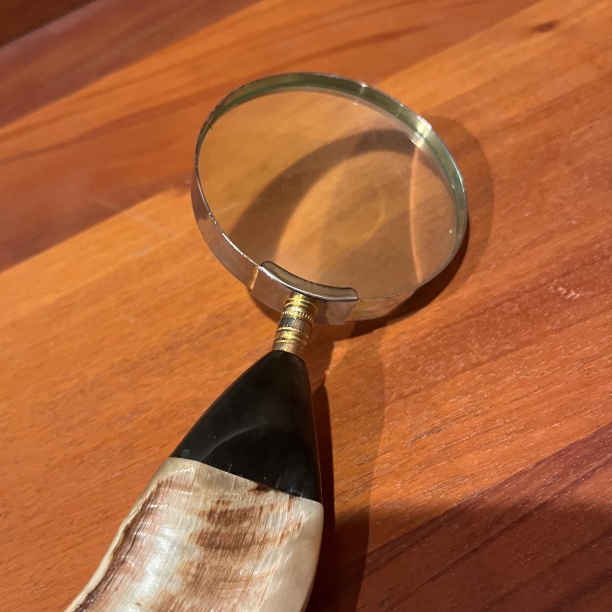 This office lot includes a wooden paper tray, wooden wastebasket with plastic insert, horn handled magnifying glass, glass paperweight and a wooden and glass picture frame. Tray measures 11” x 15” x 3”H.