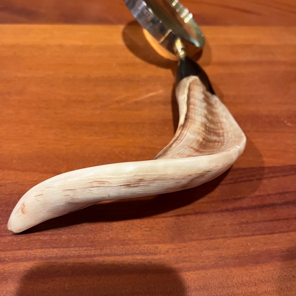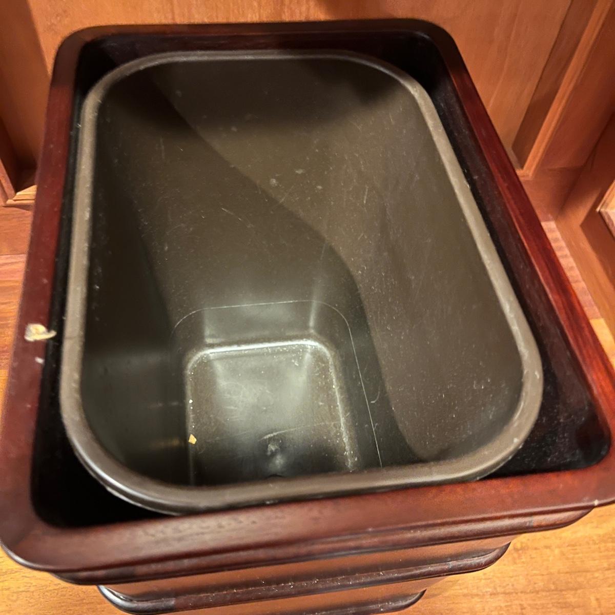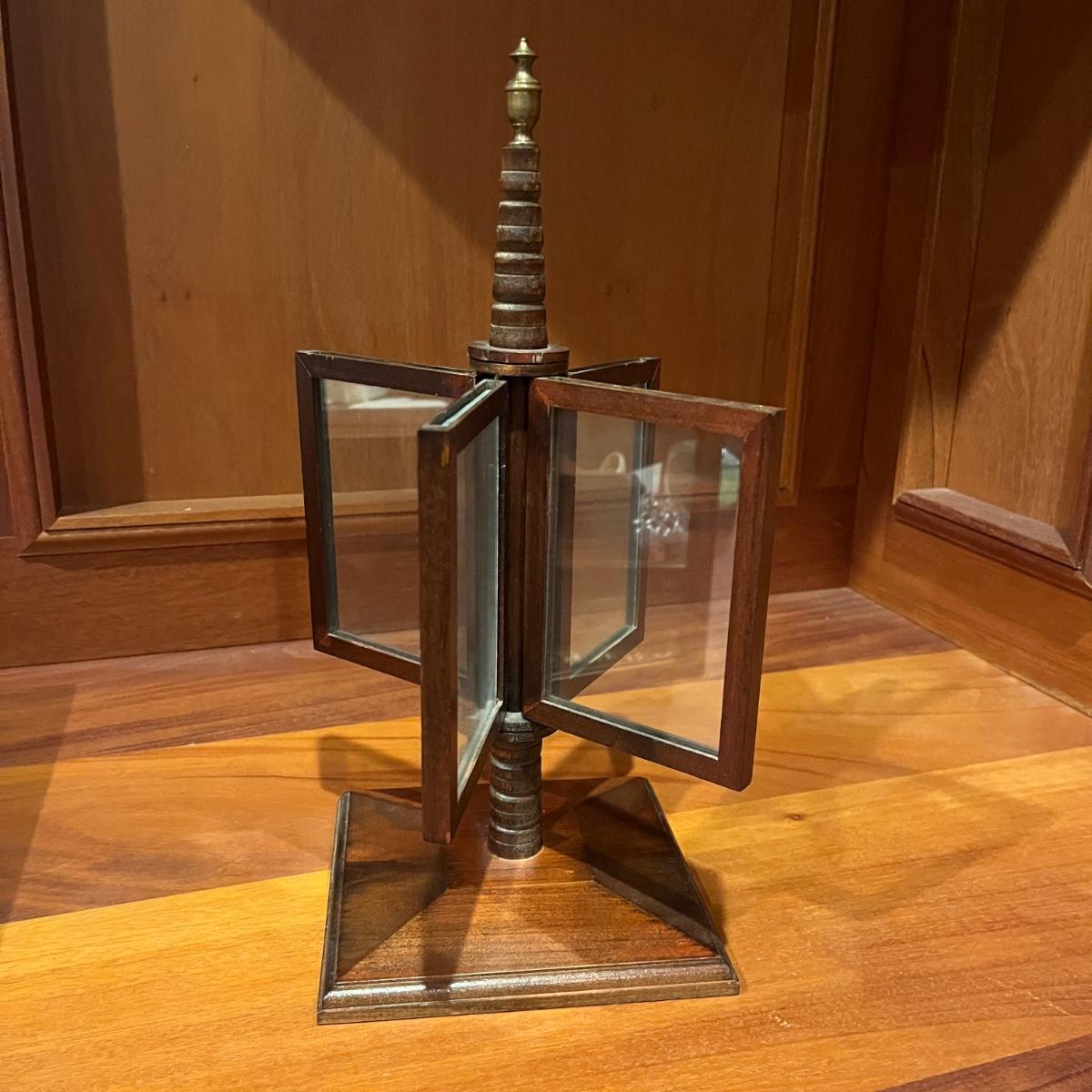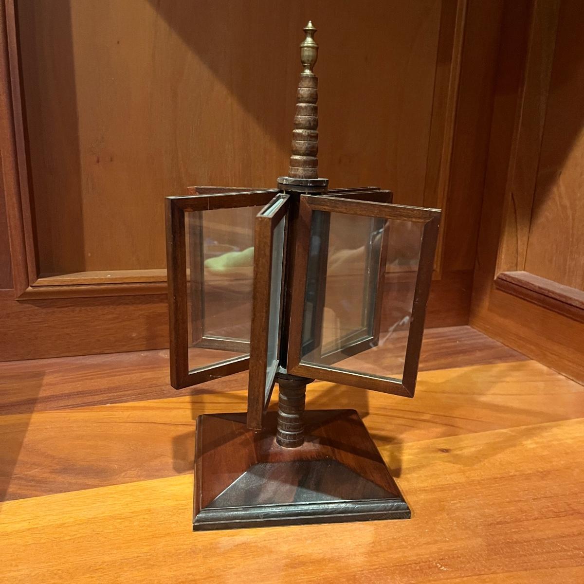 This office lot includes a wooden paper tray, wooden wastebasket with plastic insert, horn handled magnifying glass, glass paperweight and a wooden and glass picture frame. Tray measures 11” x 15” x 3”H.