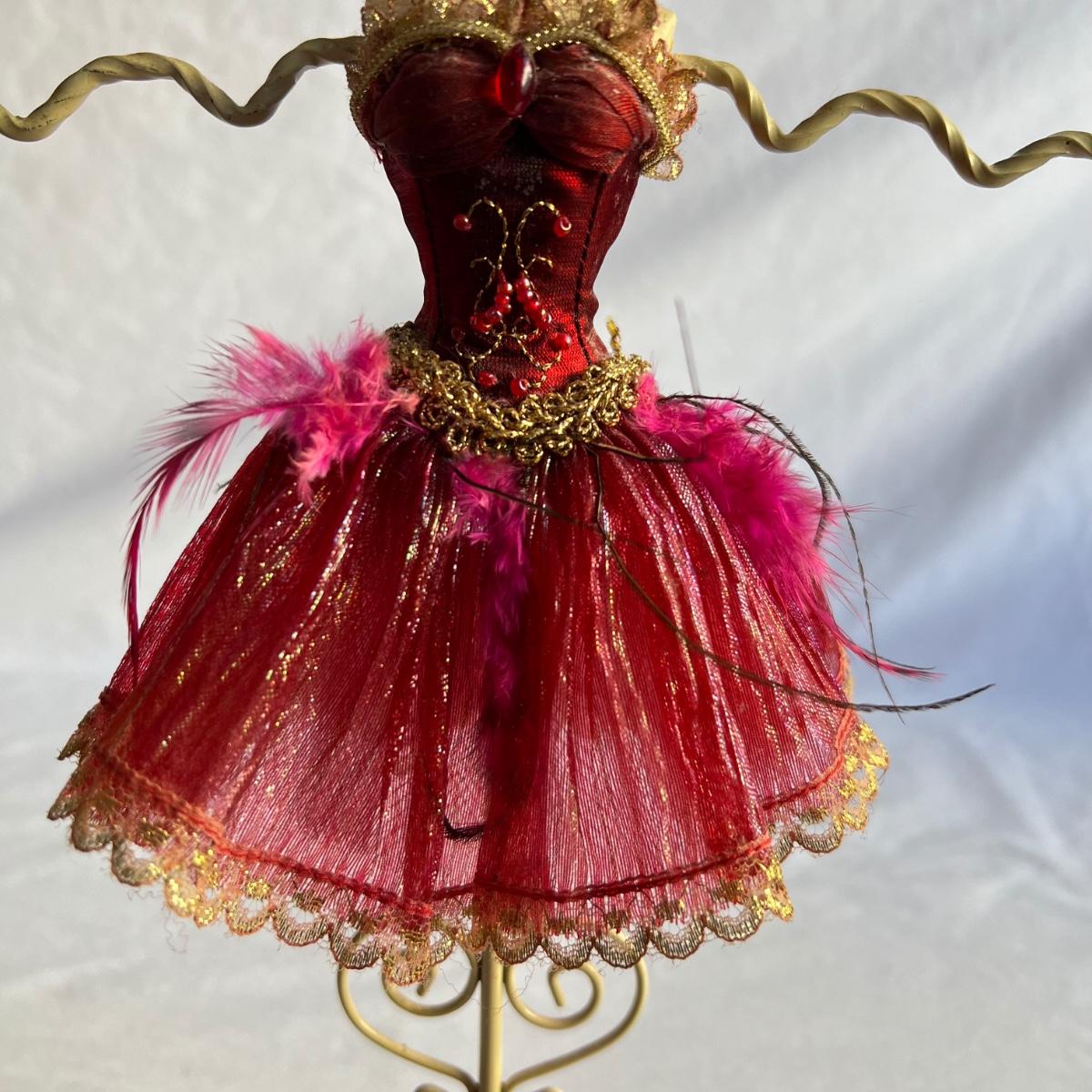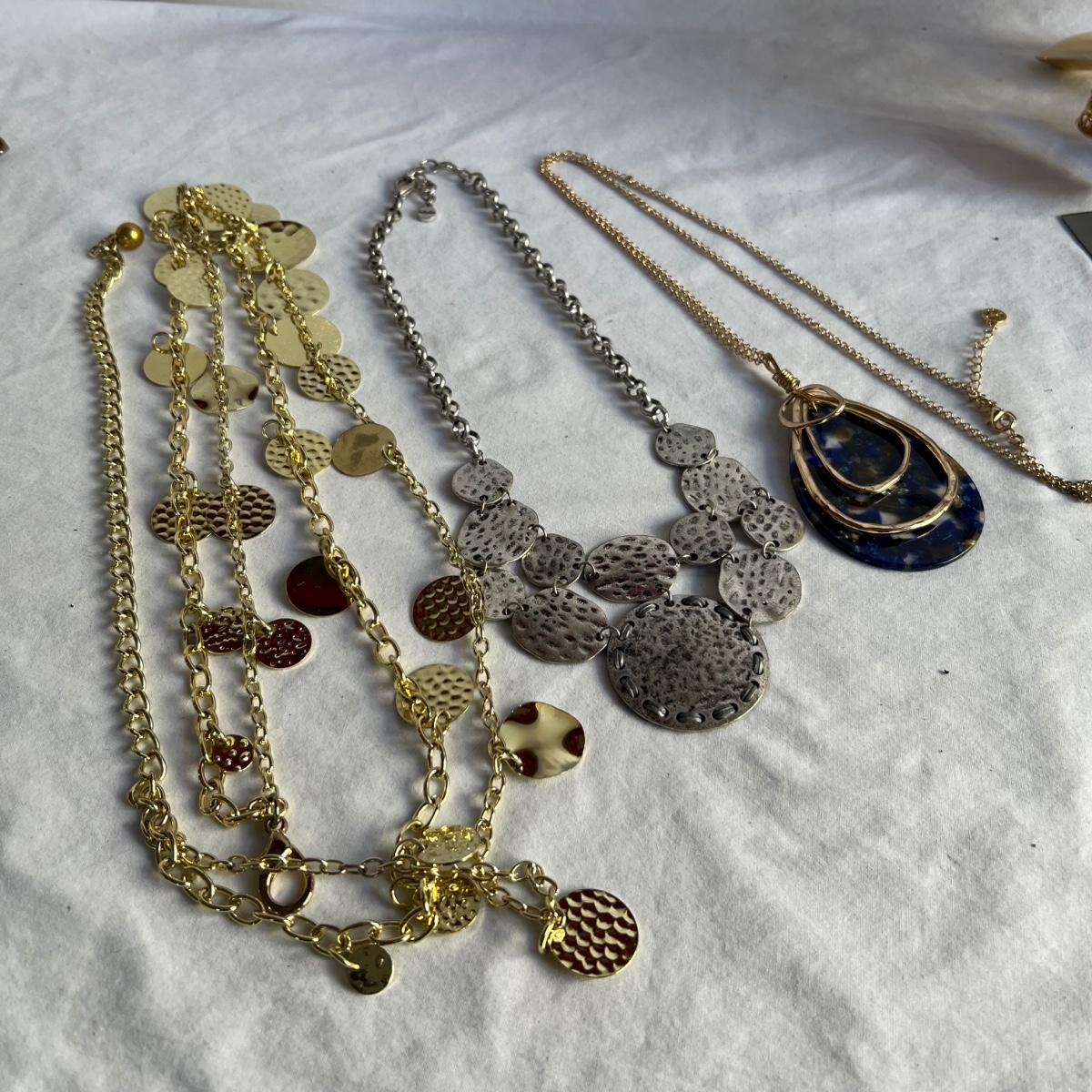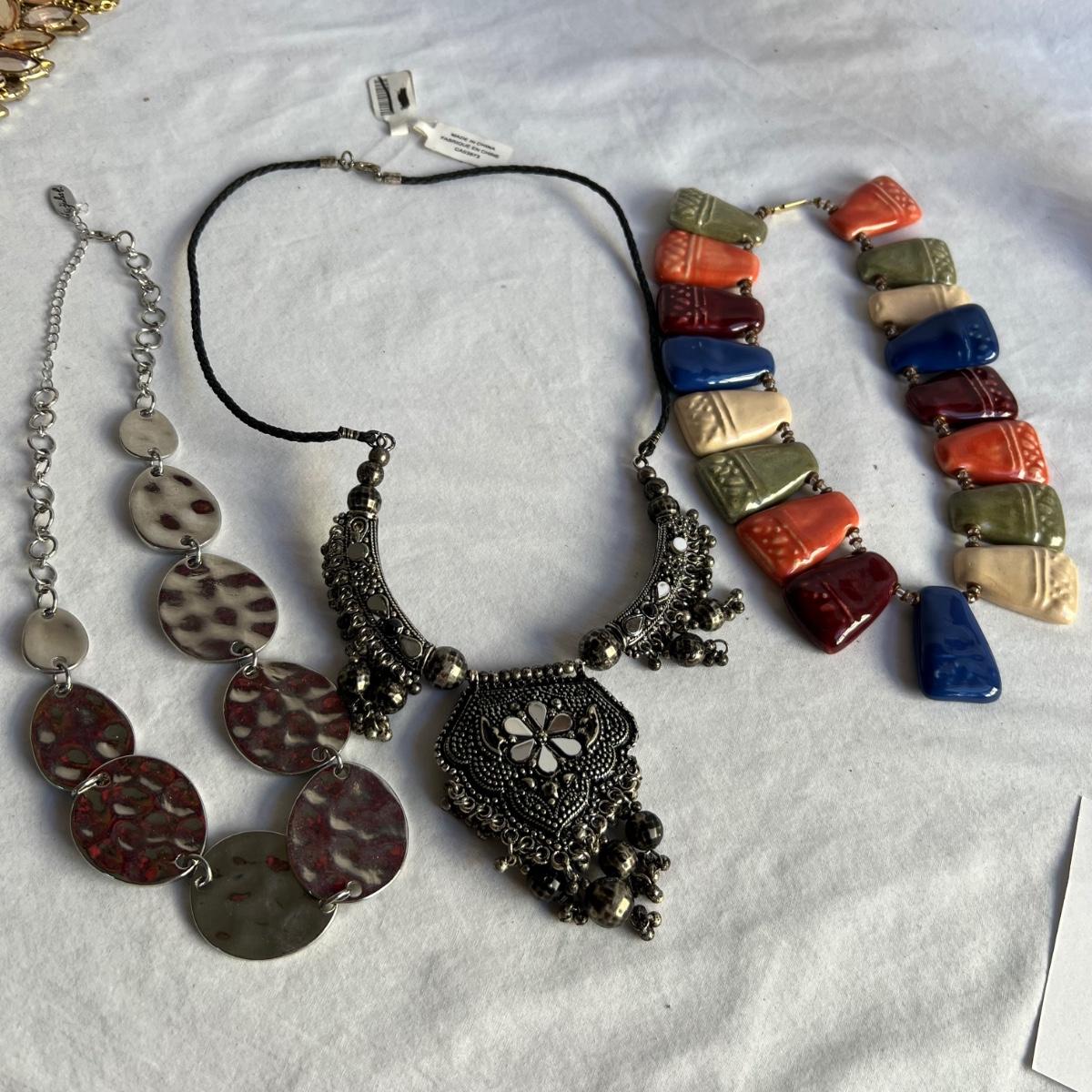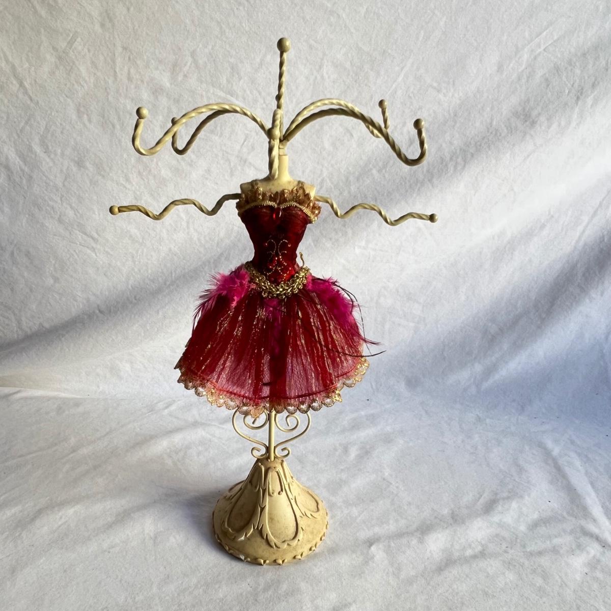 A large assortment of over 40 statement fashion jewelry pieces including necklaces, earrings, bracelets and a brooch. The majority of earrings are for pierced ears with a couple of clip-ons. One necklace has matching earrings as does the brooch. Necklaces range in length from 18” to 52”. The mannequin style jewelry stand is made of resin and measures 3.5”D x 13”H; note her dress has a small area where the piping is loose. All sales are final, no refunds so please bid accordingly.