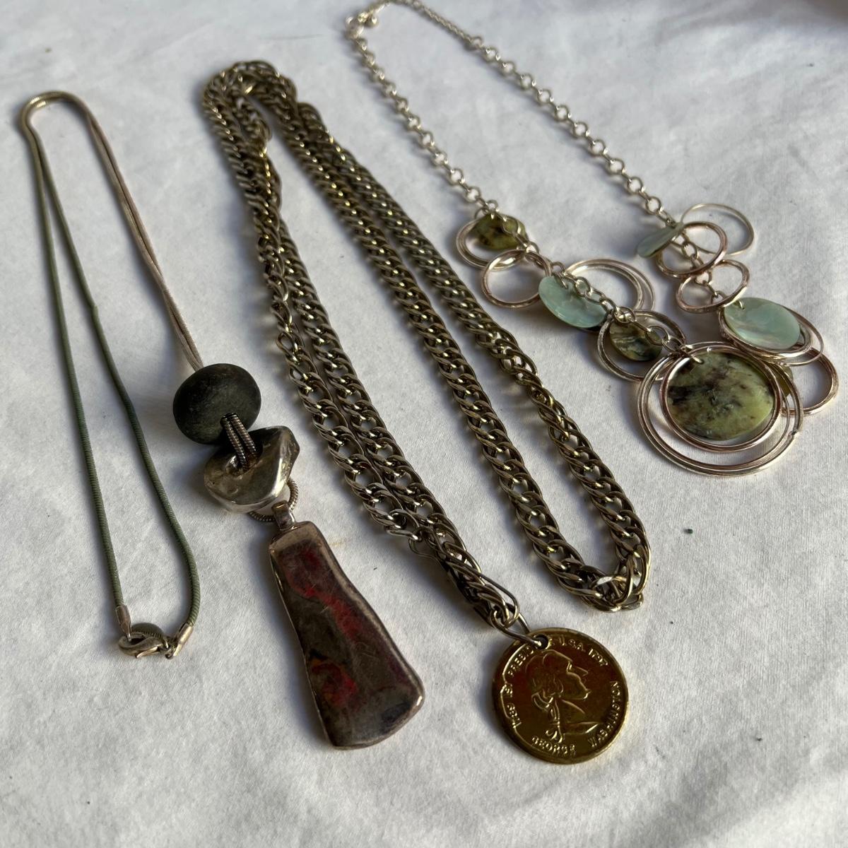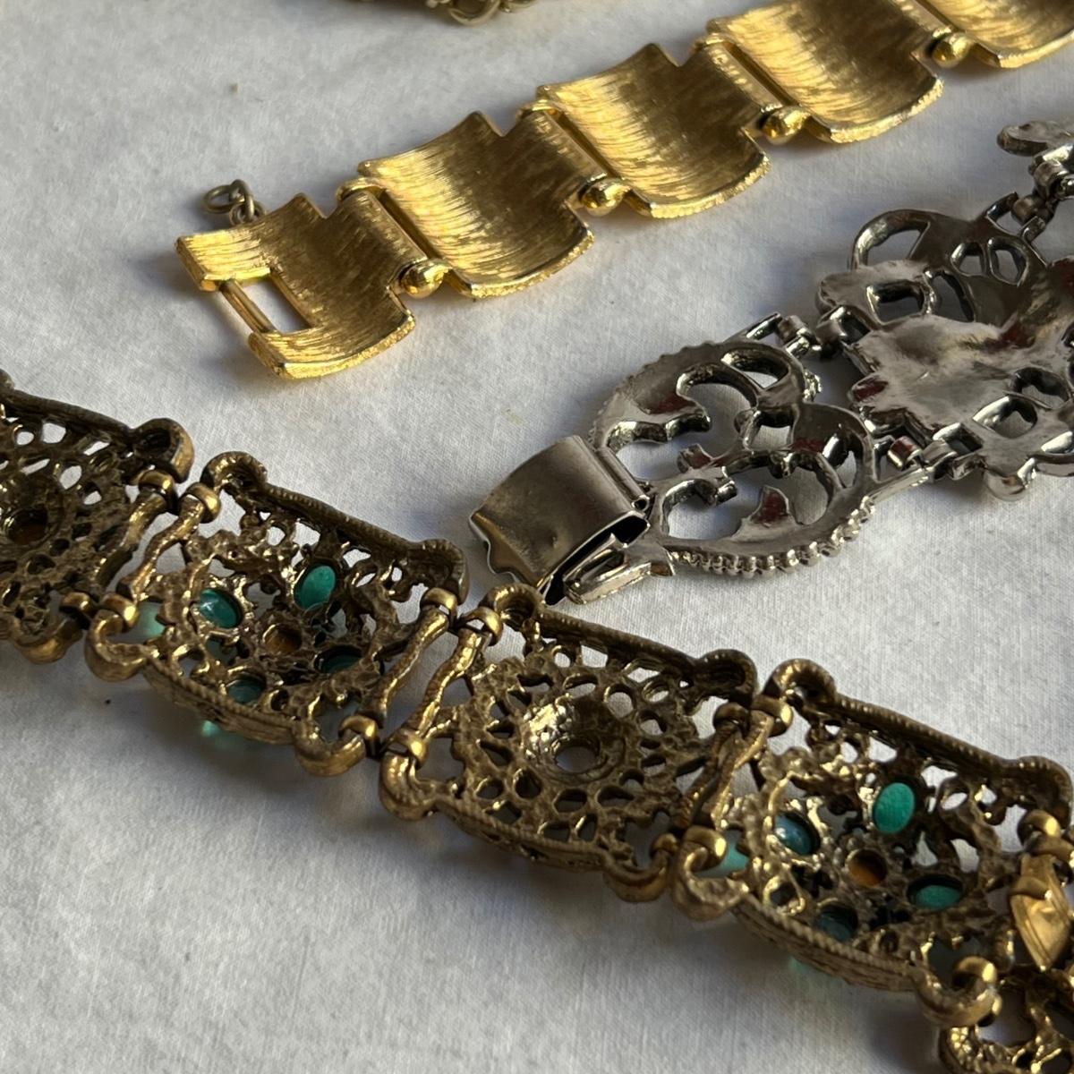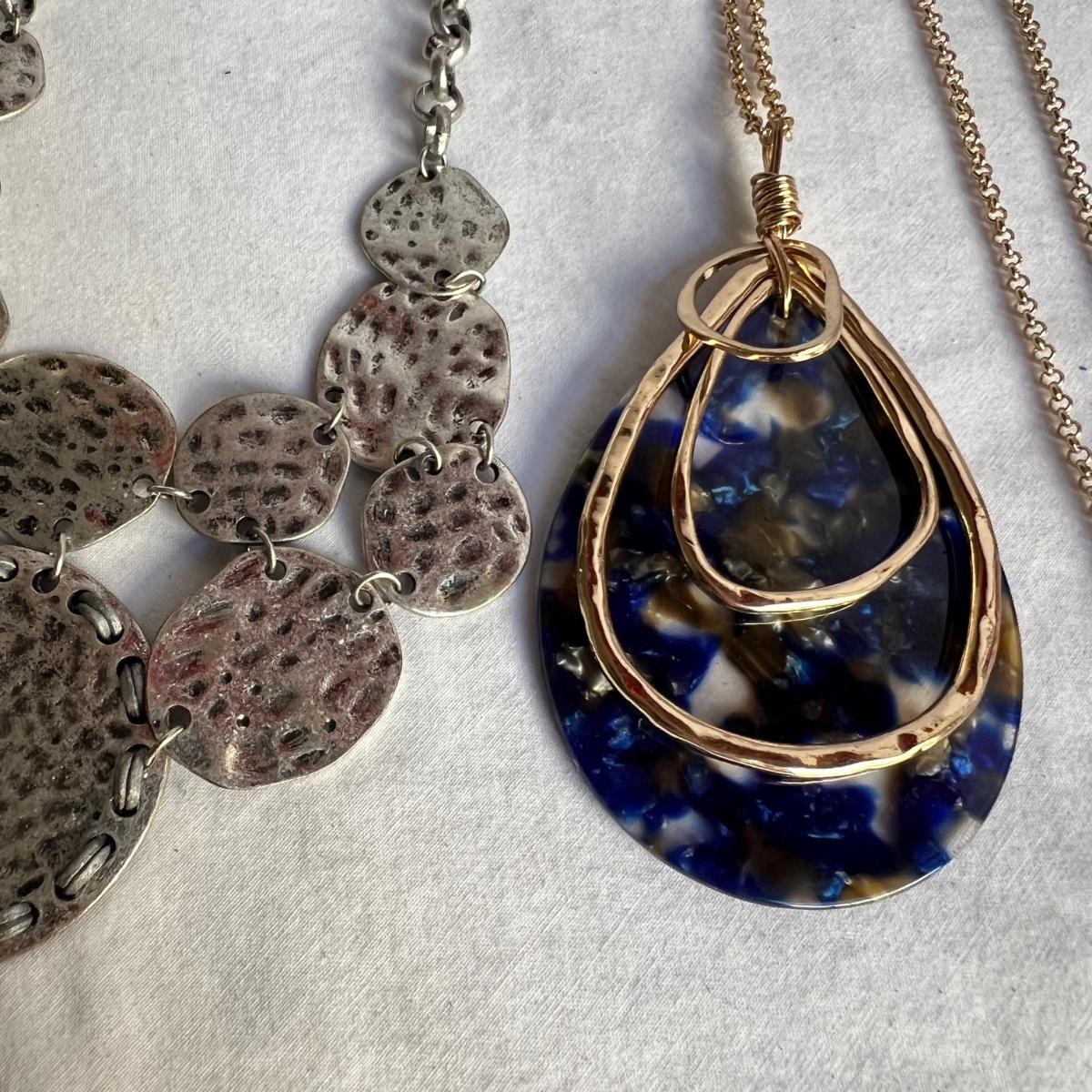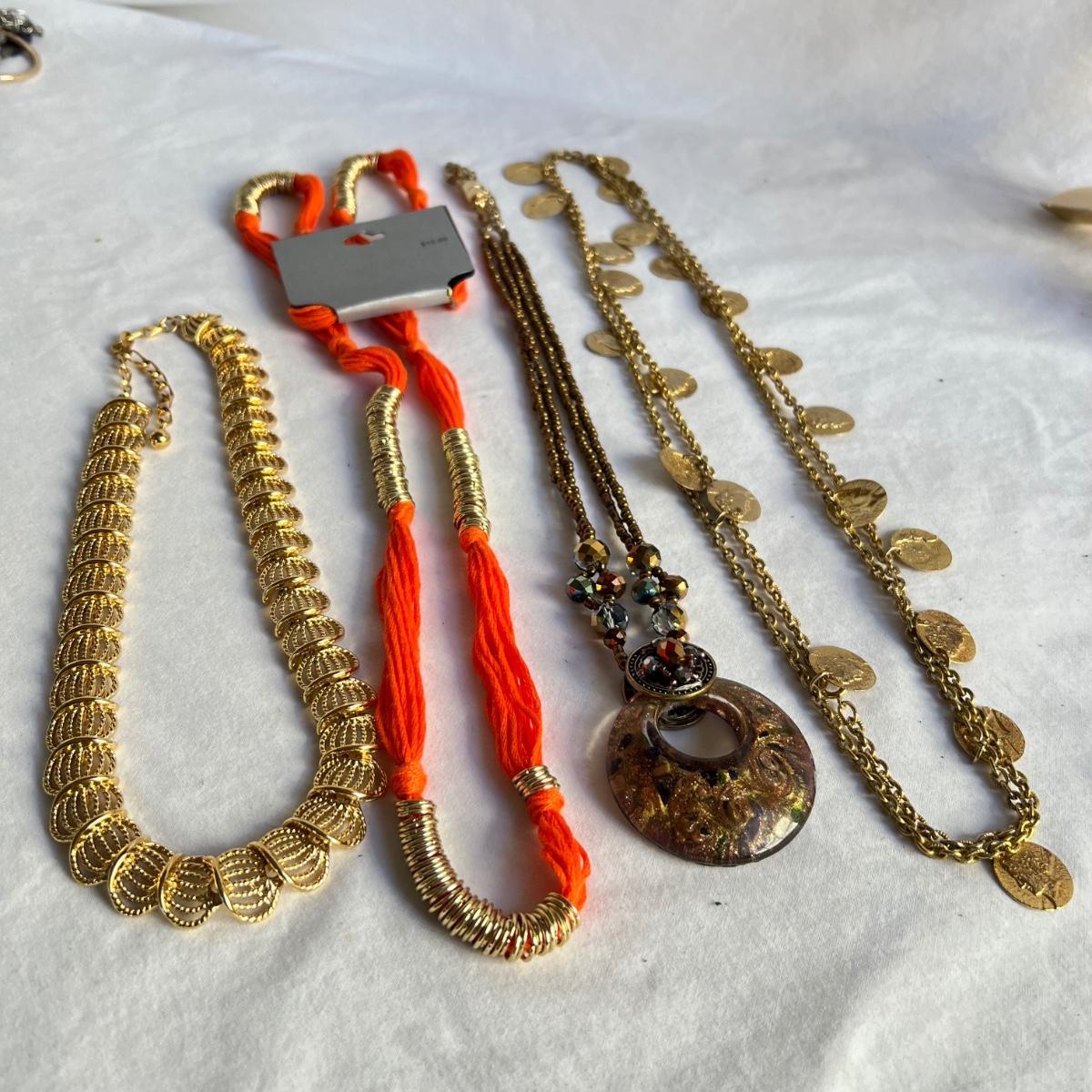 A large assortment of over 40 statement fashion jewelry pieces including necklaces, earrings, bracelets and a brooch. The majority of earrings are for pierced ears with a couple of clip-ons. One necklace has matching earrings as does the brooch. Necklaces range in length from 18” to 52”. The mannequin style jewelry stand is made of resin and measures 3.5”D x 13”H; note her dress has a small area where the piping is loose. All sales are final, no refunds so please bid accordingly.
