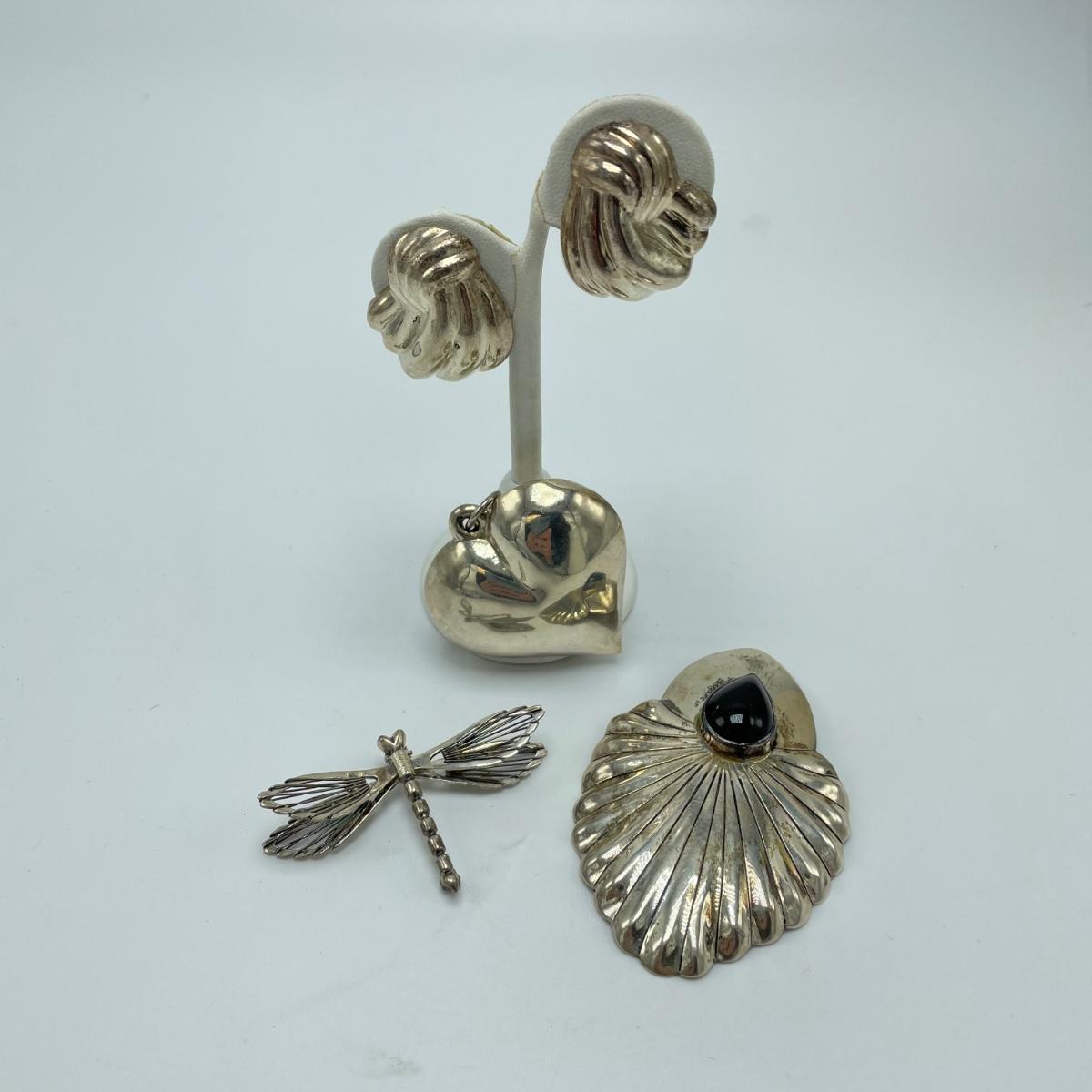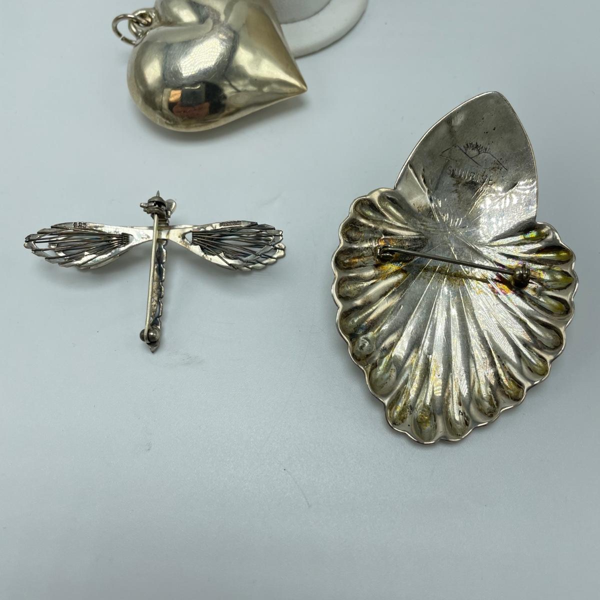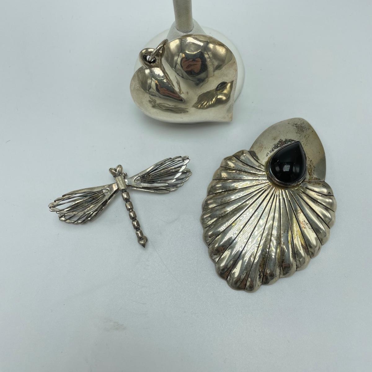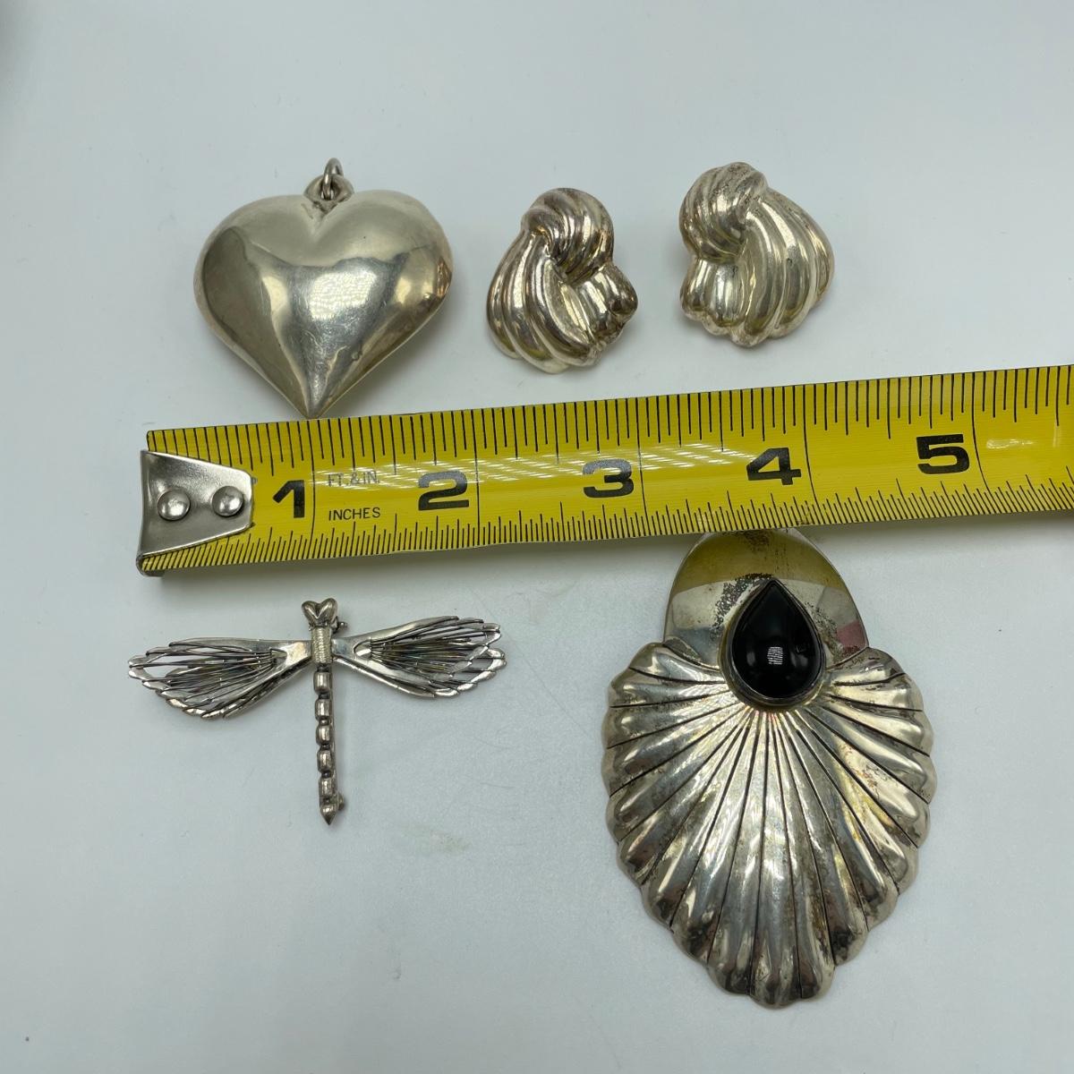 One hollow heart shaped pendant, two brooches and a pair of posted earrings all marked sterling or 925. Each one offers a bold statement with their unique designs. The sterling marking on the brooch with the onyx colored stone is hidden a bit in the sun’s rays of the Sunrise stamp. See images. Shipping available.