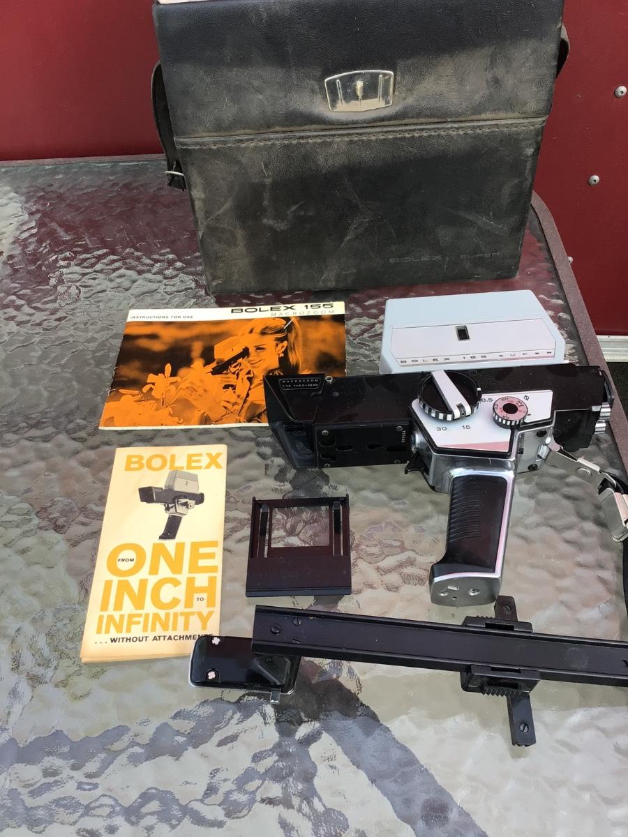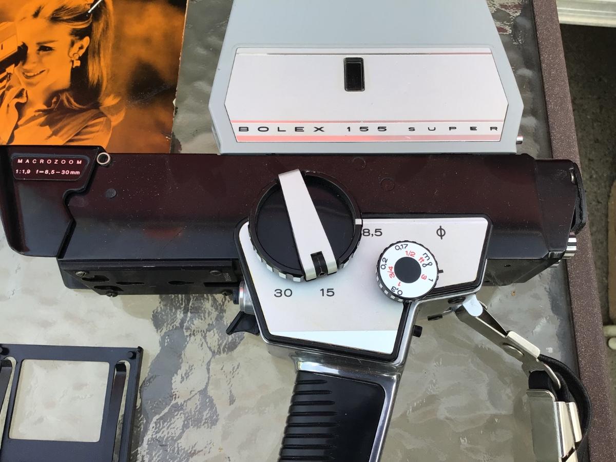 This is a Bolex 1555 Super Macro Zoom recorder. Is was made in Switzerland, and has a the instruction manual included. It has a nice case that need some cleaning.