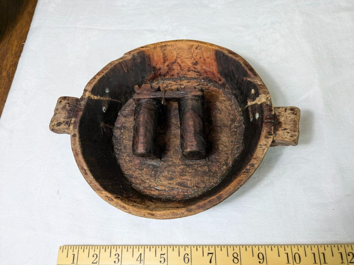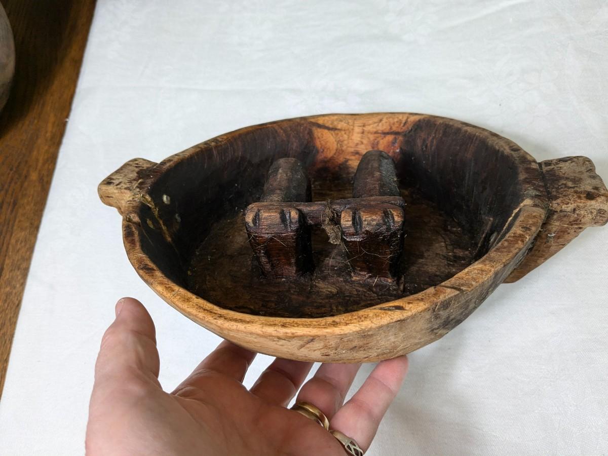 This superb example is carved from a single piece of wood, with two bulls standing in the centre of the bowl. The bull is auspicious, meaning good luck in the wish to avert misfortune, and as a symbol of power represents the might of the Spanish conquistadors.