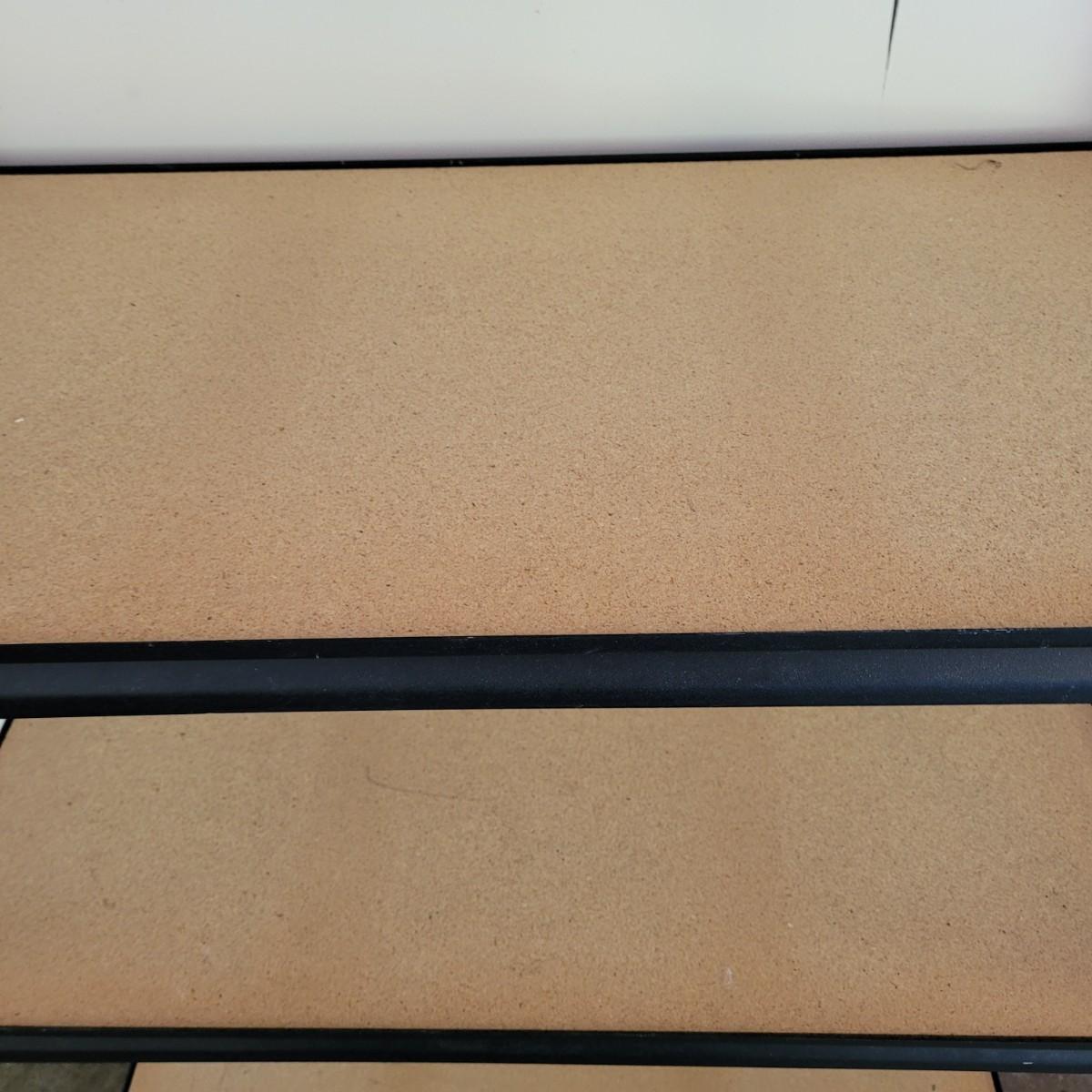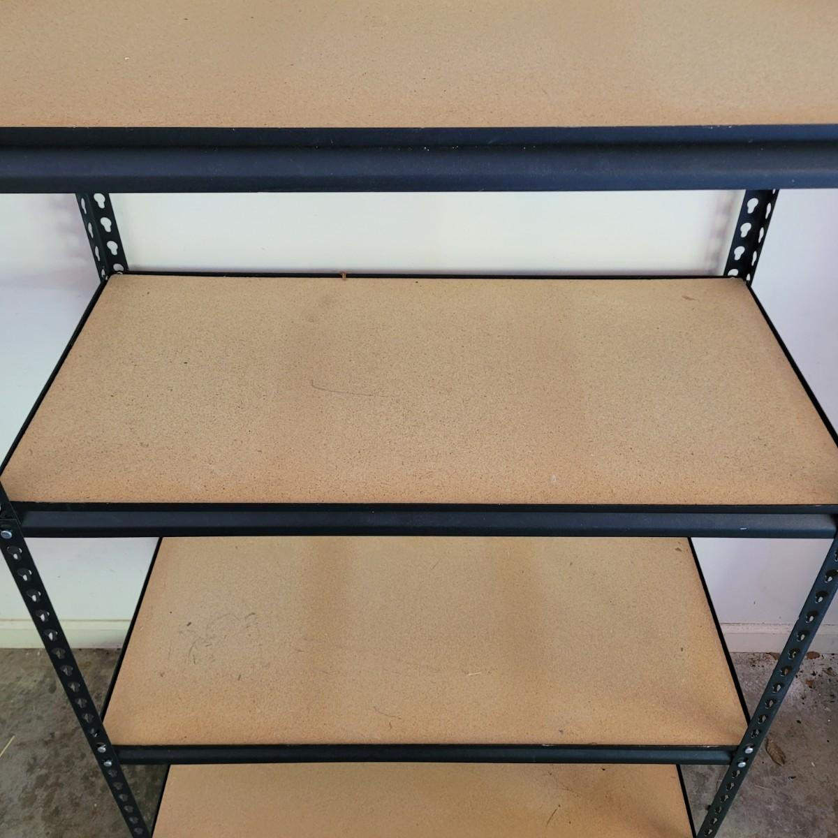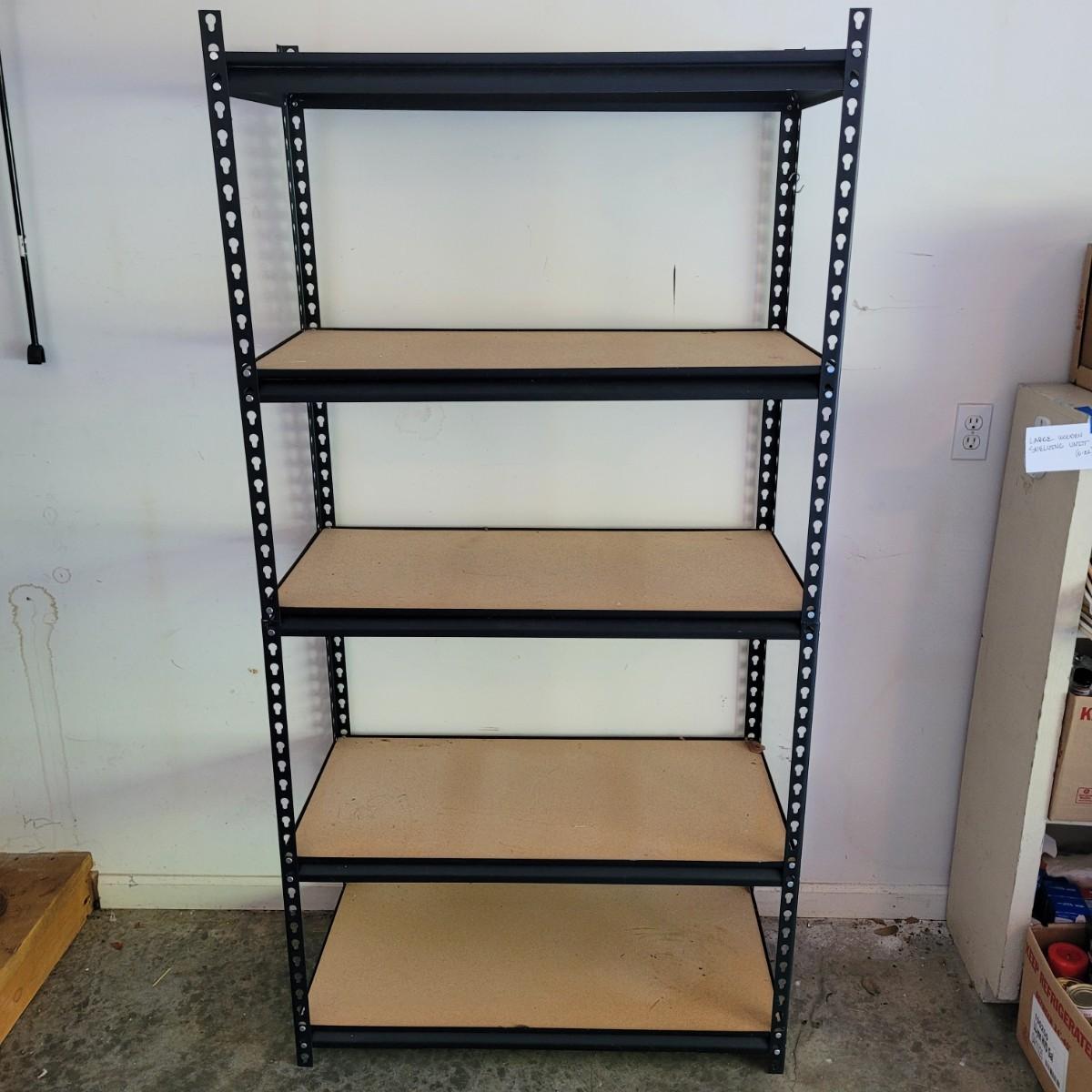 This lot includes a large metal and wood boltless storage shelving unit. The unit features five levels of shelving that can be adjusted to any height. The frame is made from metal that can be clicked together and the shelf surfaces are made from particle board. The unit measures 36.5" x 18.5" x 72"H. This item is in the garage and can be moved without traversing steps.