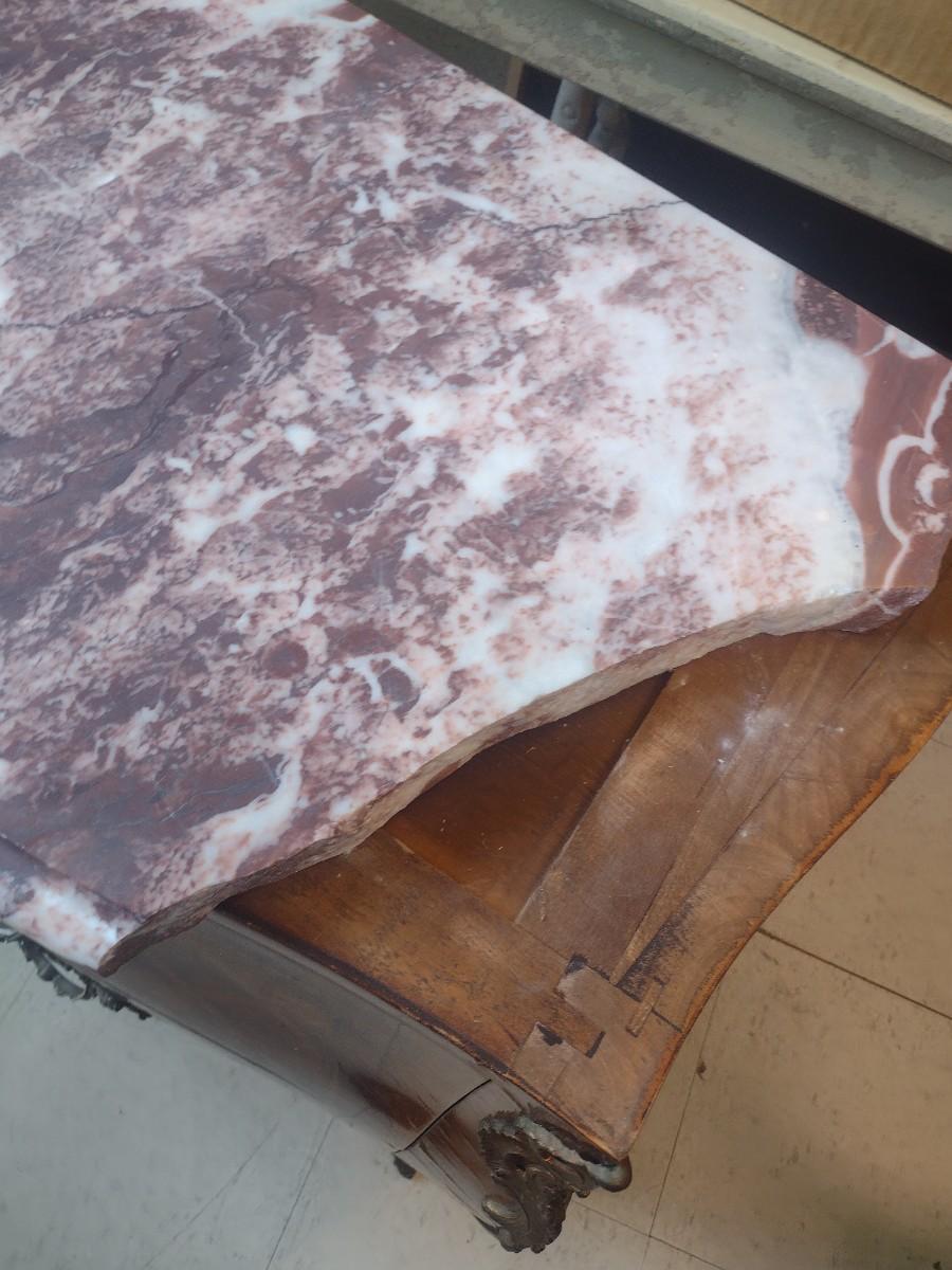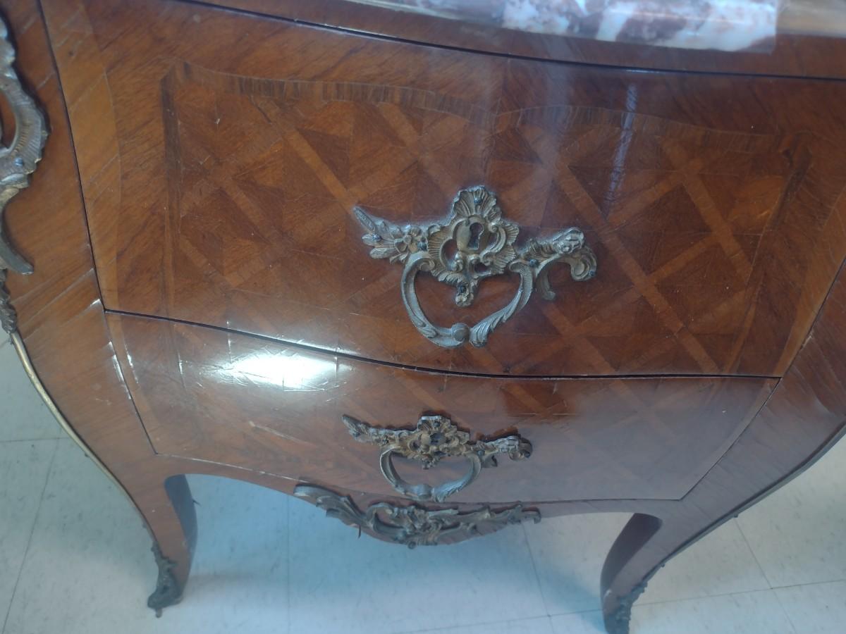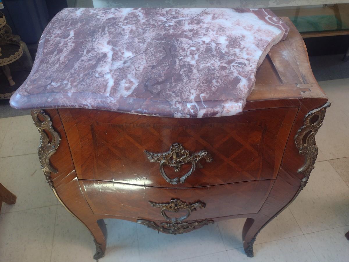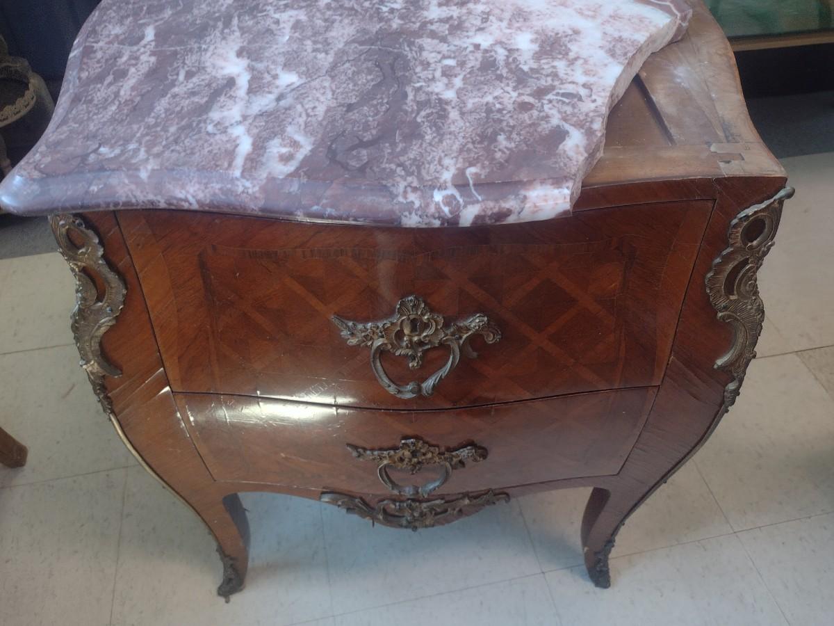 French Parquetry Mahogany Two Drawer Chest. Marble top was dropped unloading. Pieces are available.