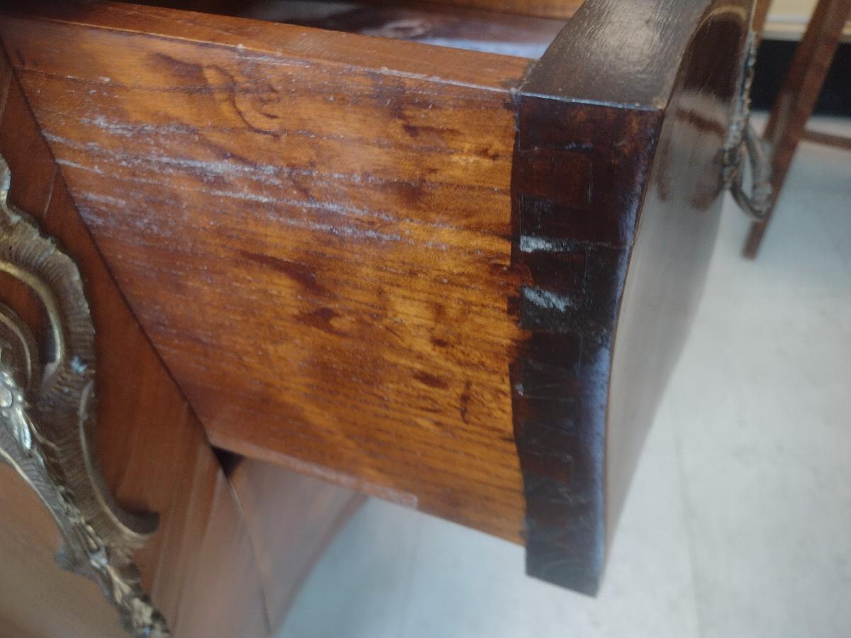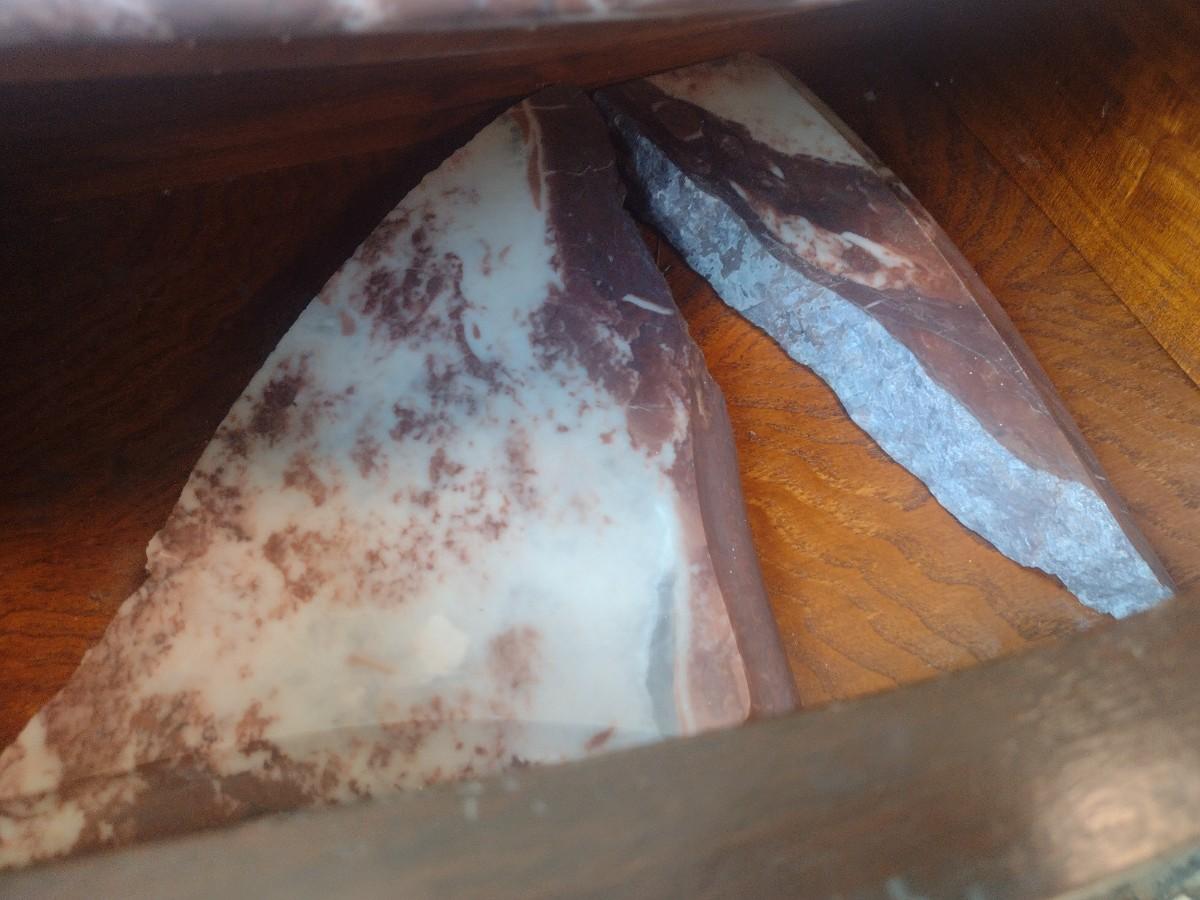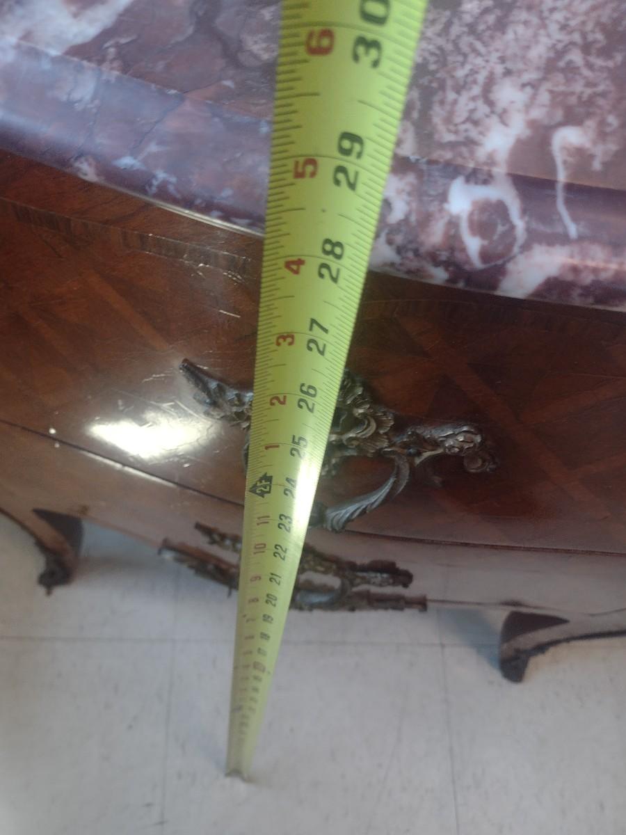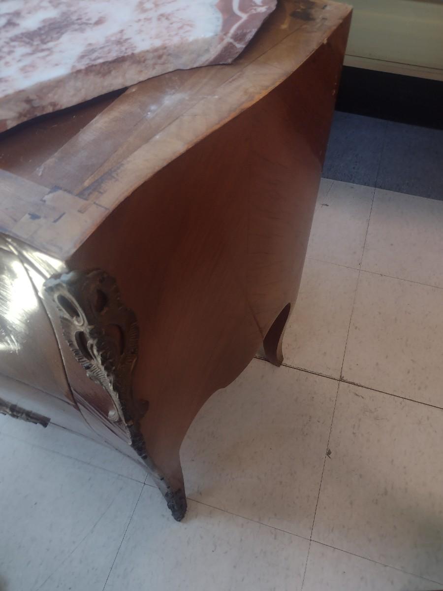 French Parquetry Mahogany Two Drawer Chest. Marble top was dropped unloading. Pieces are available.