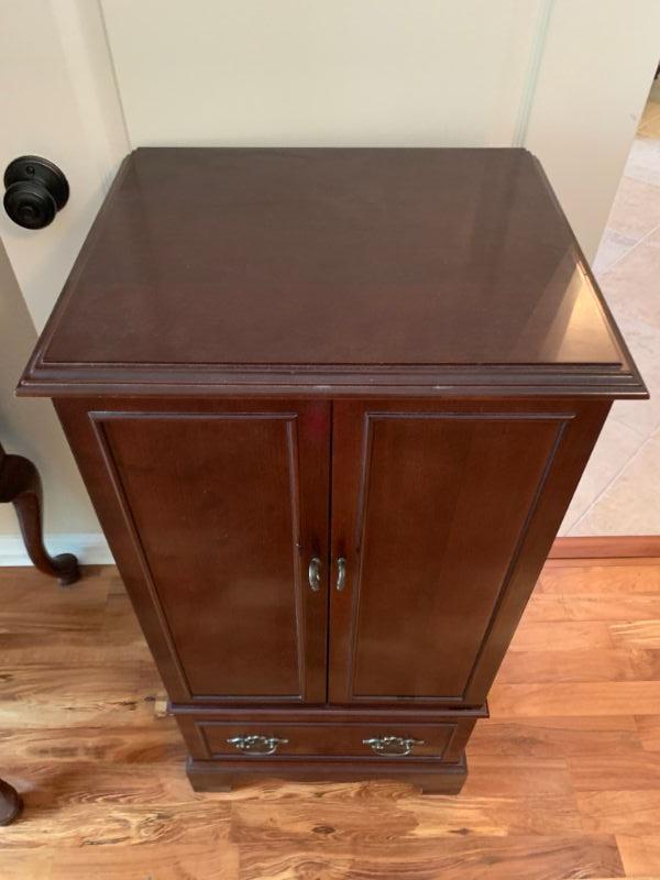 Bombay Company Cherry finish Jewelry Armoire with lots of room for all your jewelry. 6 drawers with two pull out doors on the sides for necklaces. The top of the jewelry armoire does not open so you can display items on top.