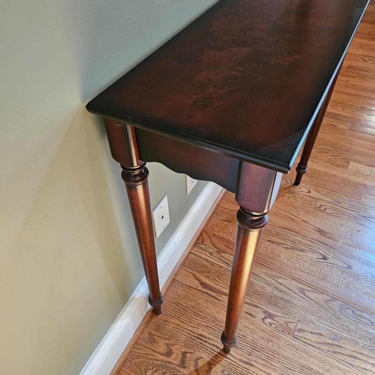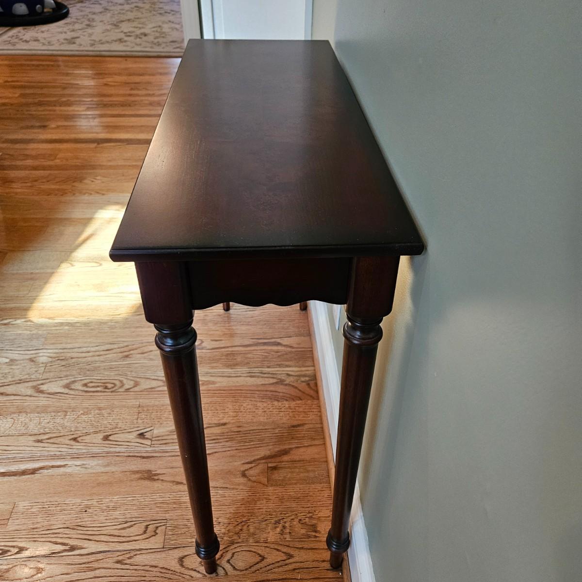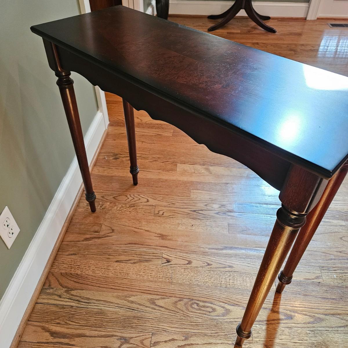 A Bombay small console table made of solid wood with a dark cherry finish. It measures approximately 32" x 12" x 29"H. Local pickup only