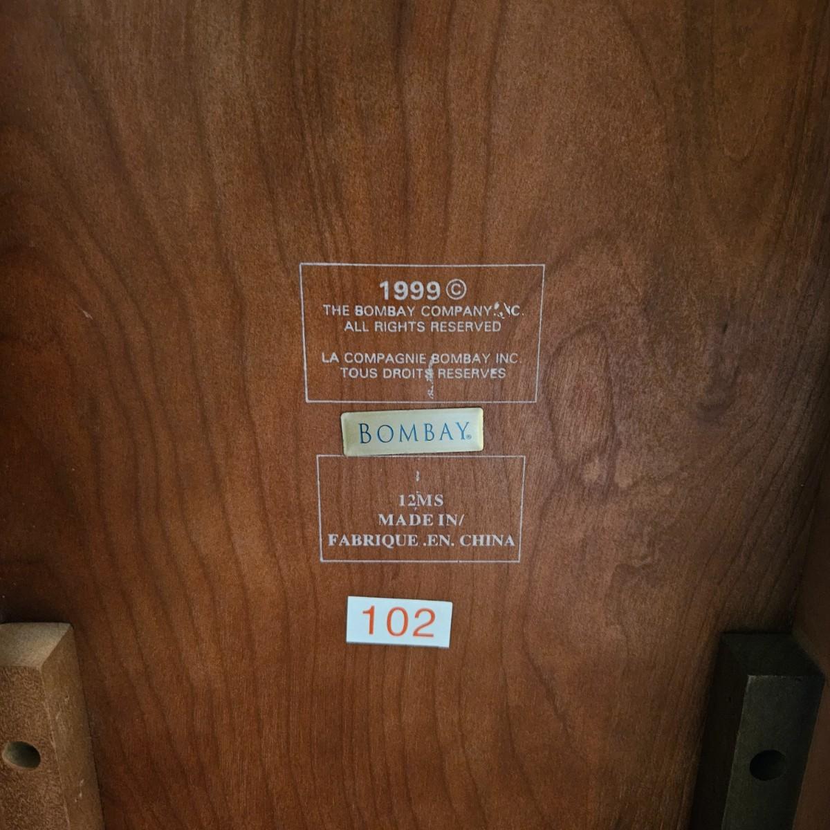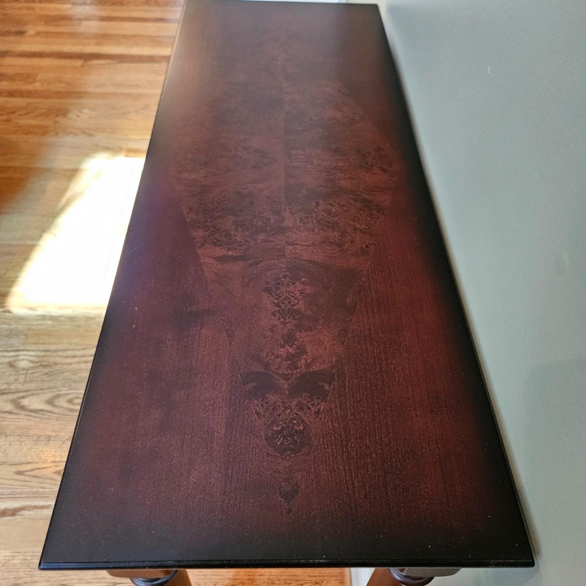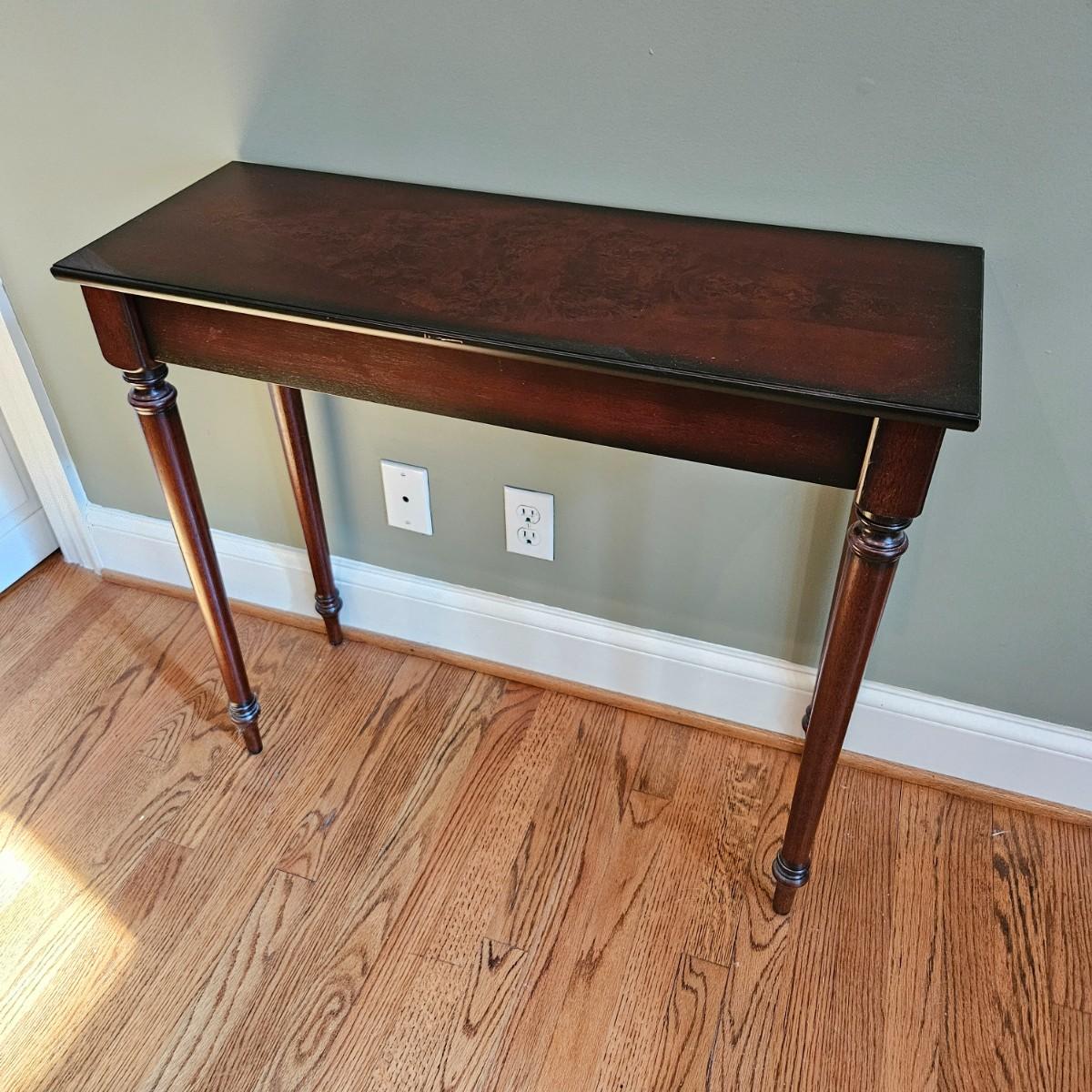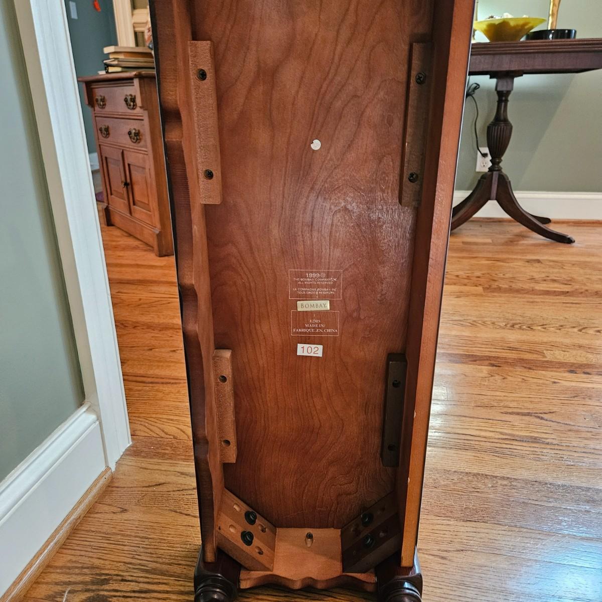A Bombay small console table made of solid wood with a dark cherry finish. It measures approximately 32" x 12" x 29"H. Local pickup only