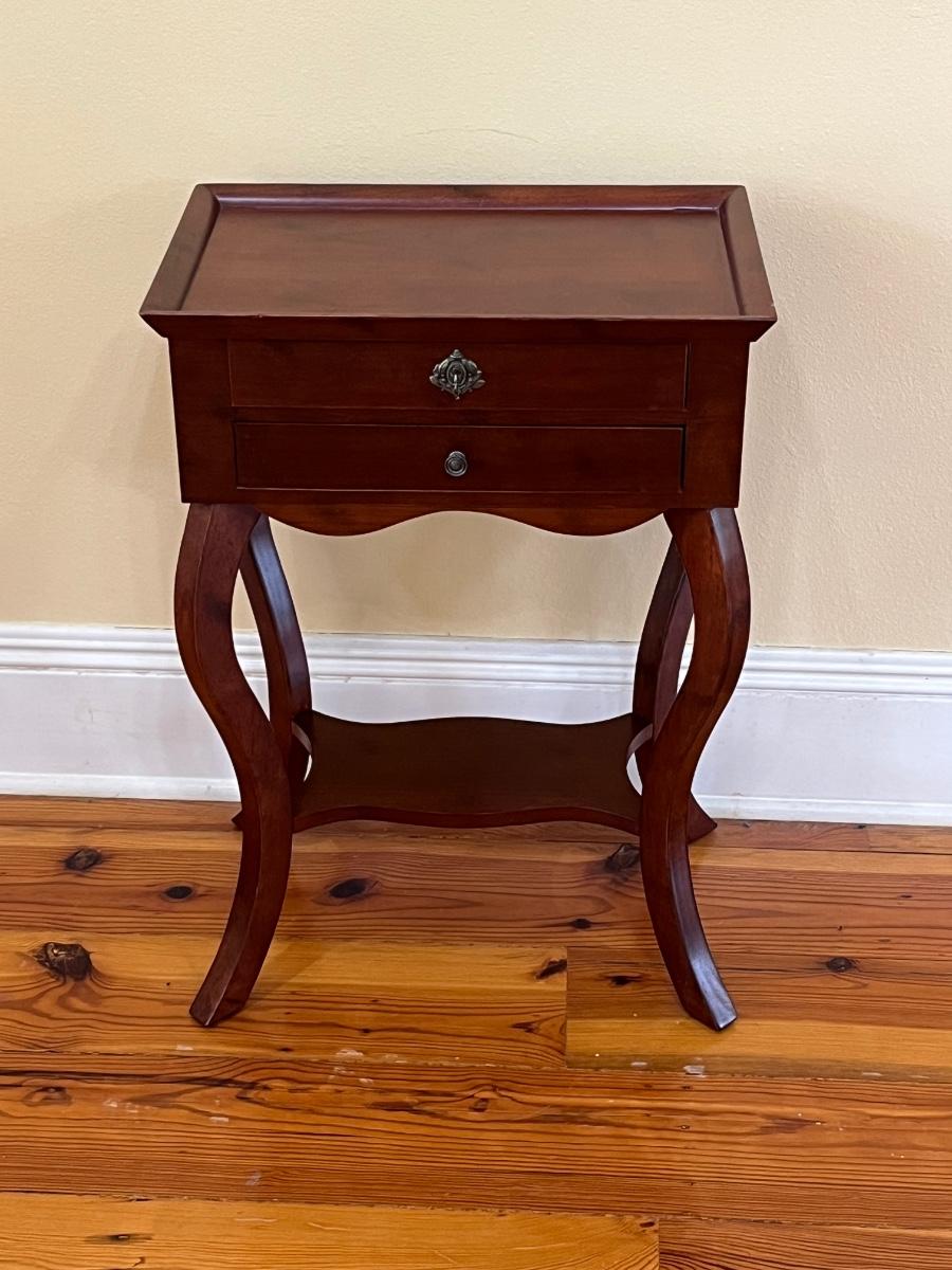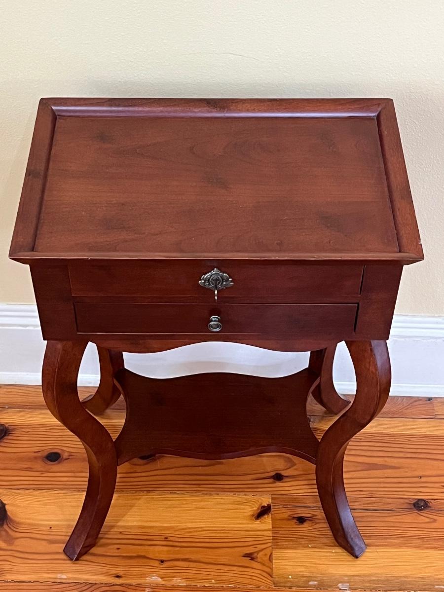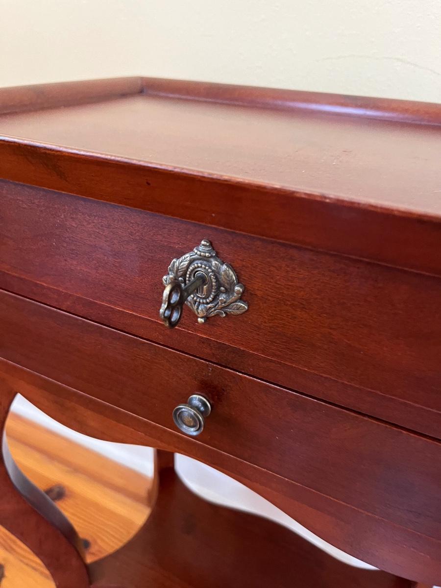 26” H x 18.5” W x 12” D ~ 2 Drawers slide easily ~ Skeleton key is faux and cannot be removed