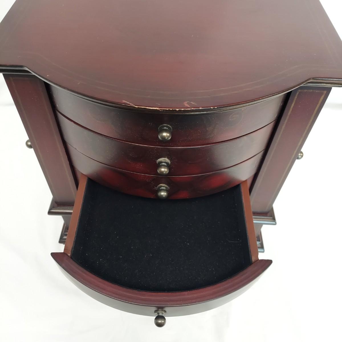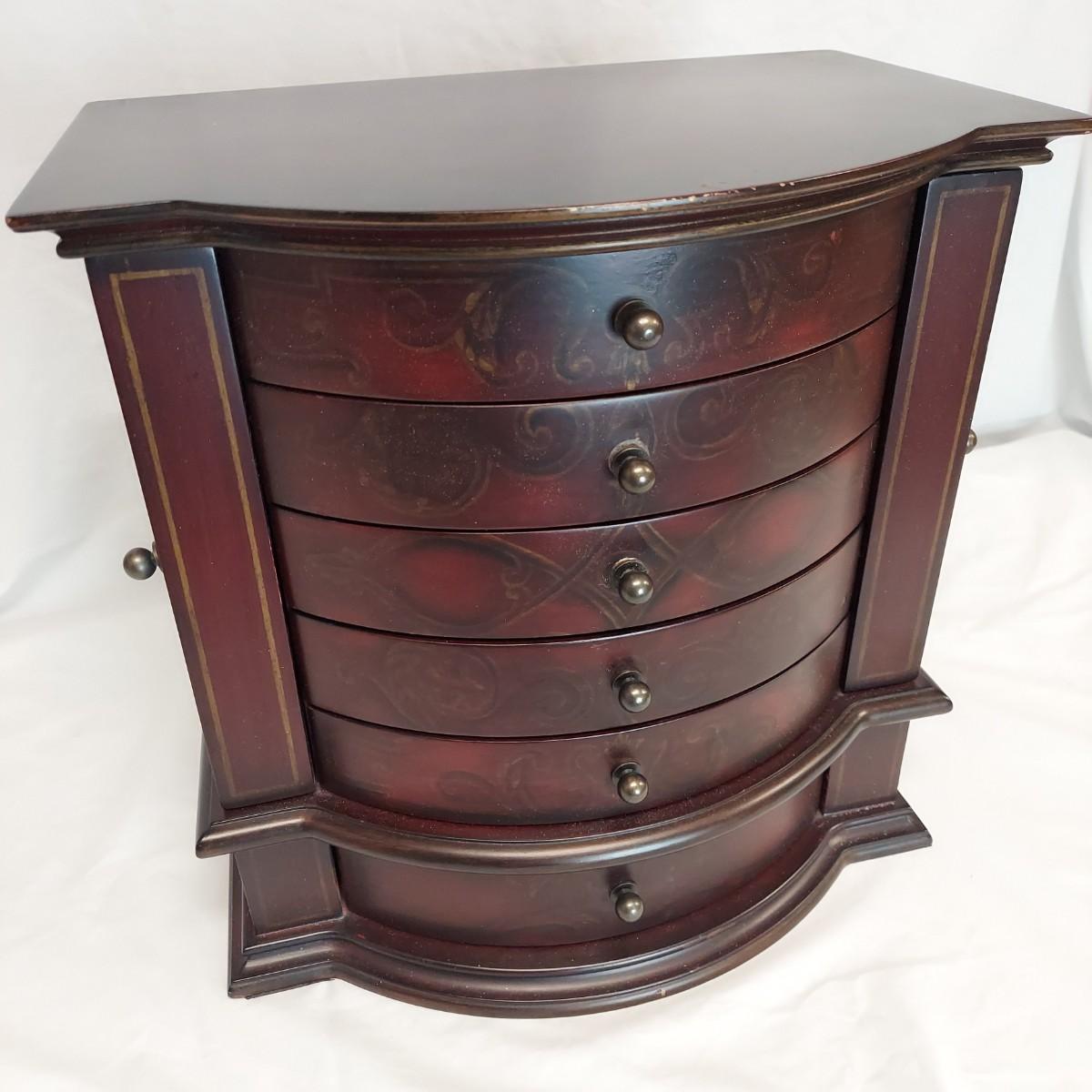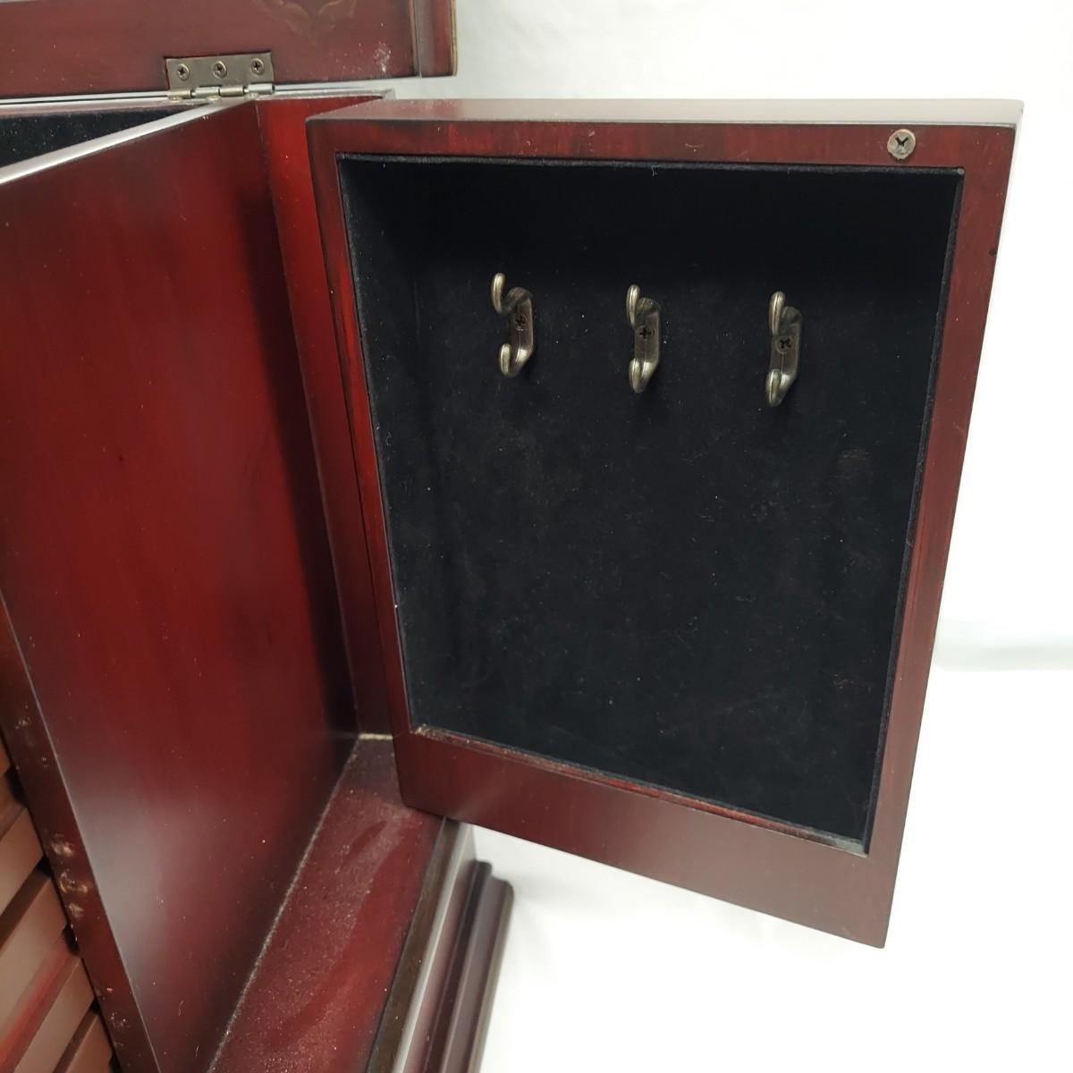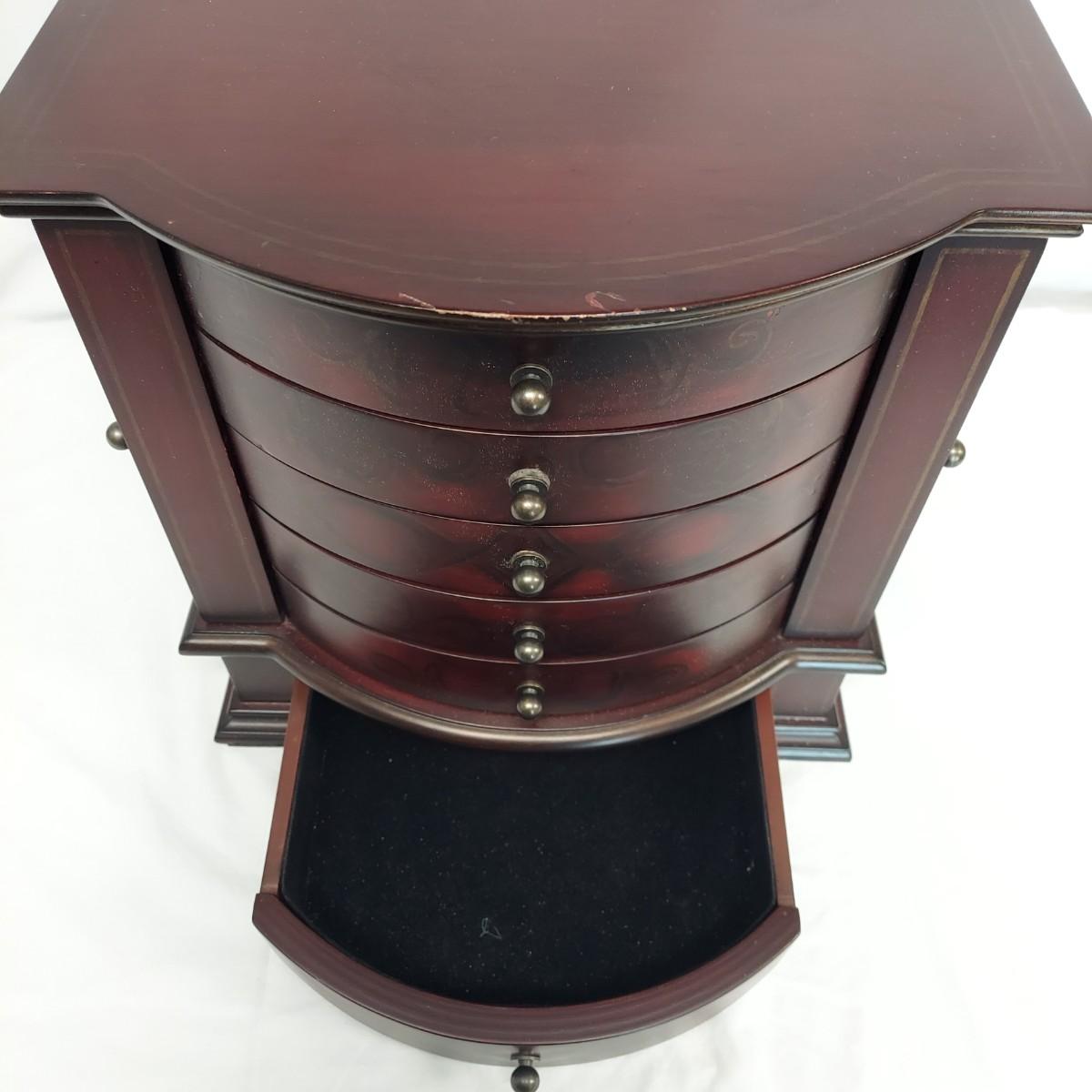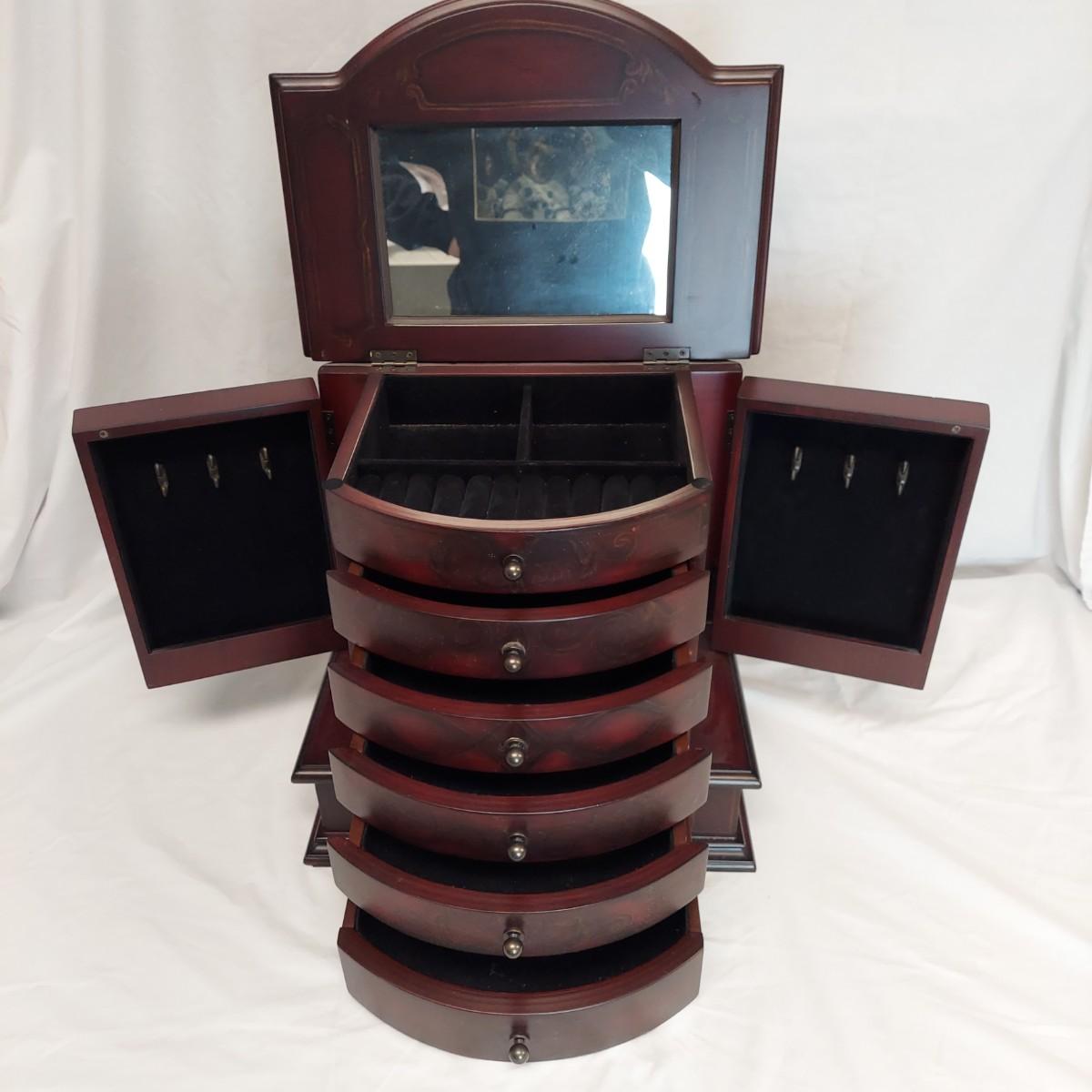 Large wooden jewelry box with five drawers, two necklace compartments and a ring tray. It measures approximately 15” x 11” x 15"H. Some of the handles are loose. Some scuffs to finish. Please see photos for details.