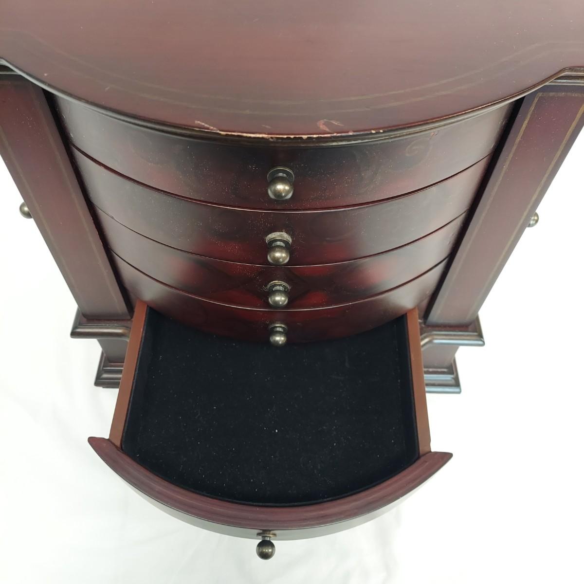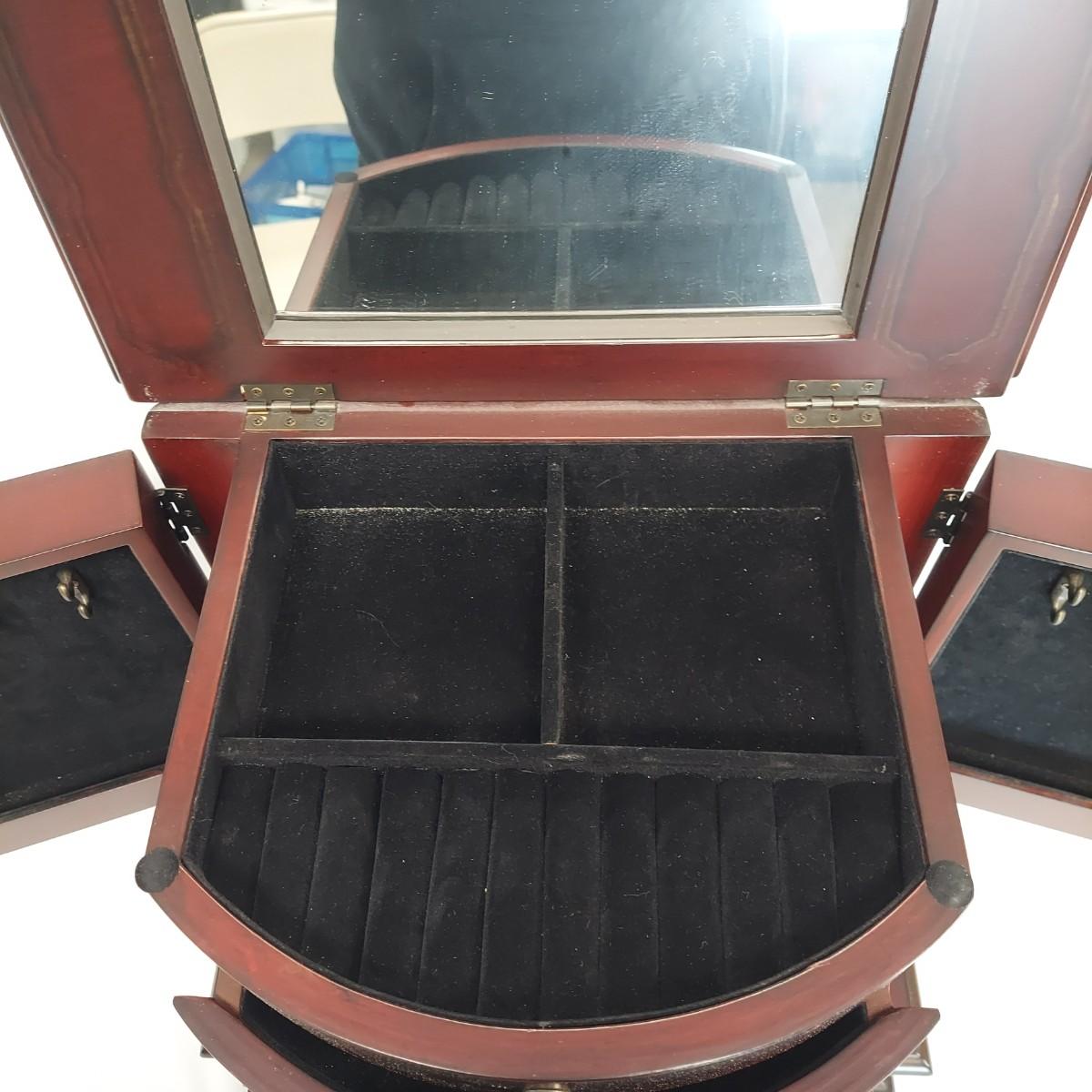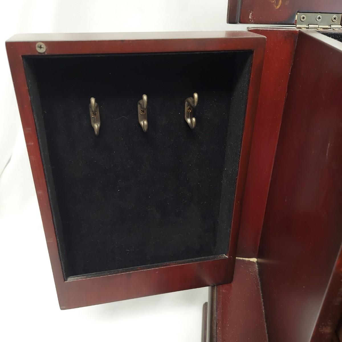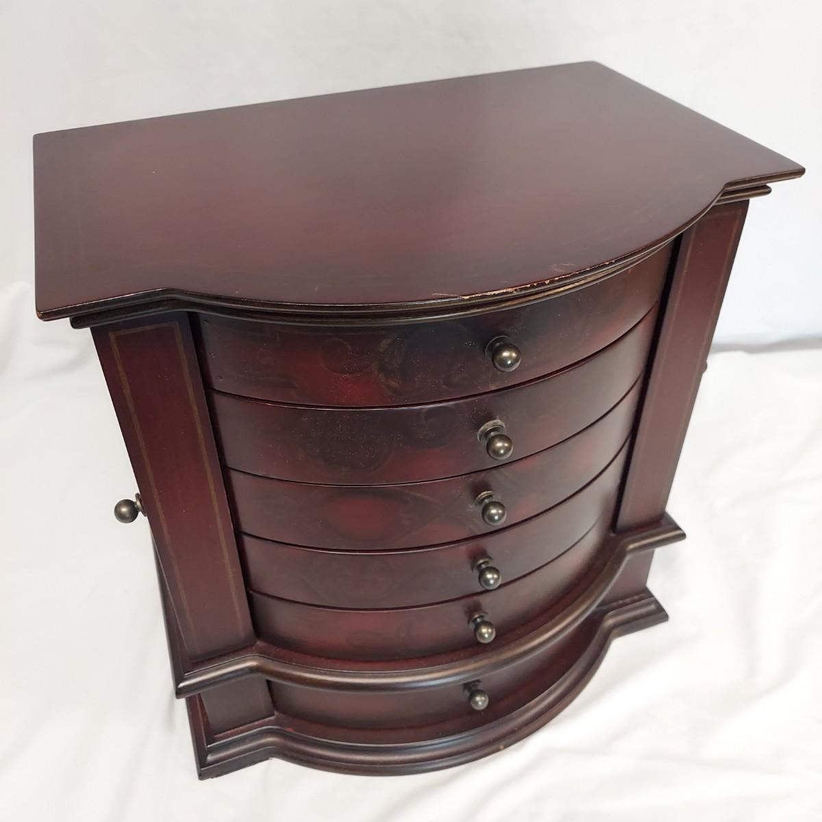 Large wooden jewelry box with five drawers, two necklace compartments and a ring tray. It measures approximately 15” x 11” x 15"H. Some of the handles are loose. Some scuffs to finish. Please see photos for details.