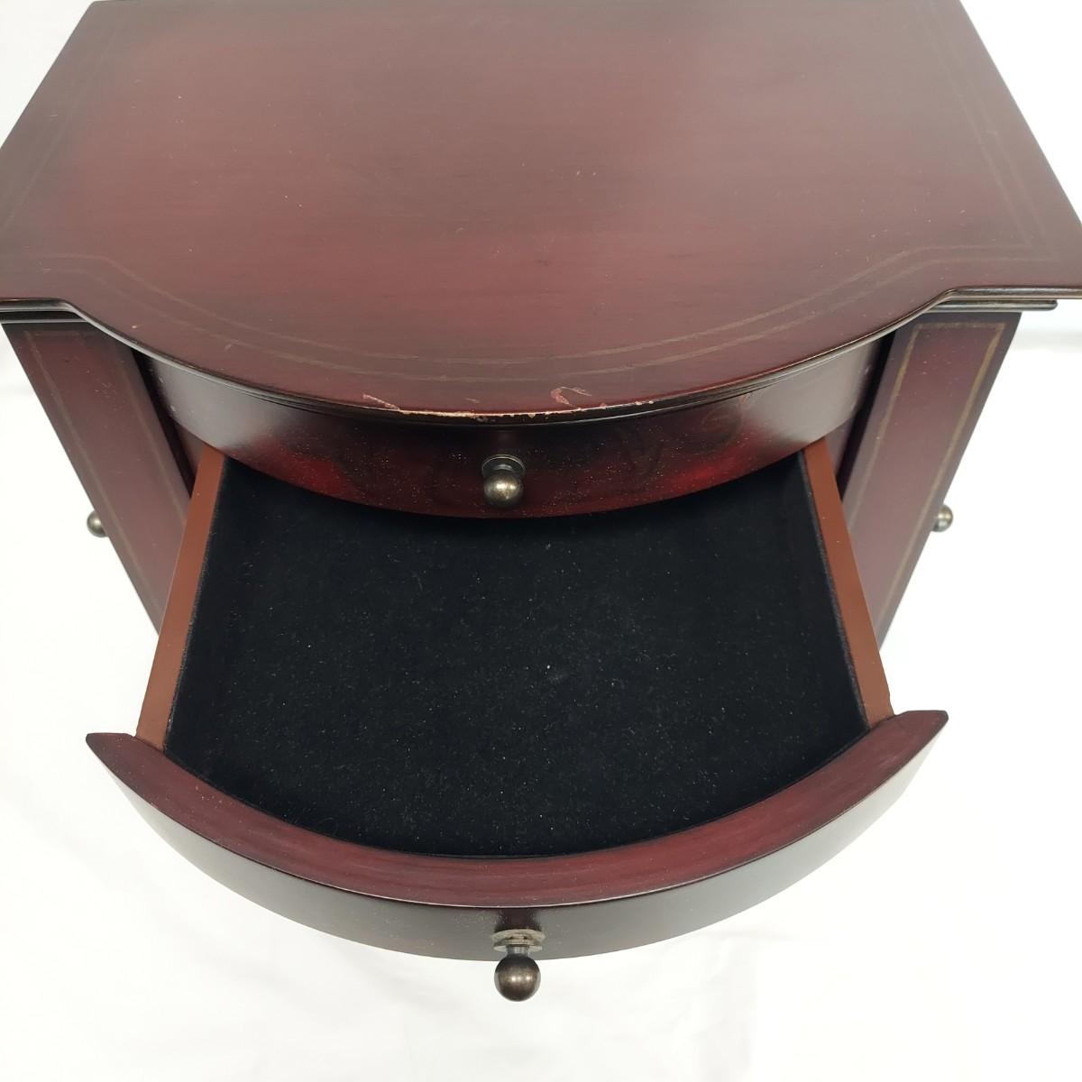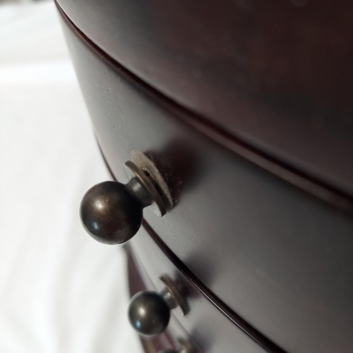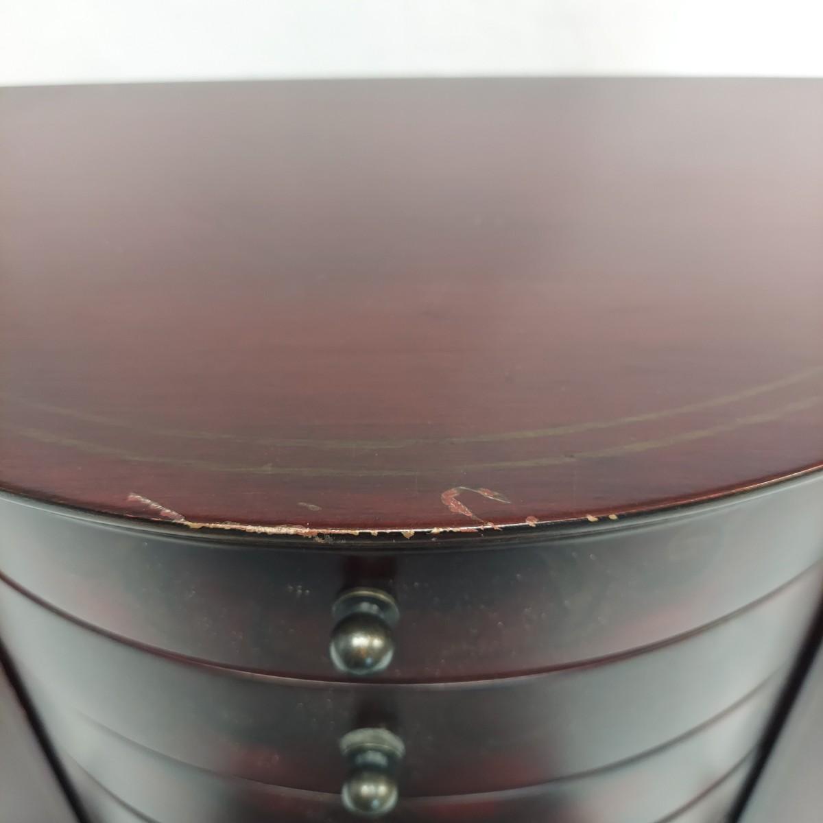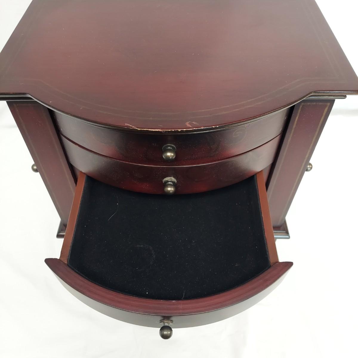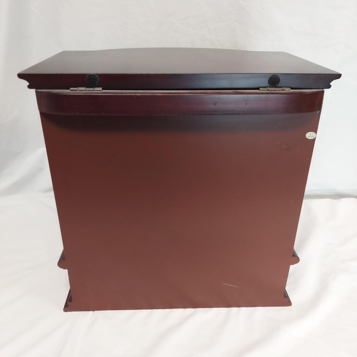 Large wooden jewelry box with five drawers, two necklace compartments and a ring tray. It measures approximately 15” x 11” x 15"H. Some of the handles are loose. Some scuffs to finish. Please see photos for details.