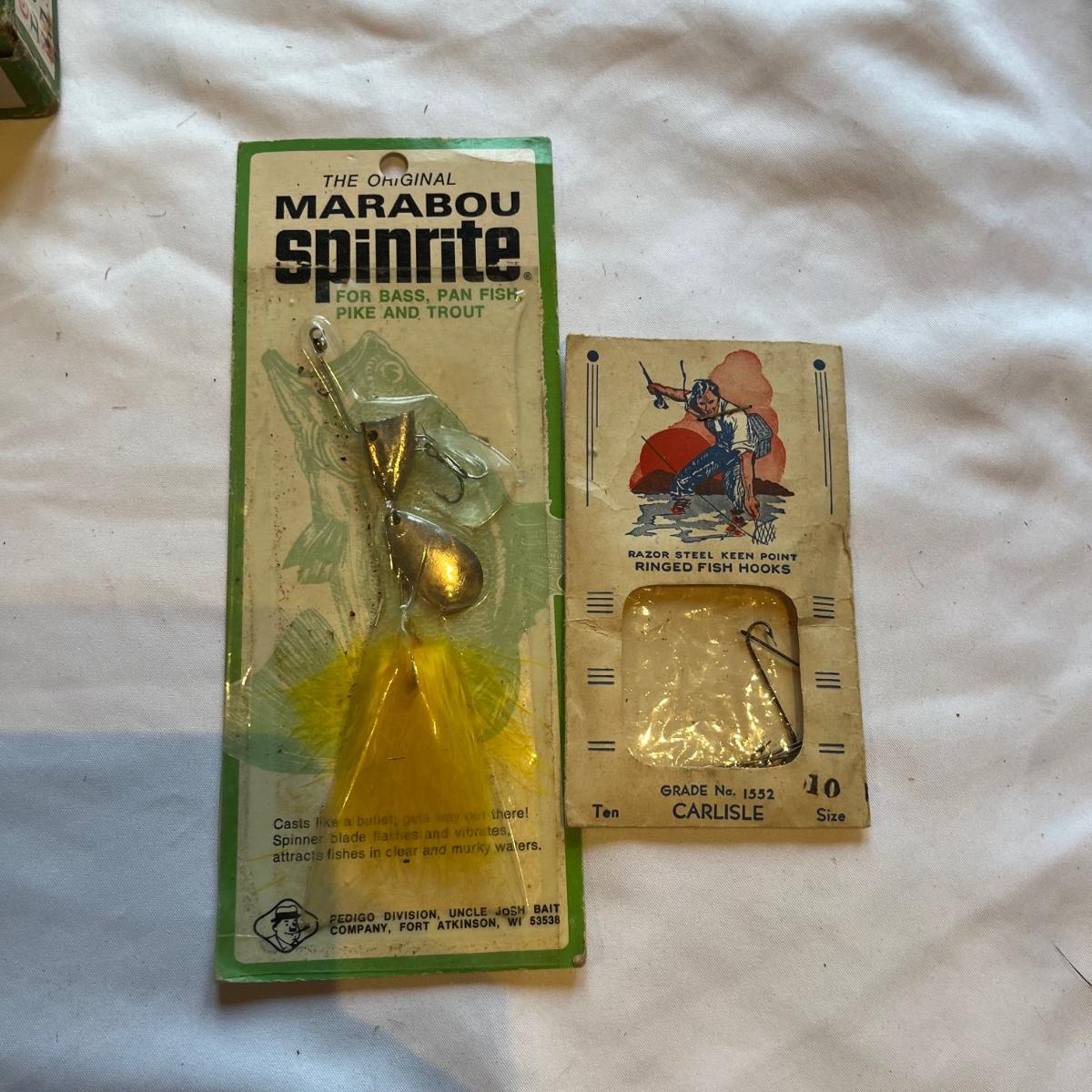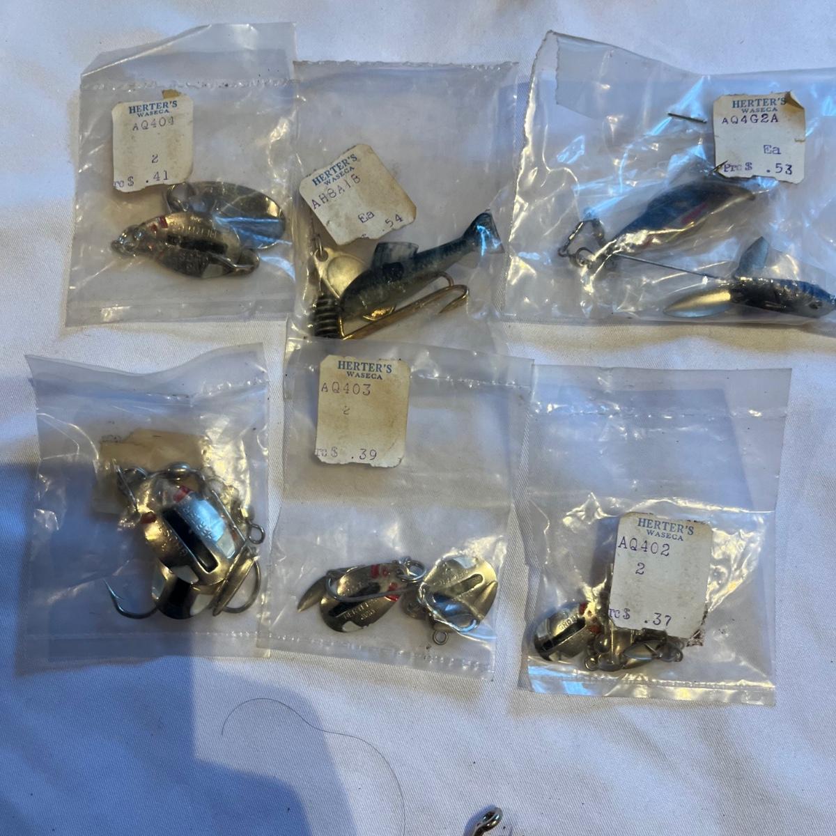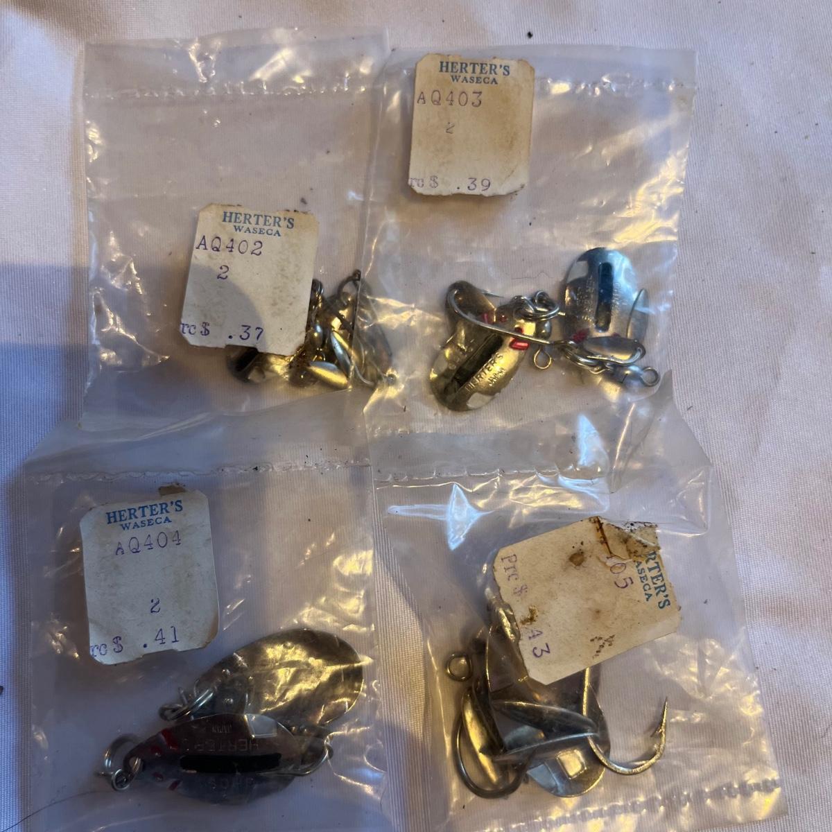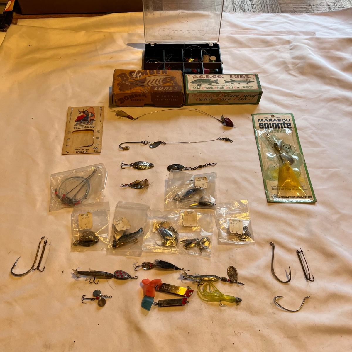 Lot includes eight Ghost Herter spinning lures, bomber lure in box, C.C.B.CO. lure in box, South Bend lure, Marabou Spinrite lure in new packaging, Prescott spinner and more.