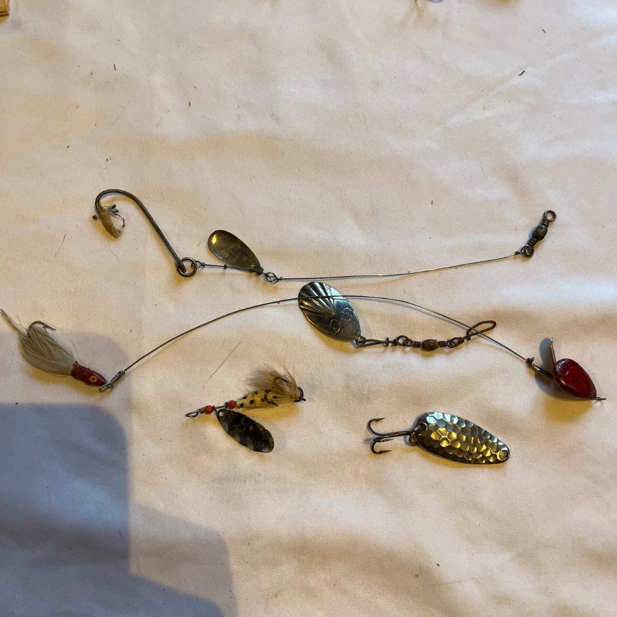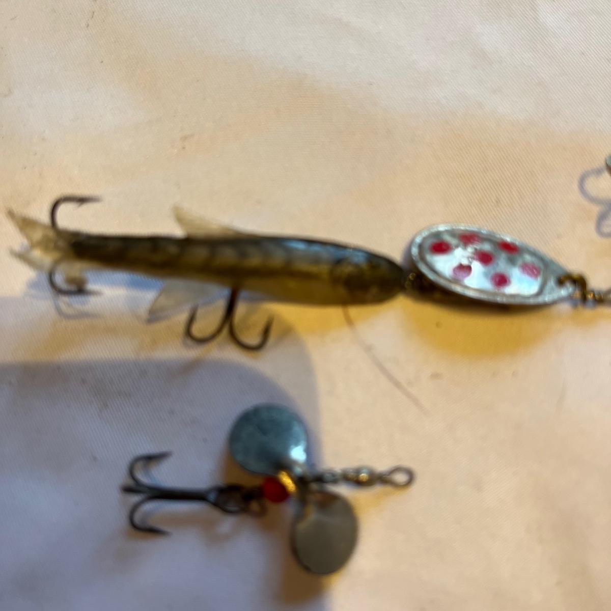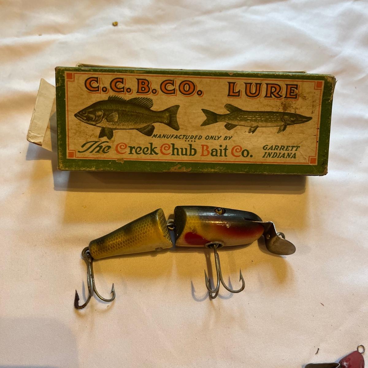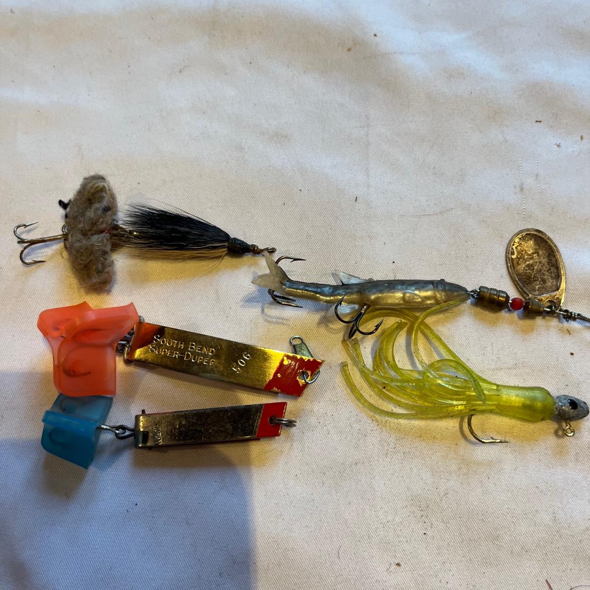 Lot includes eight Ghost Herter spinning lures, bomber lure in box, C.C.B.CO. lure in box, South Bend lure, Marabou Spinrite lure in new packaging, Prescott spinner and more.