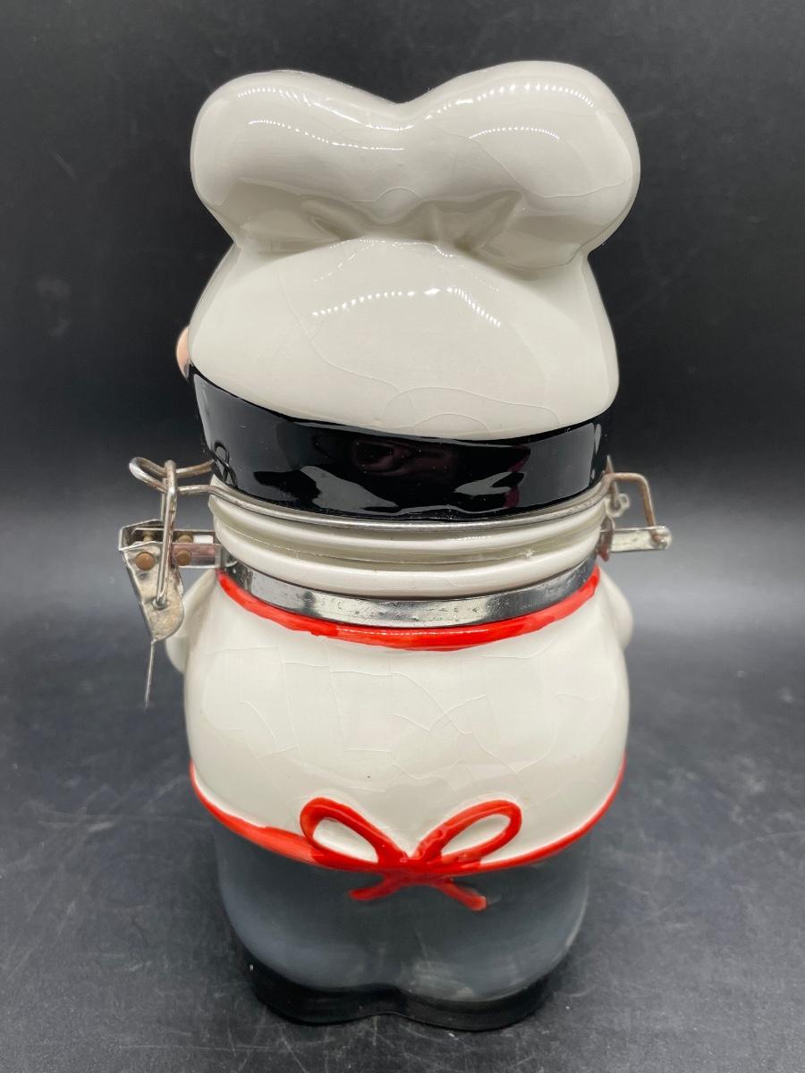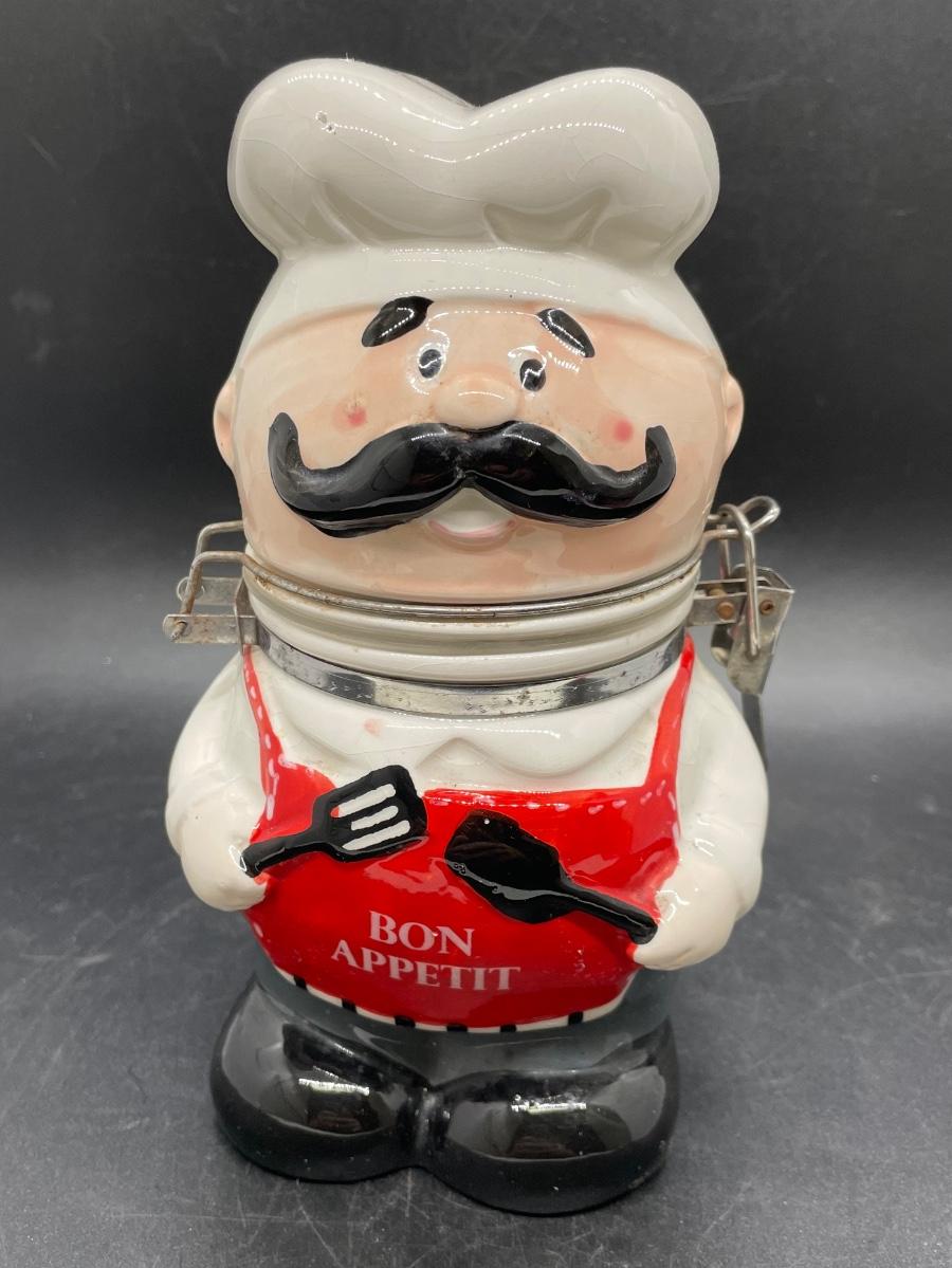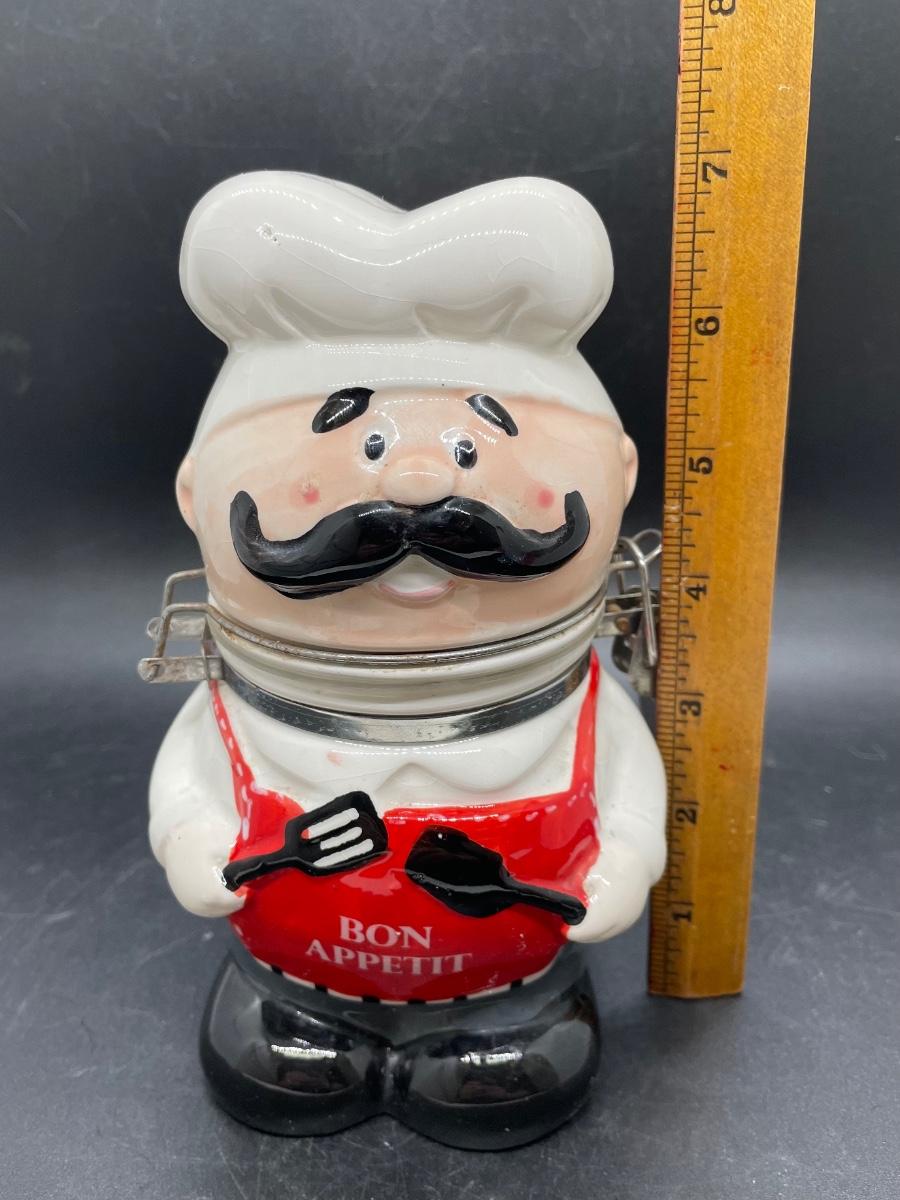 This item is in decent condition. There is some discoloration and crazing on the item. The front of the chefs apron reads: “Bon Appetit.” The jar is approximately 7” tall.