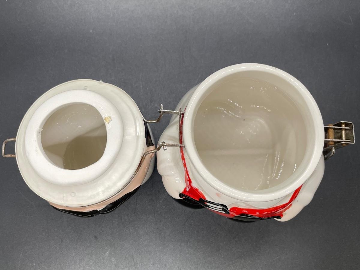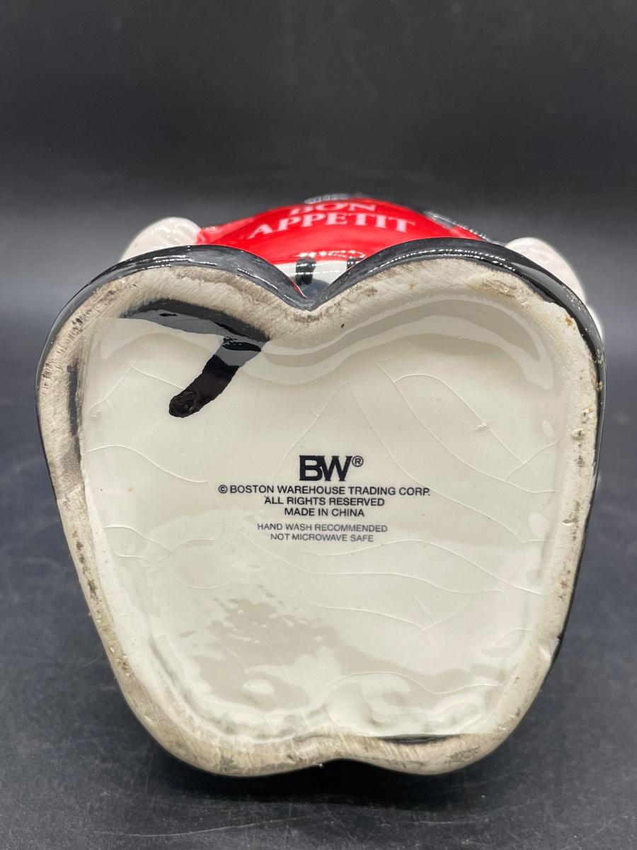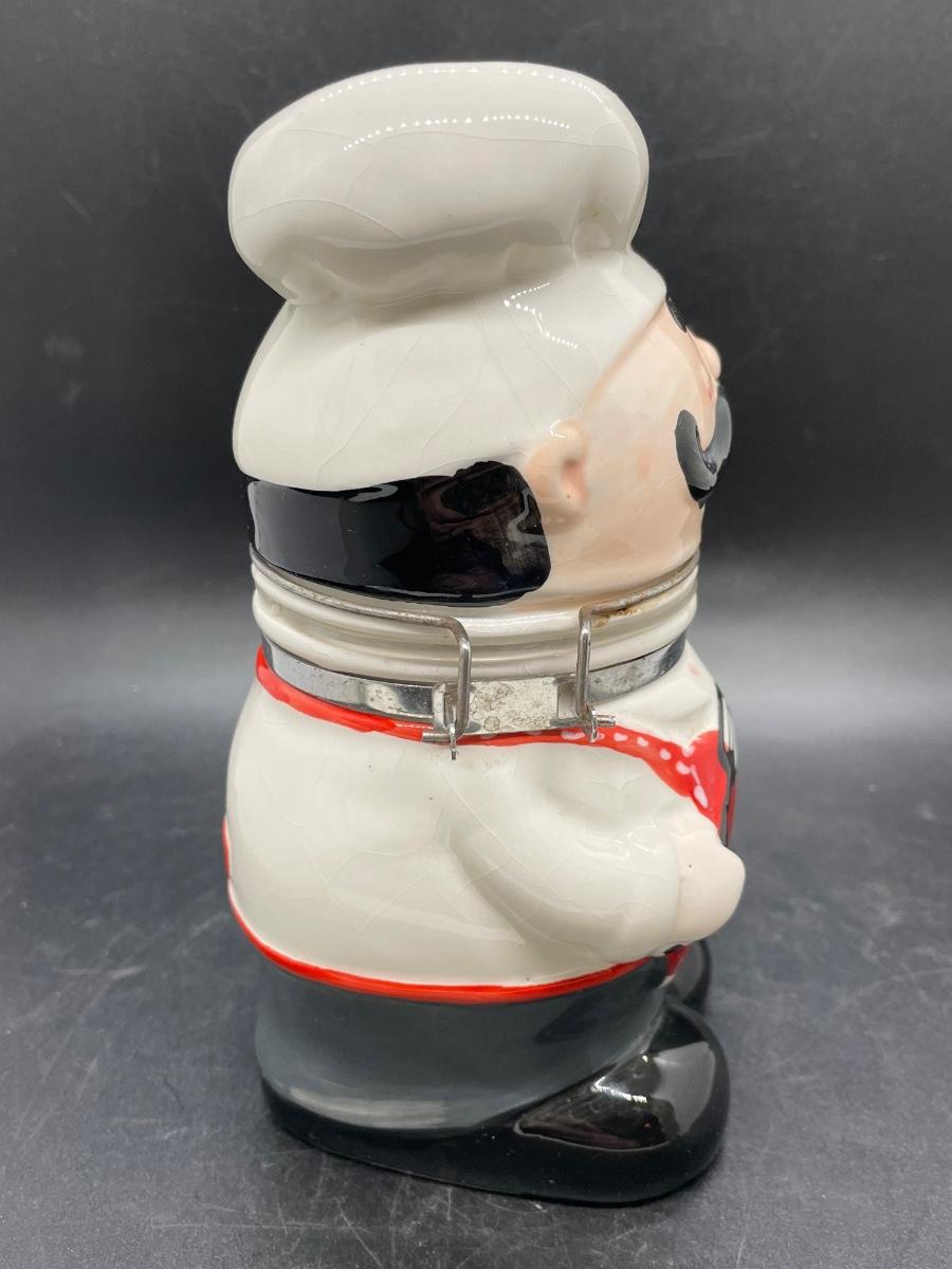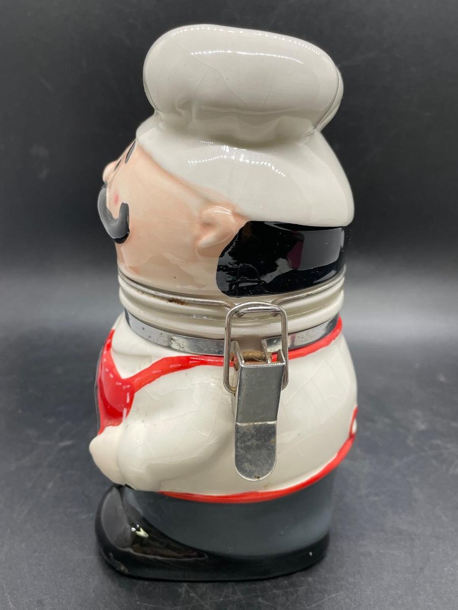 This item is in decent condition. There is some discoloration and crazing on the item. The front of the chefs apron reads: “Bon Appetit.” The jar is approximately 7” tall.