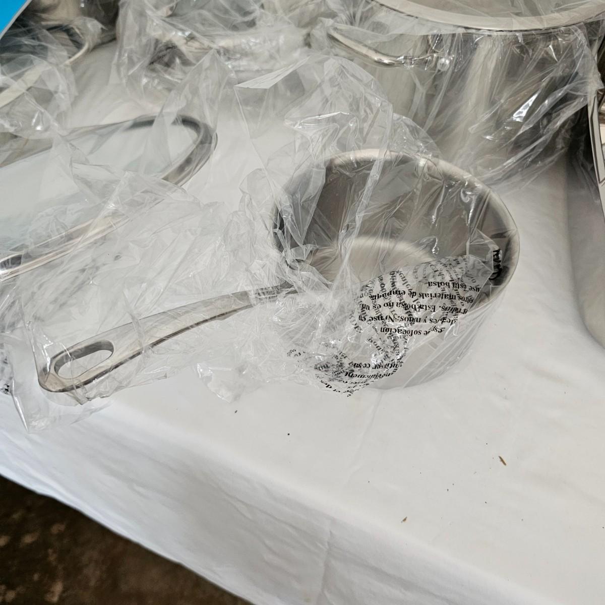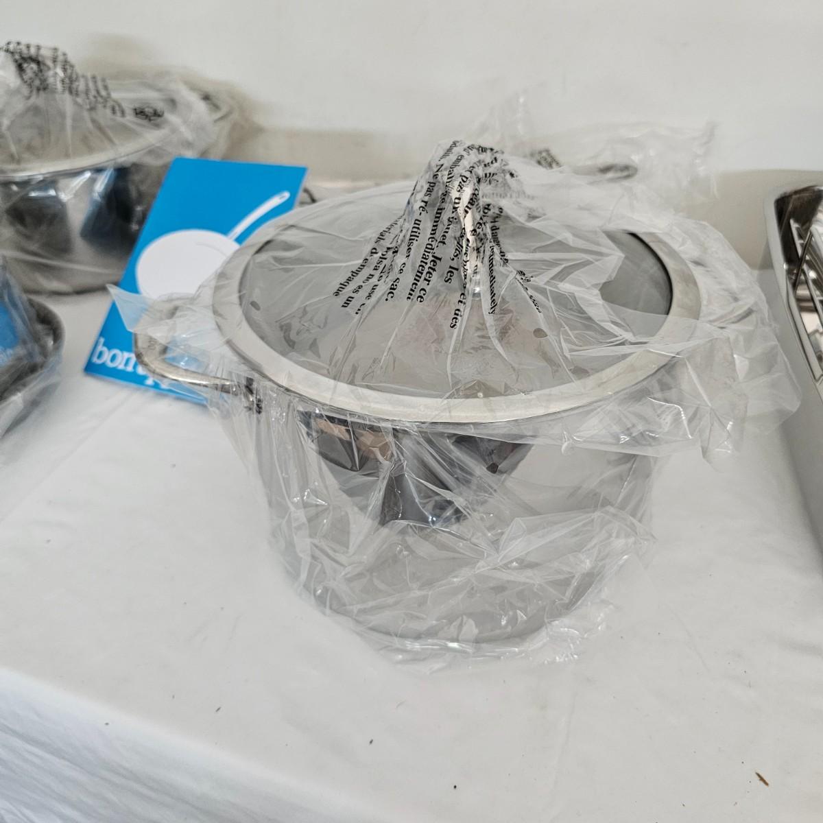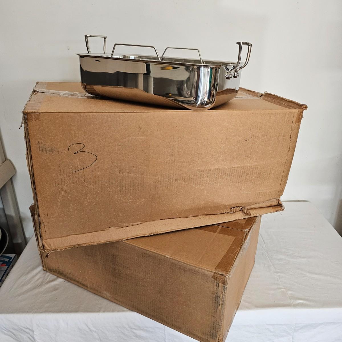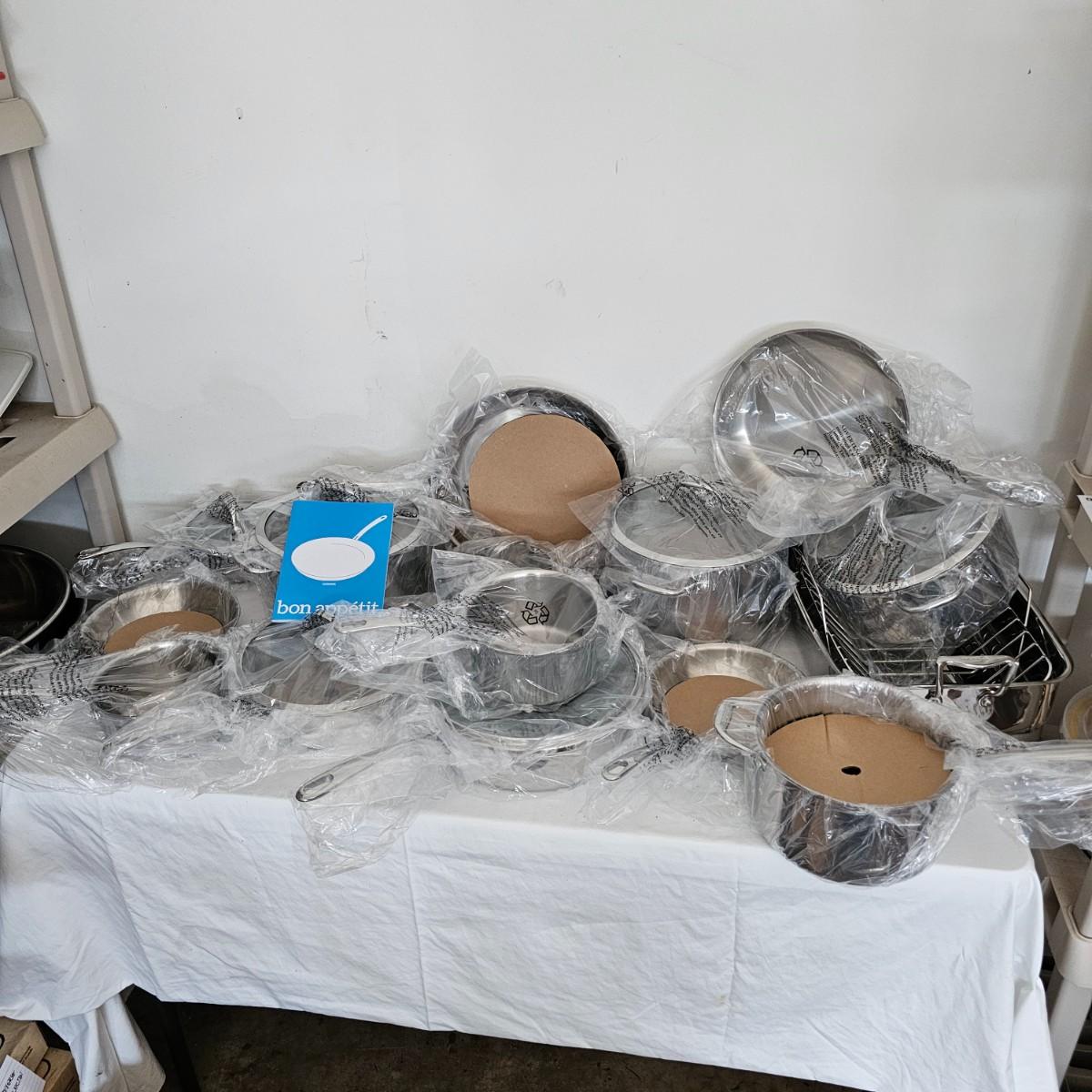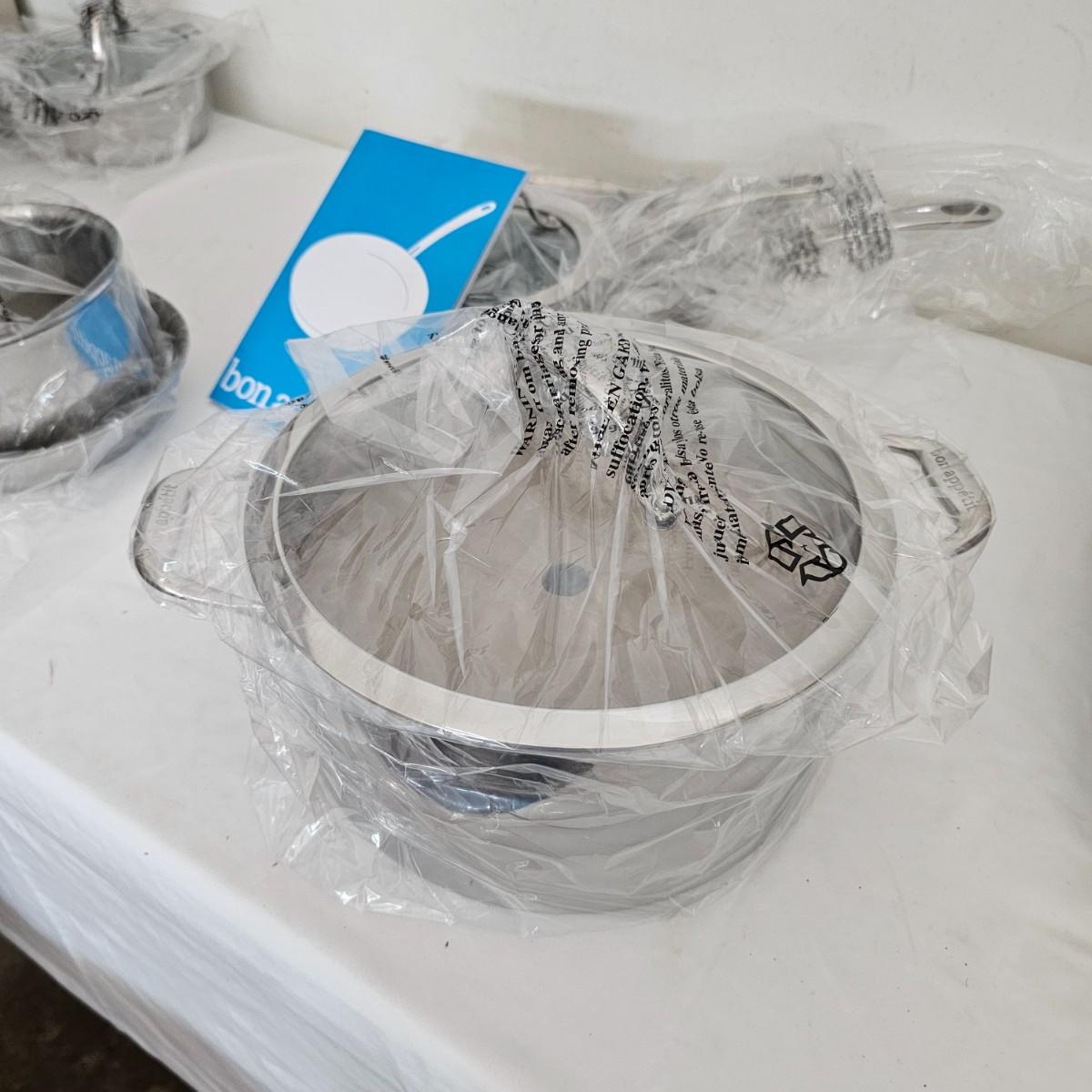 A brand new in box set of Bon Appetit stainless Clad Cookware plus one Lagostina stainless pan with lift tray. Boxes set contains 15 pieces, assorted pots, pans and lids. Two quart, six quart, eight quart items. Eight, ten and twelve inch skillets and fry pans. All glass lids have handles. Lagostina pan measures 18" x 12" x 6"H. See photos for details. Local pickup only.