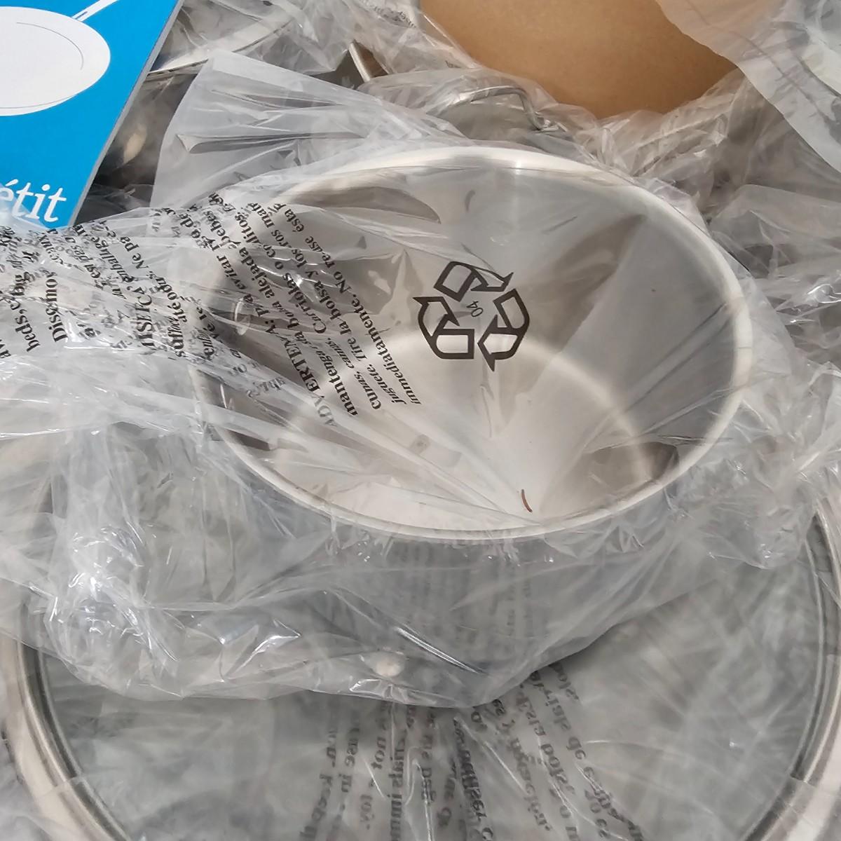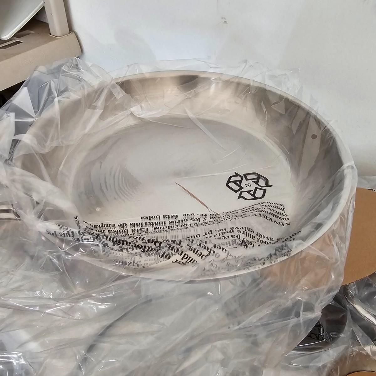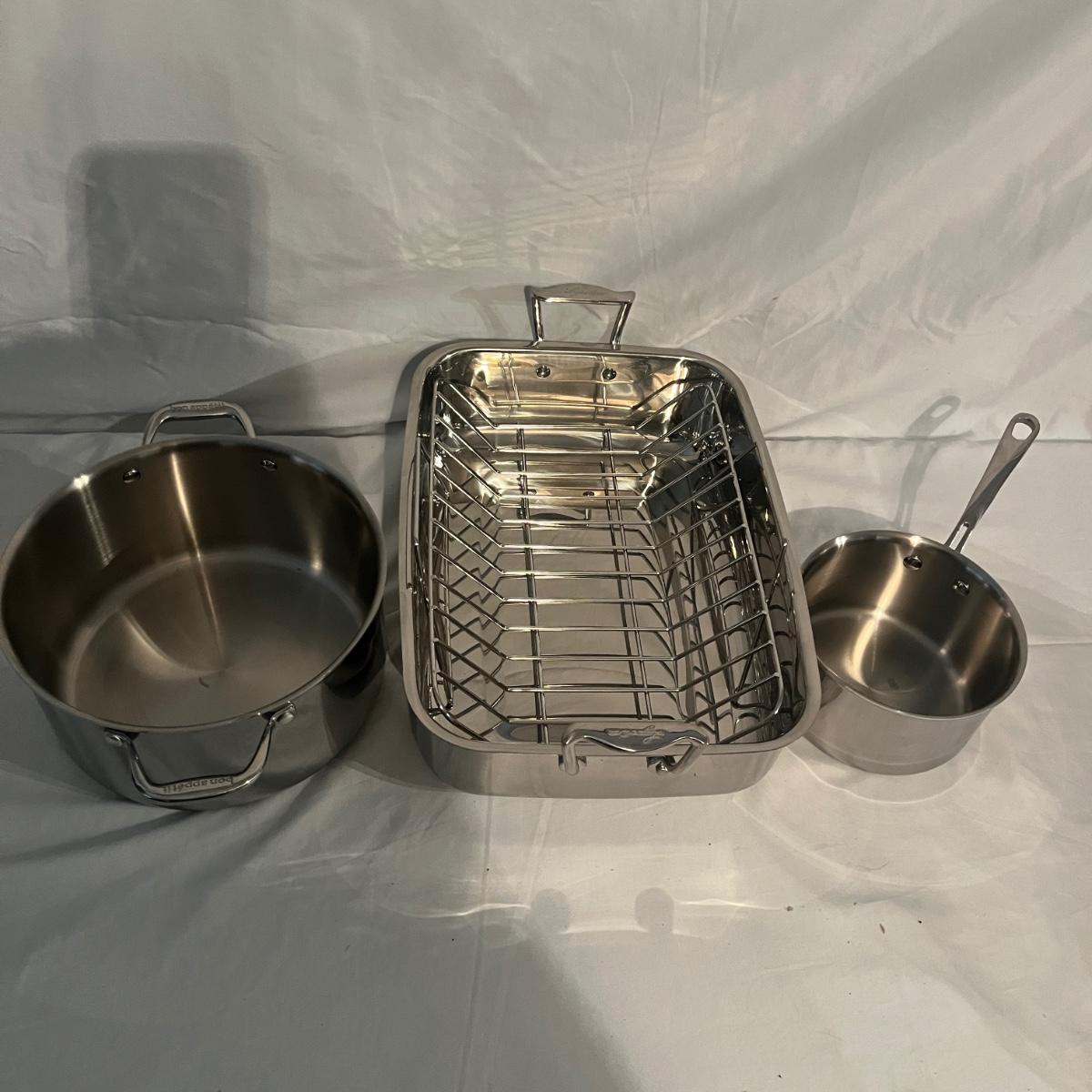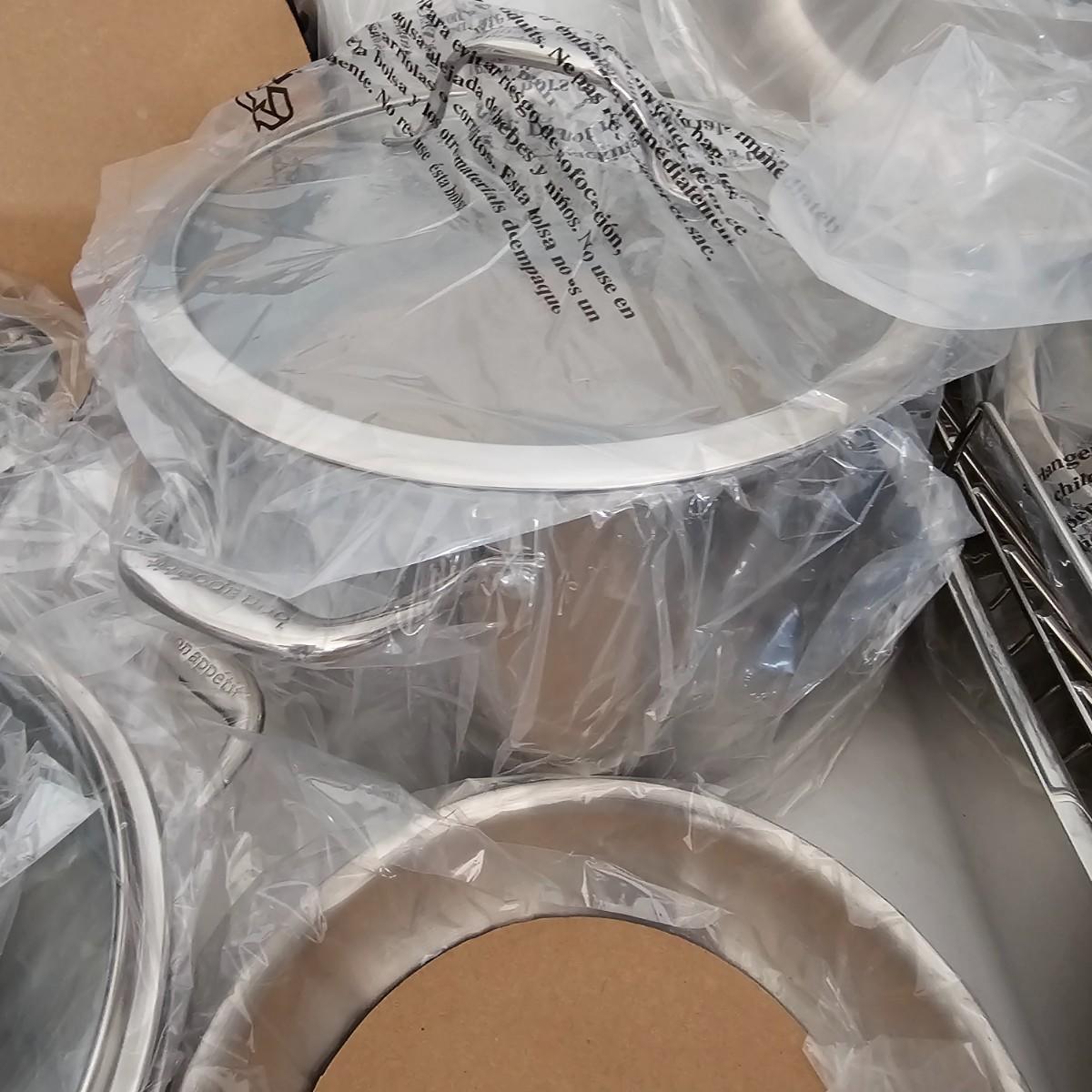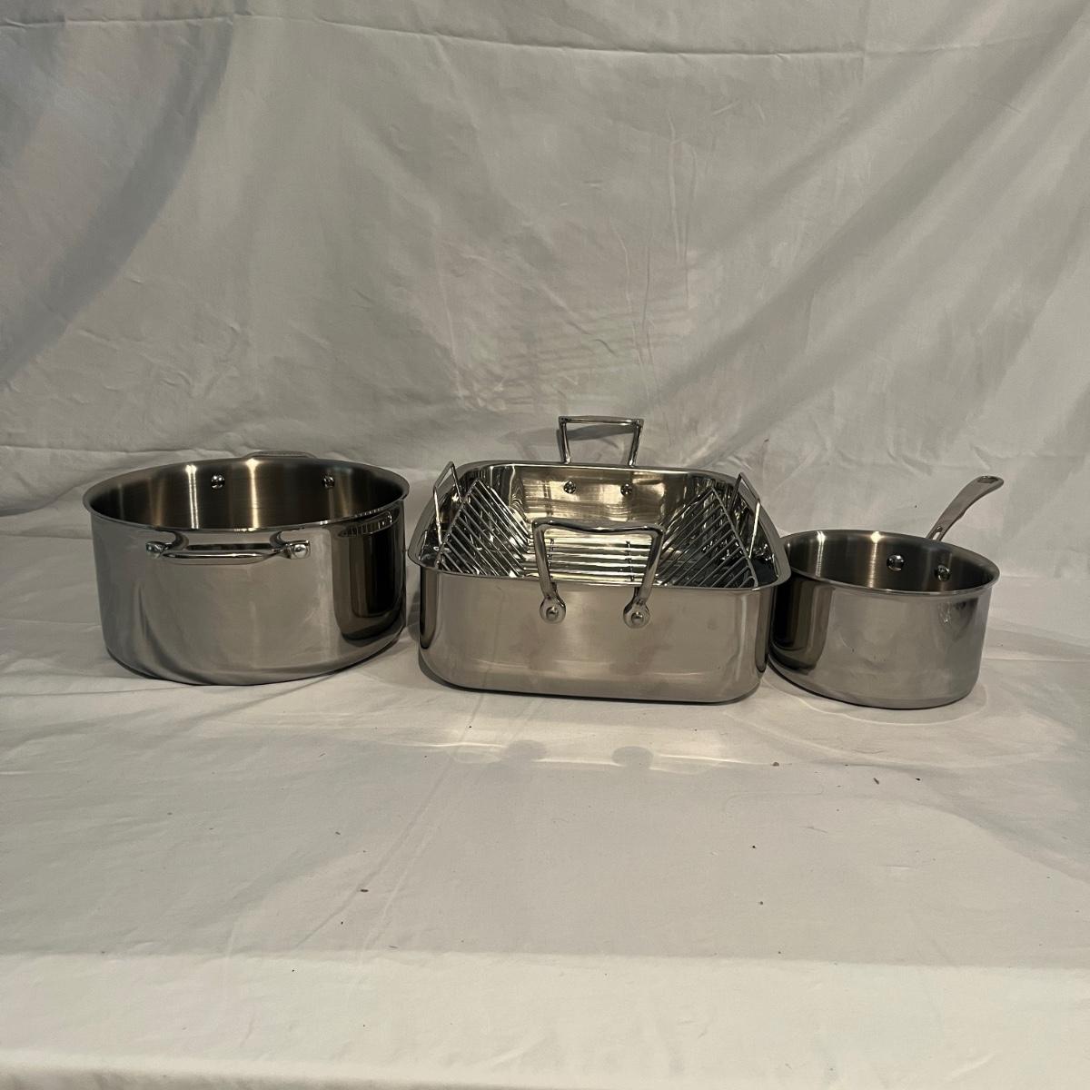 A brand new in box set of Bon Appetit stainless Clad Cookware plus one Lagostina stainless pan with lift tray. Boxes set contains 15 pieces, assorted pots, pans and lids. Two quart, six quart, eight quart items. Eight, ten and twelve inch skillets and fry pans. All glass lids have handles. Lagostina pan measures 18" x 12" x 6"H. See photos for details. Local pickup only.